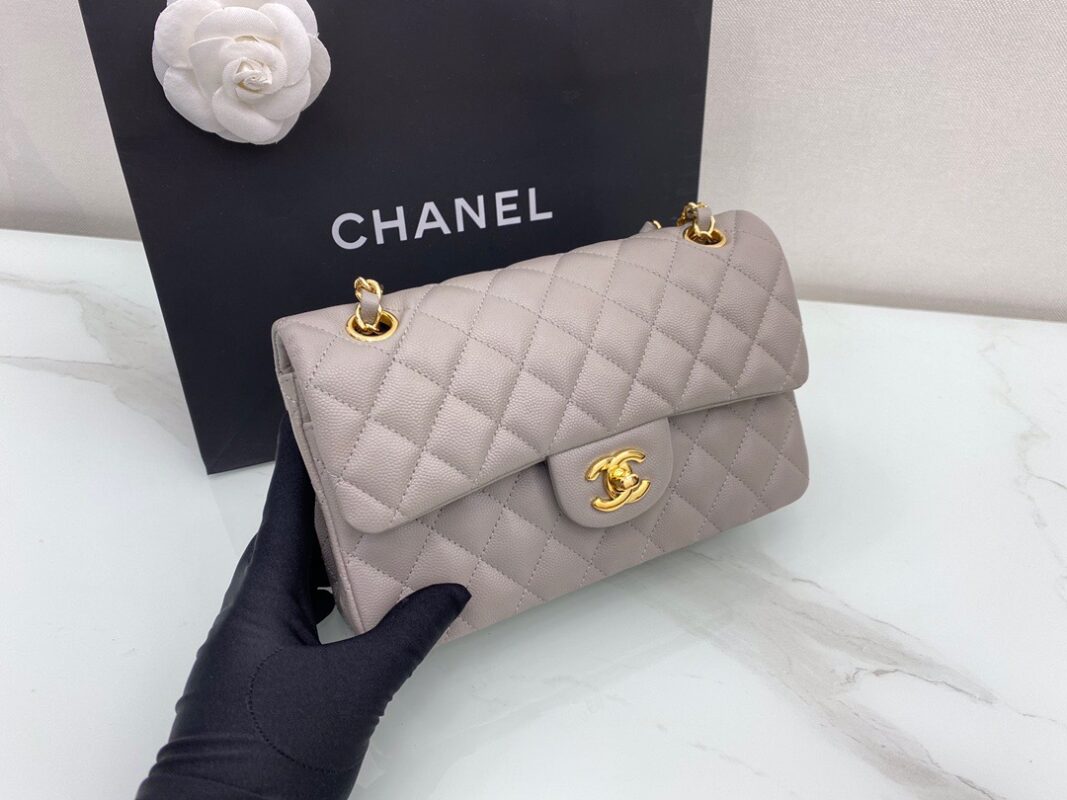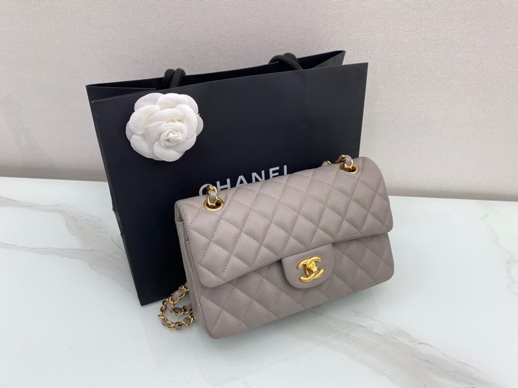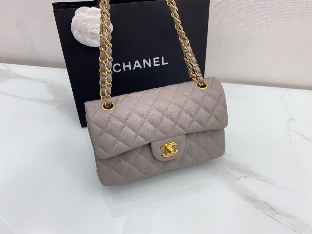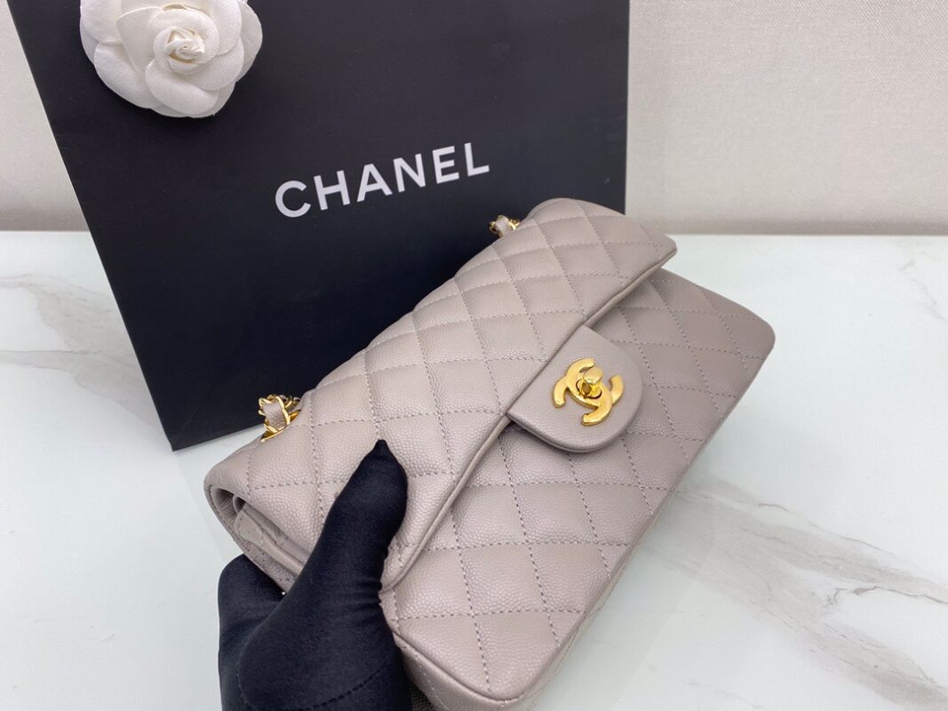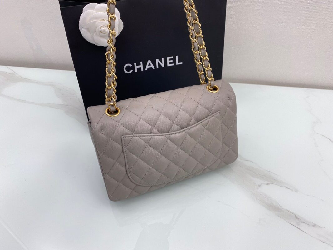 Chanel Classic FlapCaflskin caviar leather. Full copper hardware. Gray. Gold Buckle 23cm