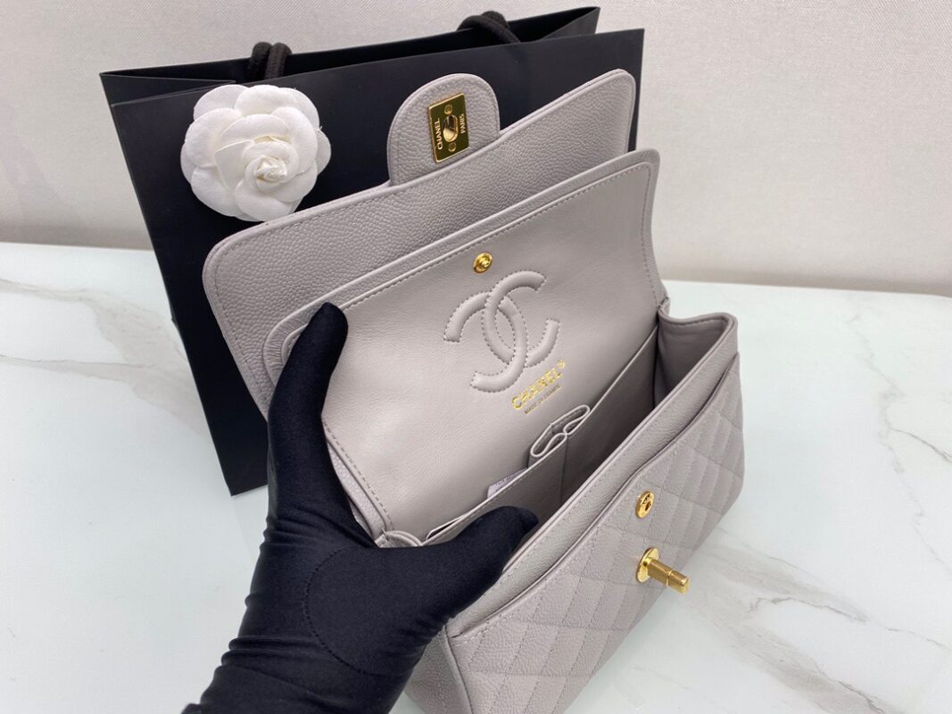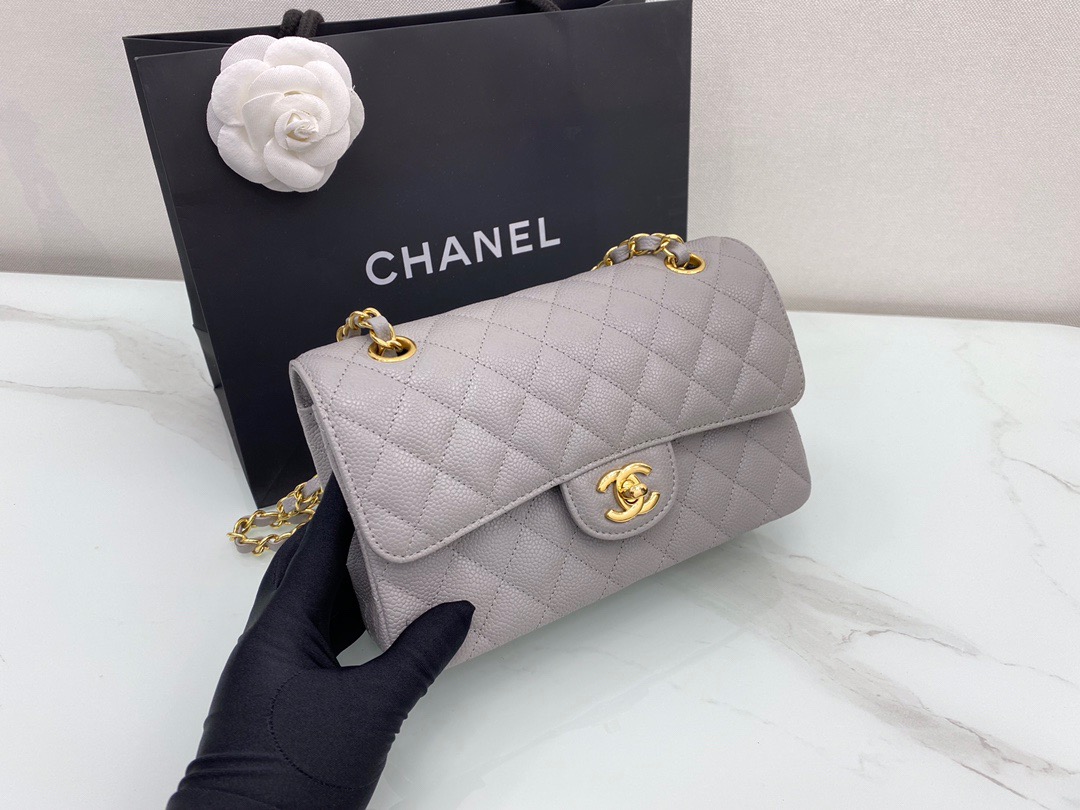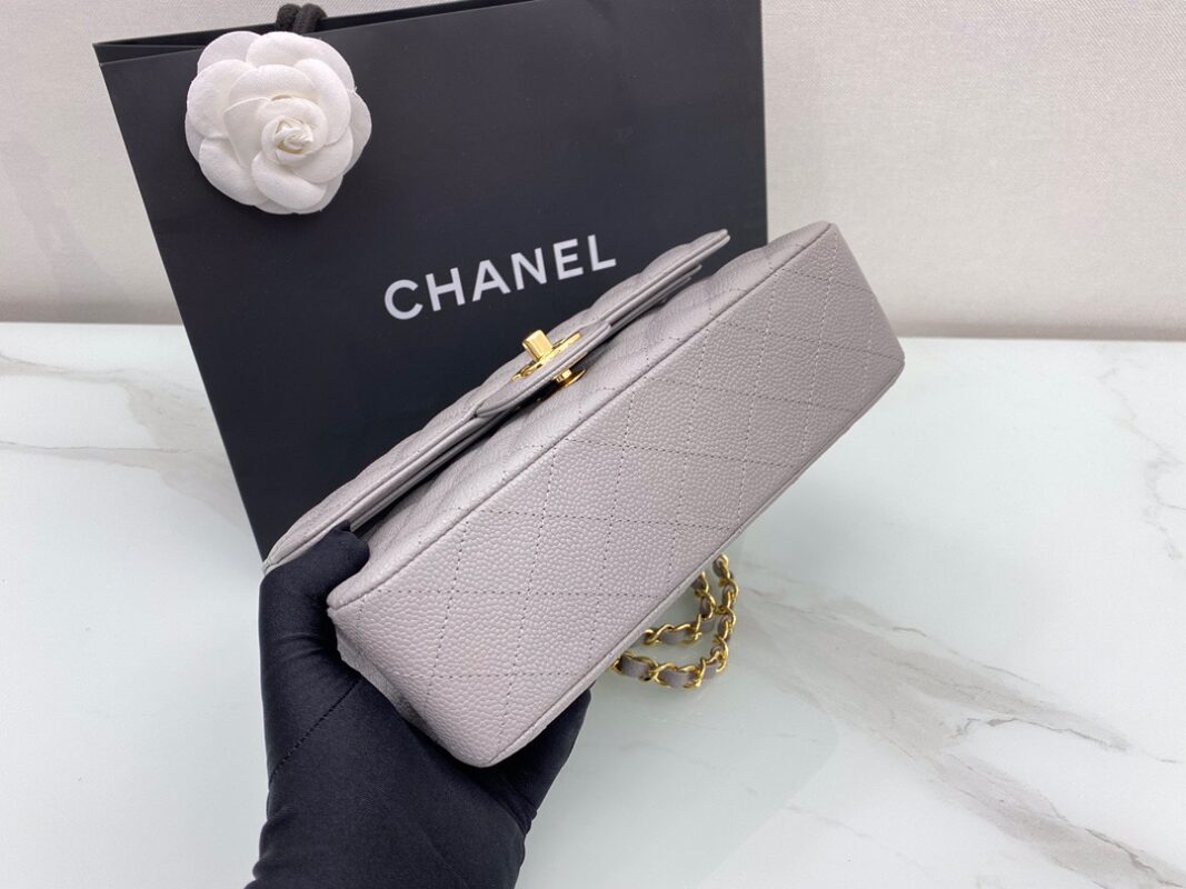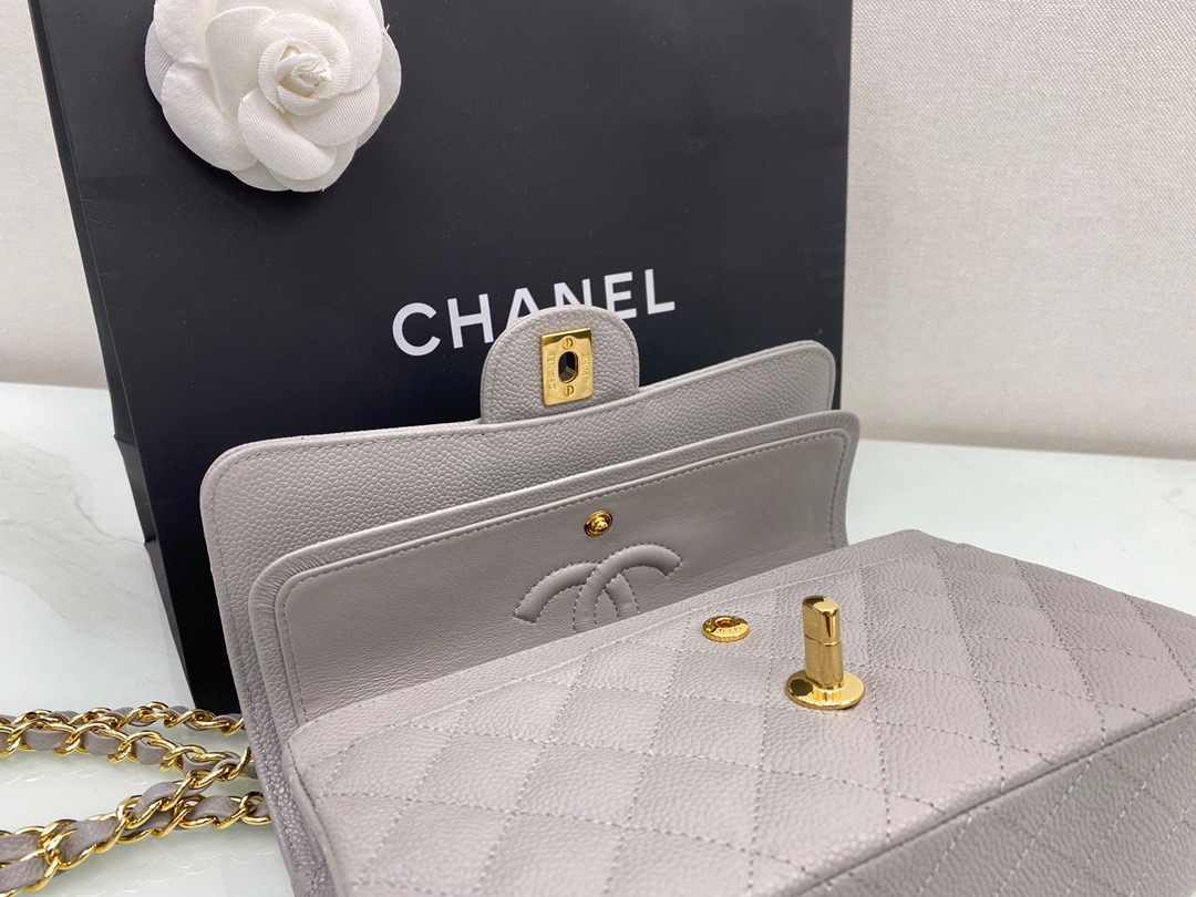 Chanel Classic FlapCaflskin caviar leather. Full copper hardware. Premium Grey. Gold Buckle 23cm