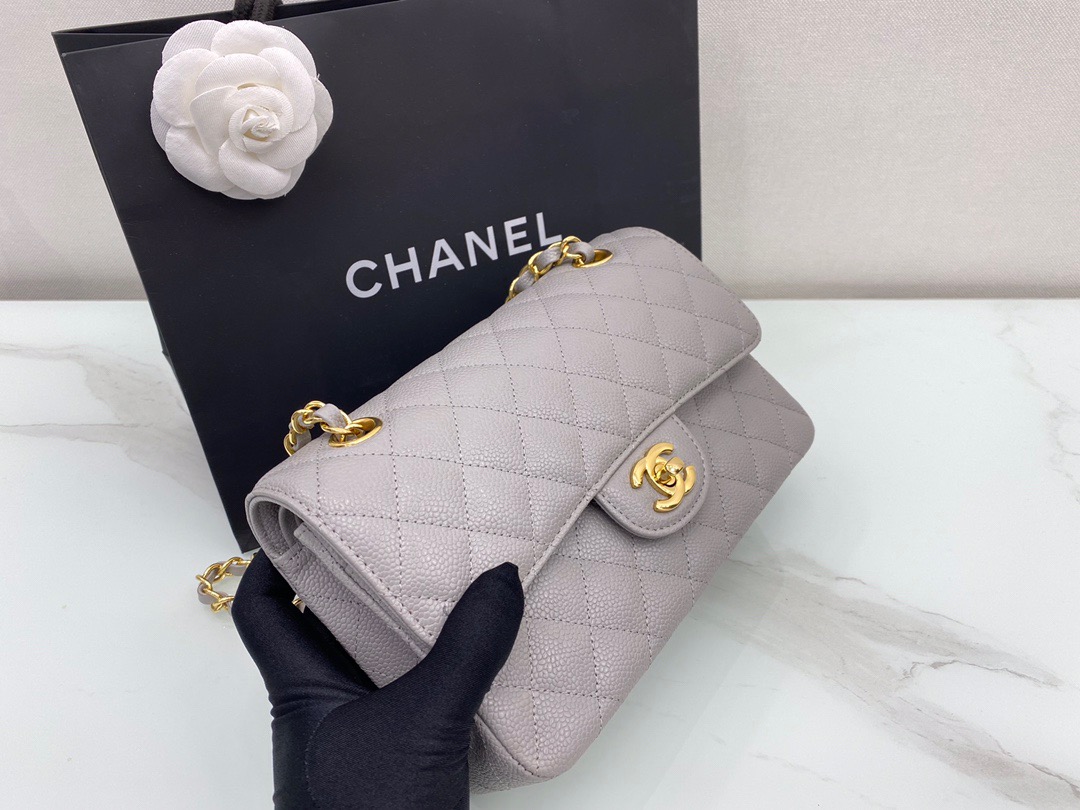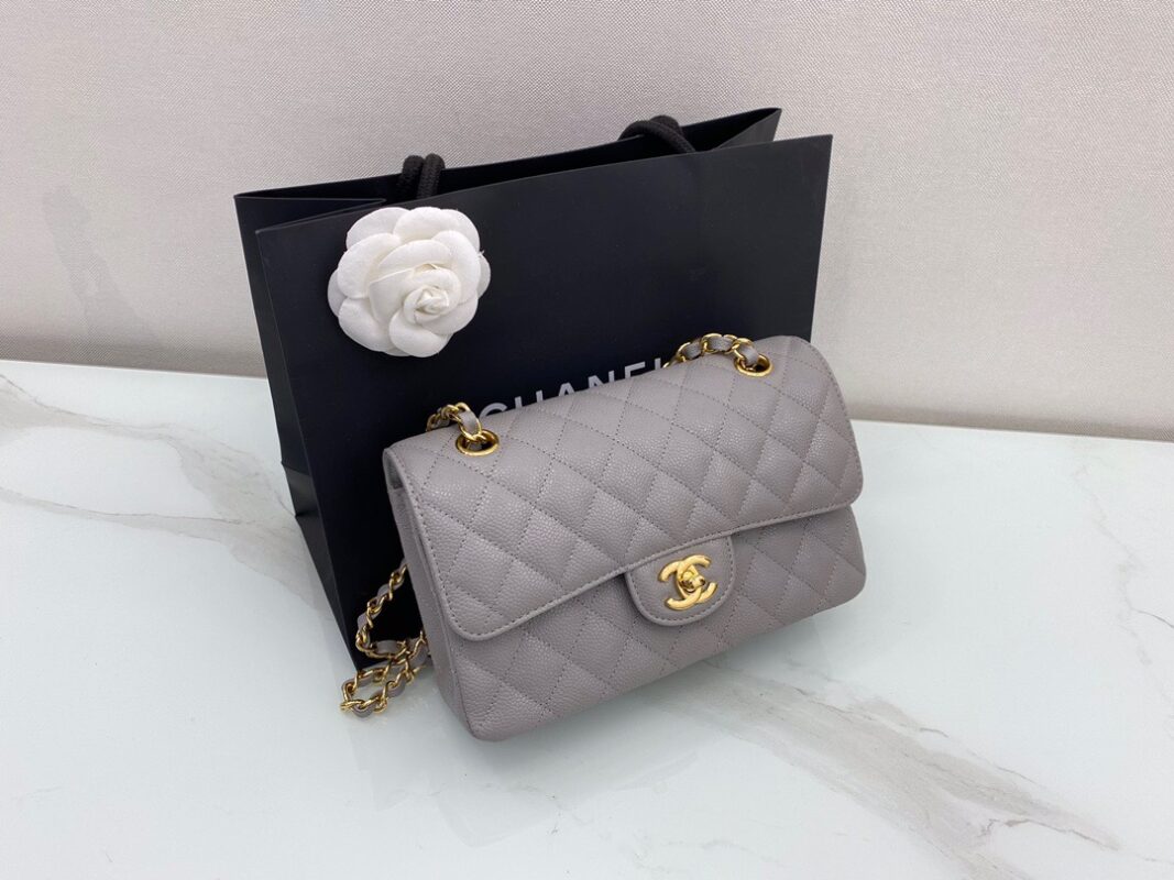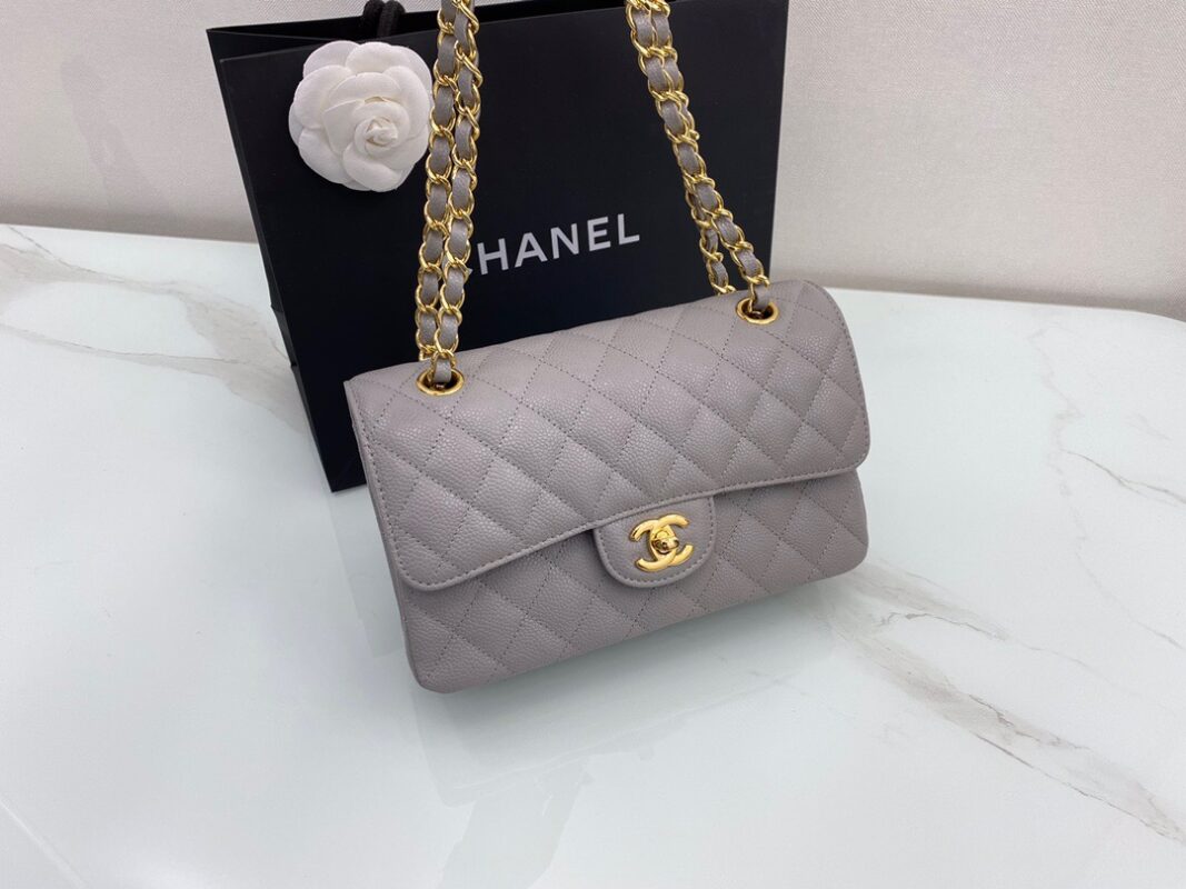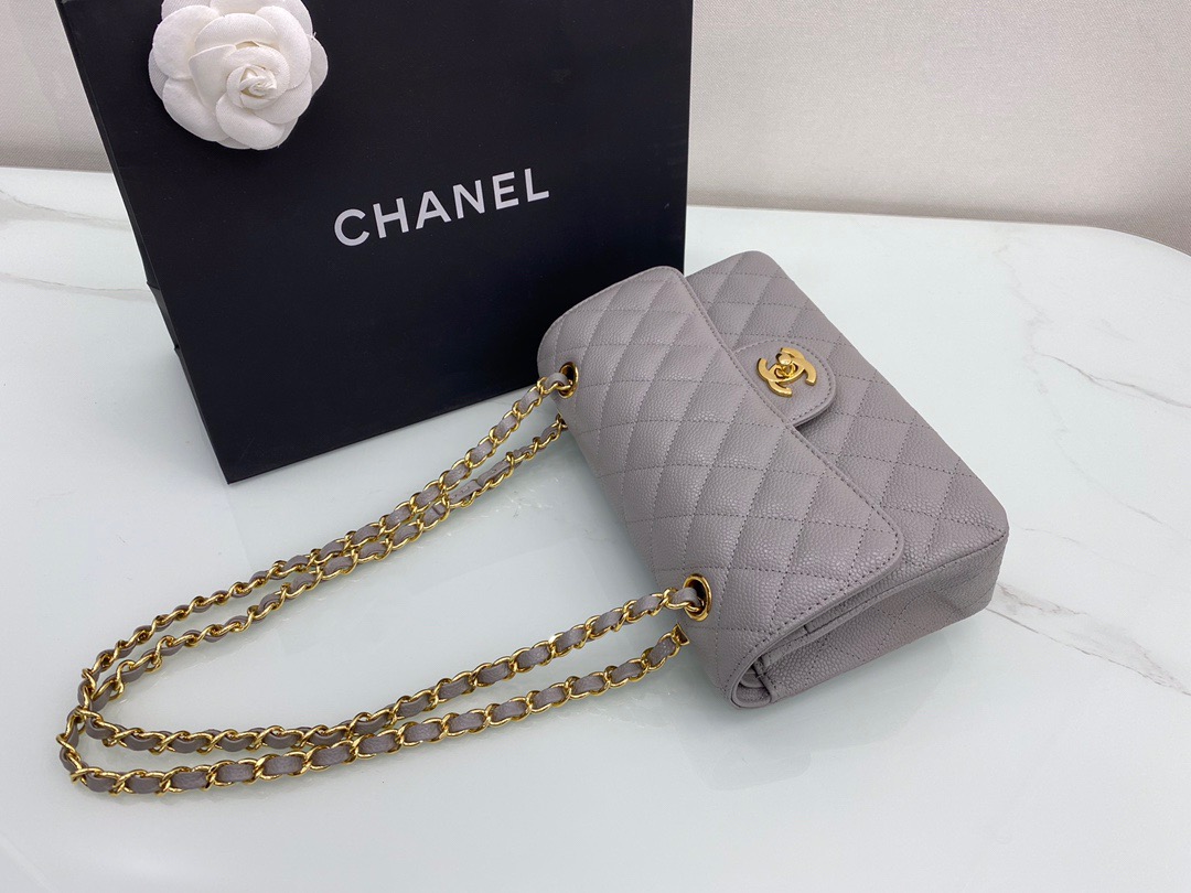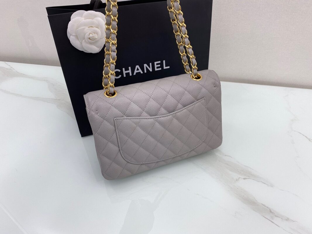 Chanel Classic FlapCaflskin caviar leather. Full copper hardware. Premium Grey. Gold Buckle 23cm