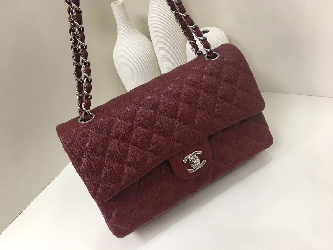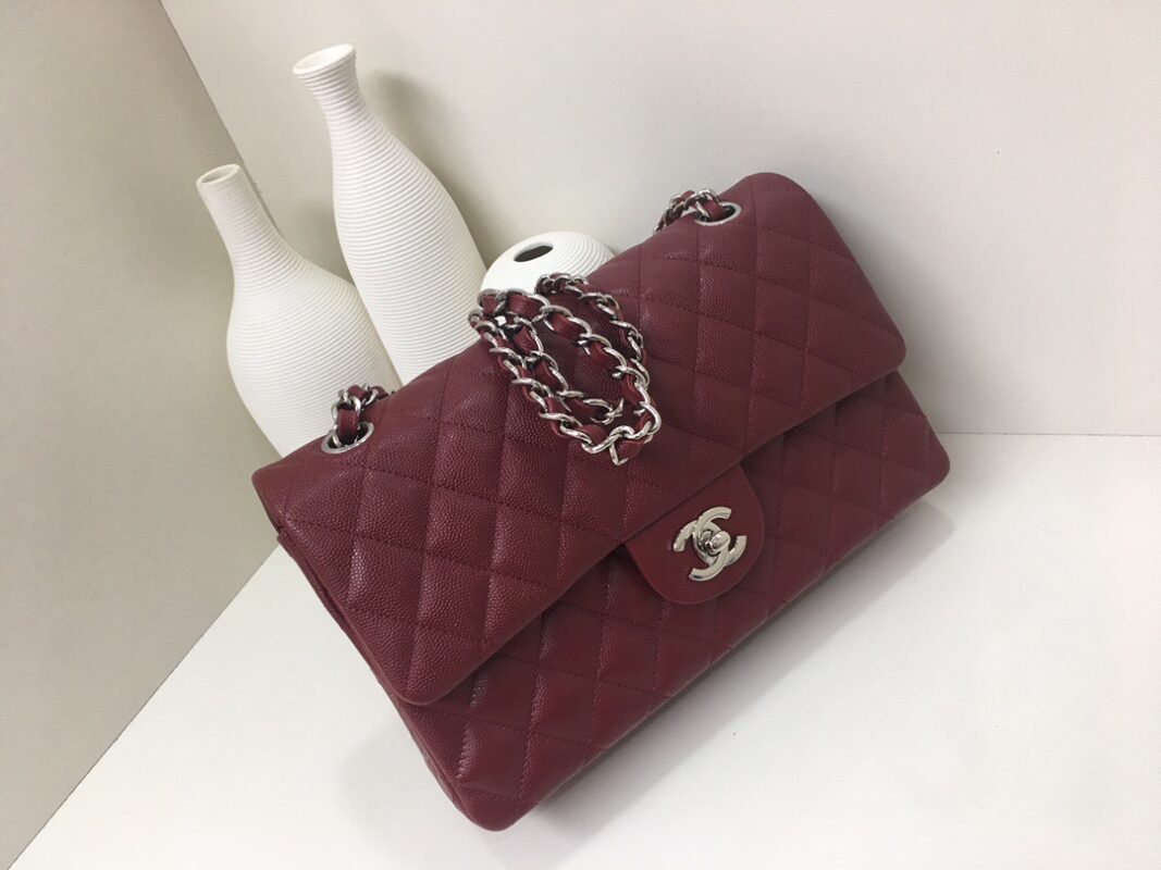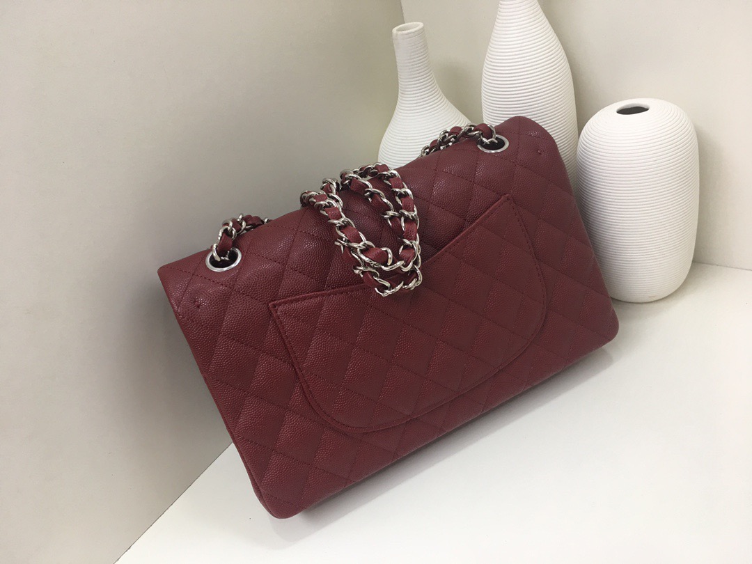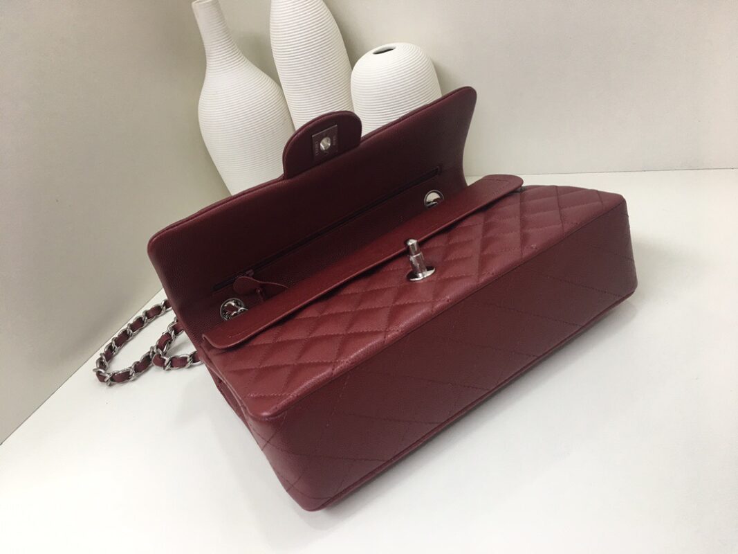 Chanel Classic Flap Calfskin fine grained ball grain. Full copper hardware. Medium. Burgundy. Silver Buckle 25cm