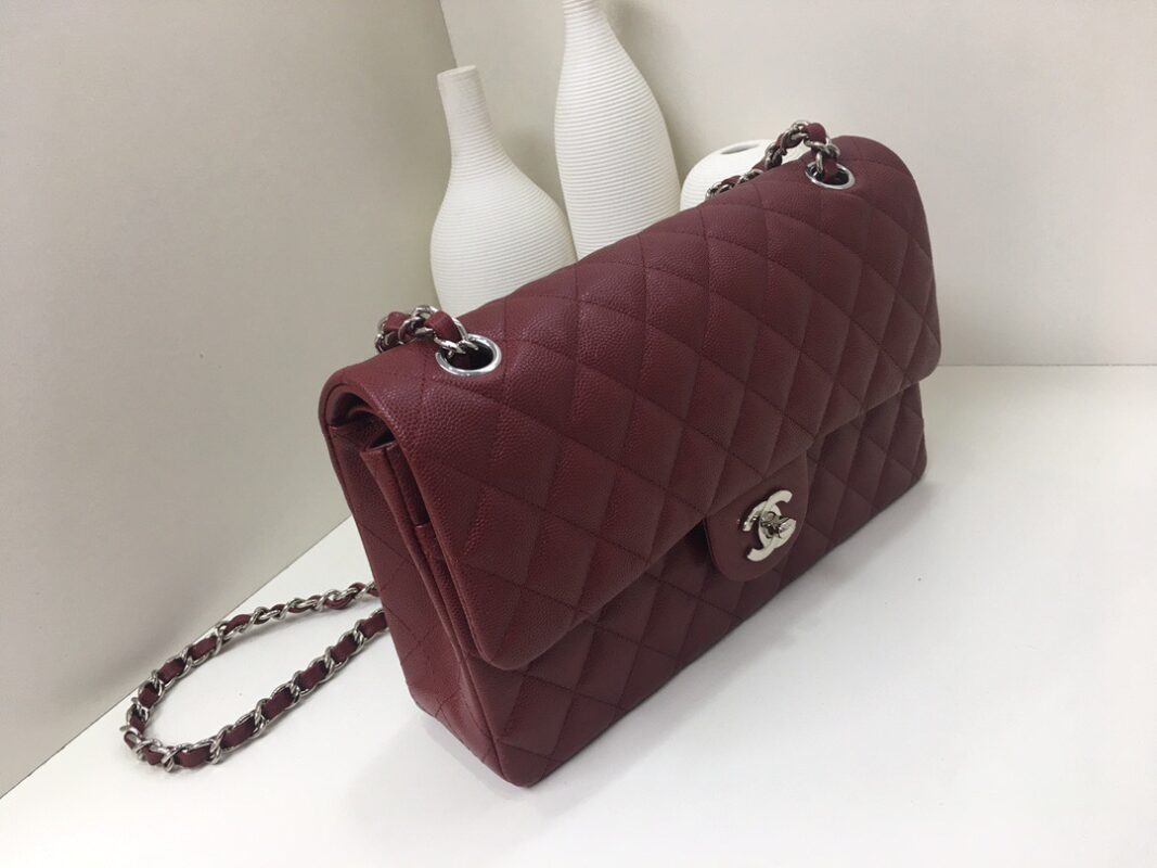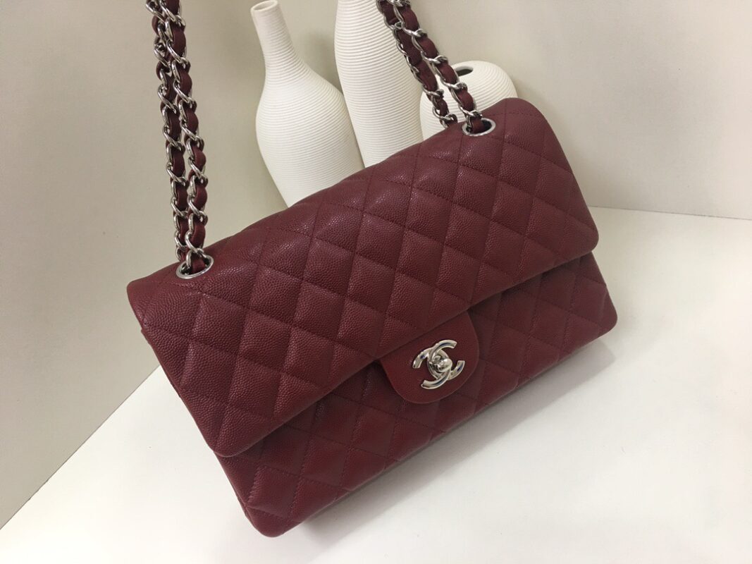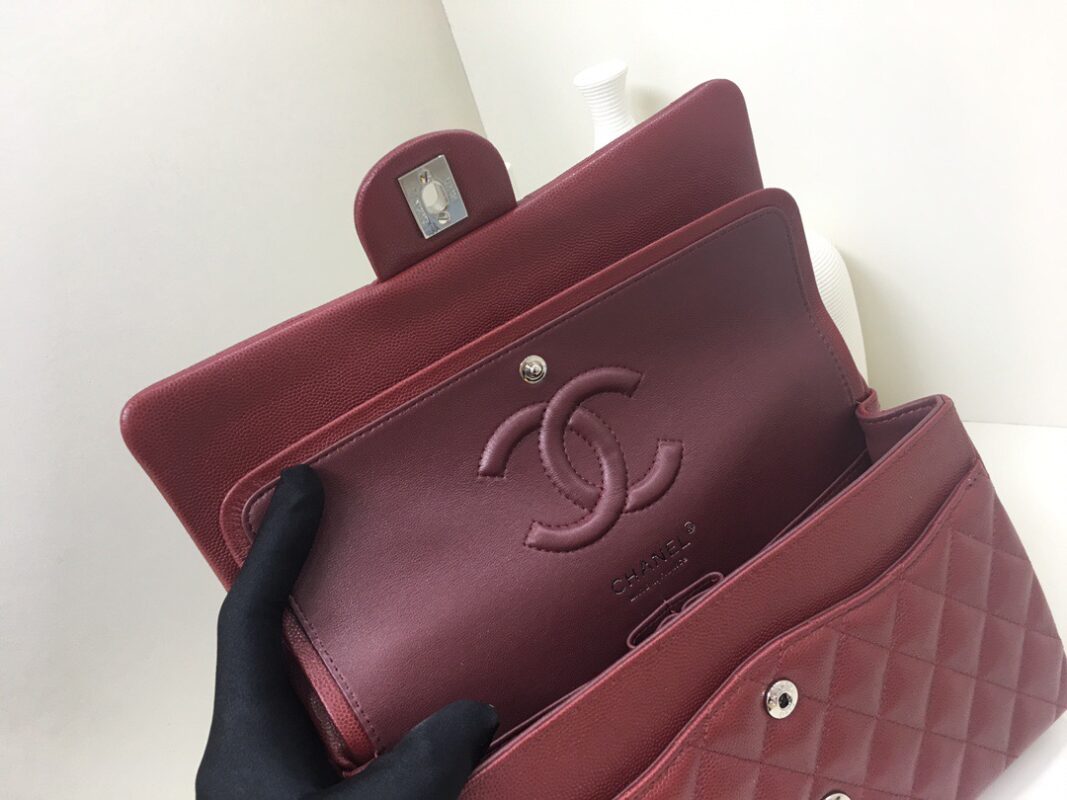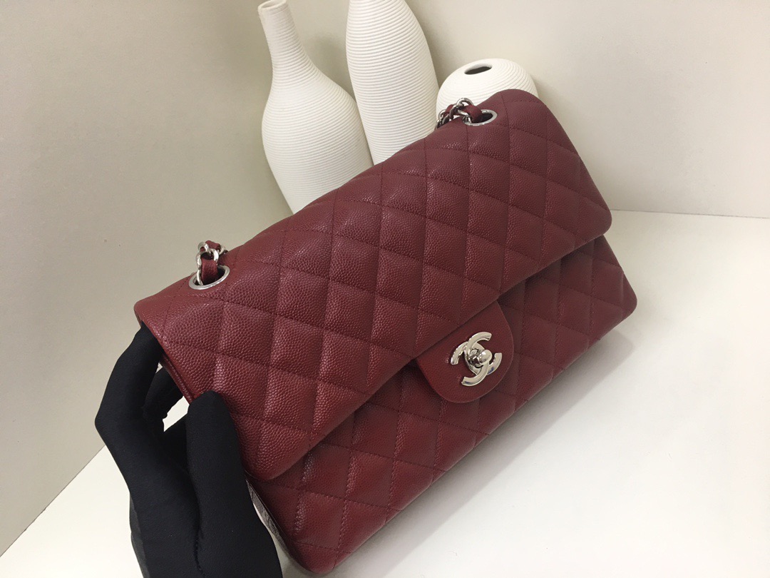 Chanel Classic Flap Calfskin fine grained ball grain. Full copper hardware. Medium. Burgundy. Silver Buckle 25cm