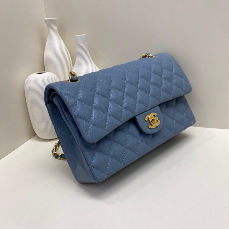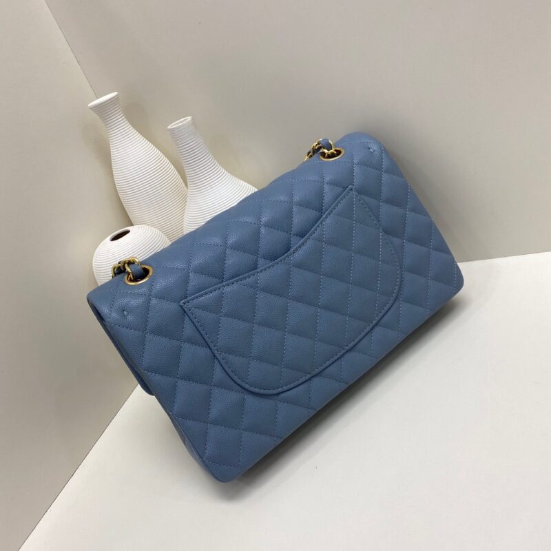 Chanel Classic Flap Caviar leather. All copper hardware. Denim Blue. Gold Buckle 25cm