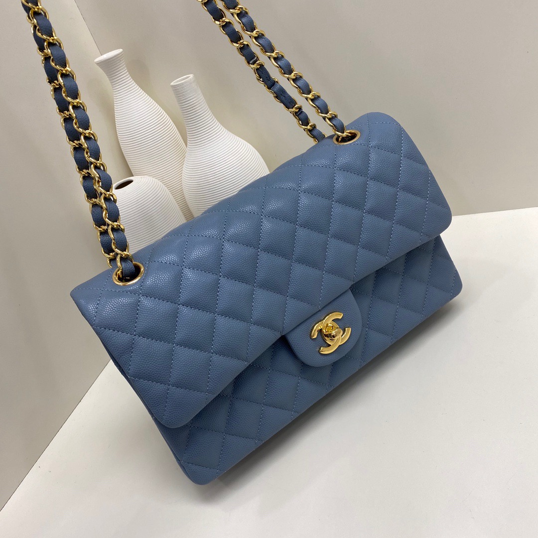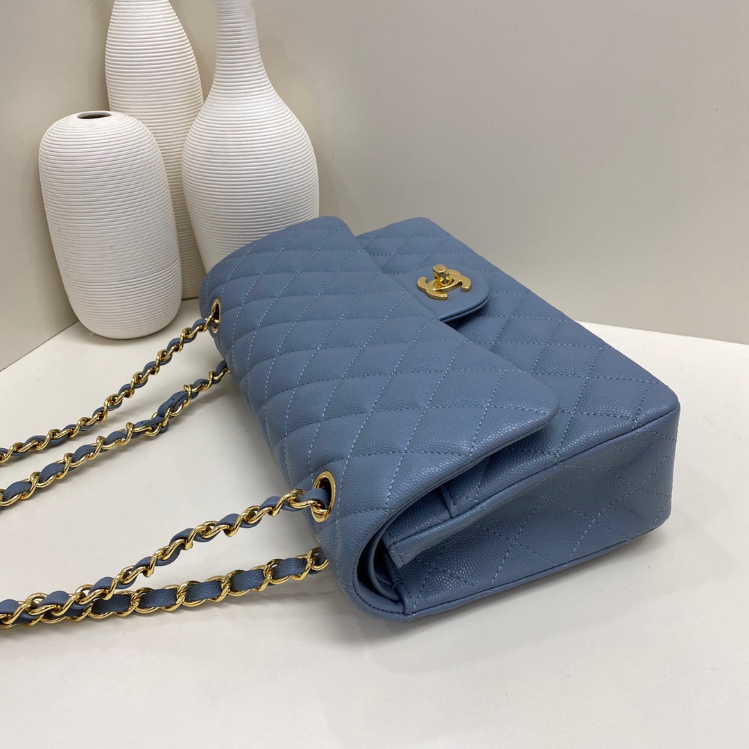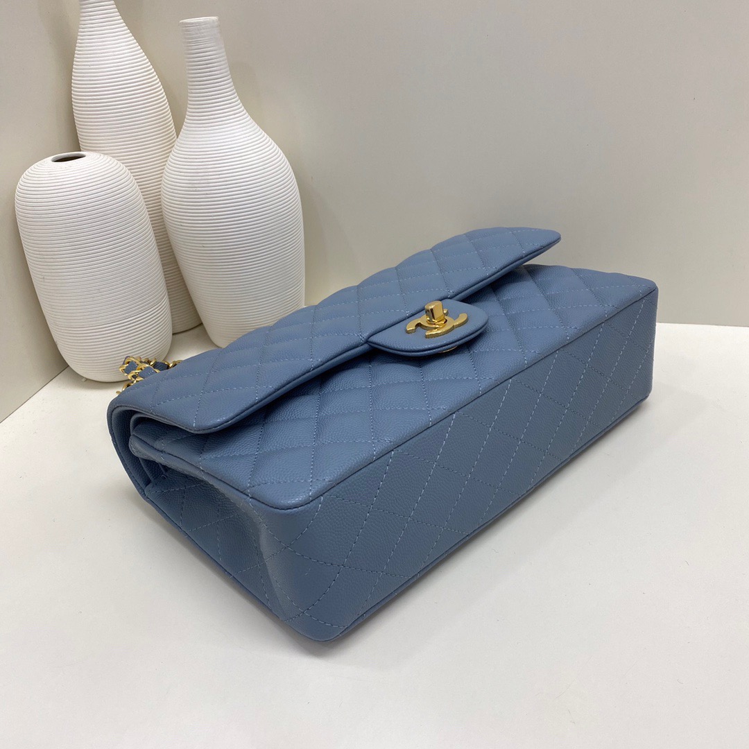 Chanel Classic Flap Caviar leather. All copper hardware. Denim Blue. Gold Buckle 25cm