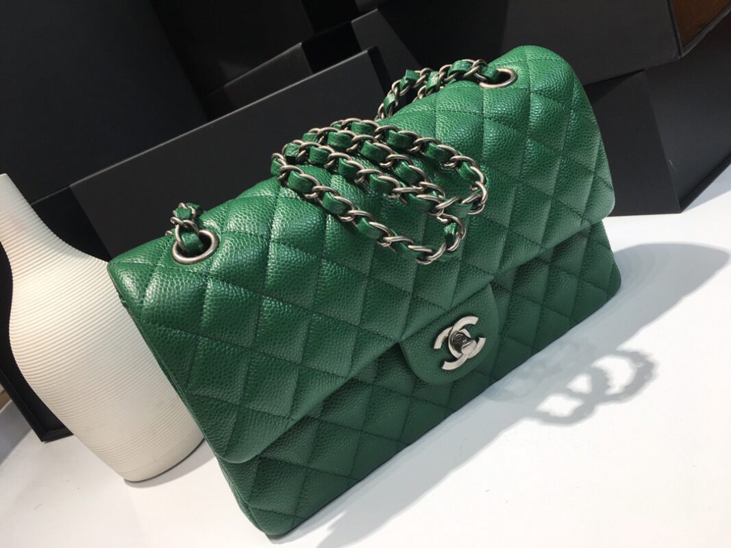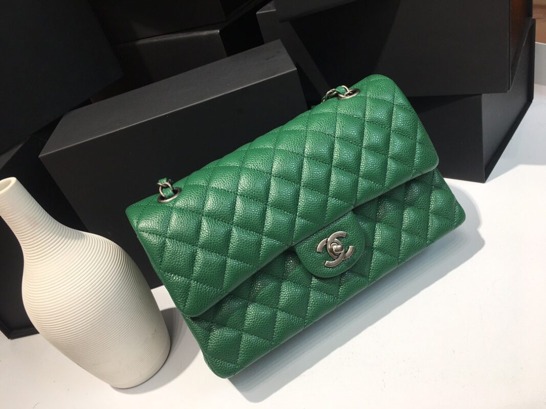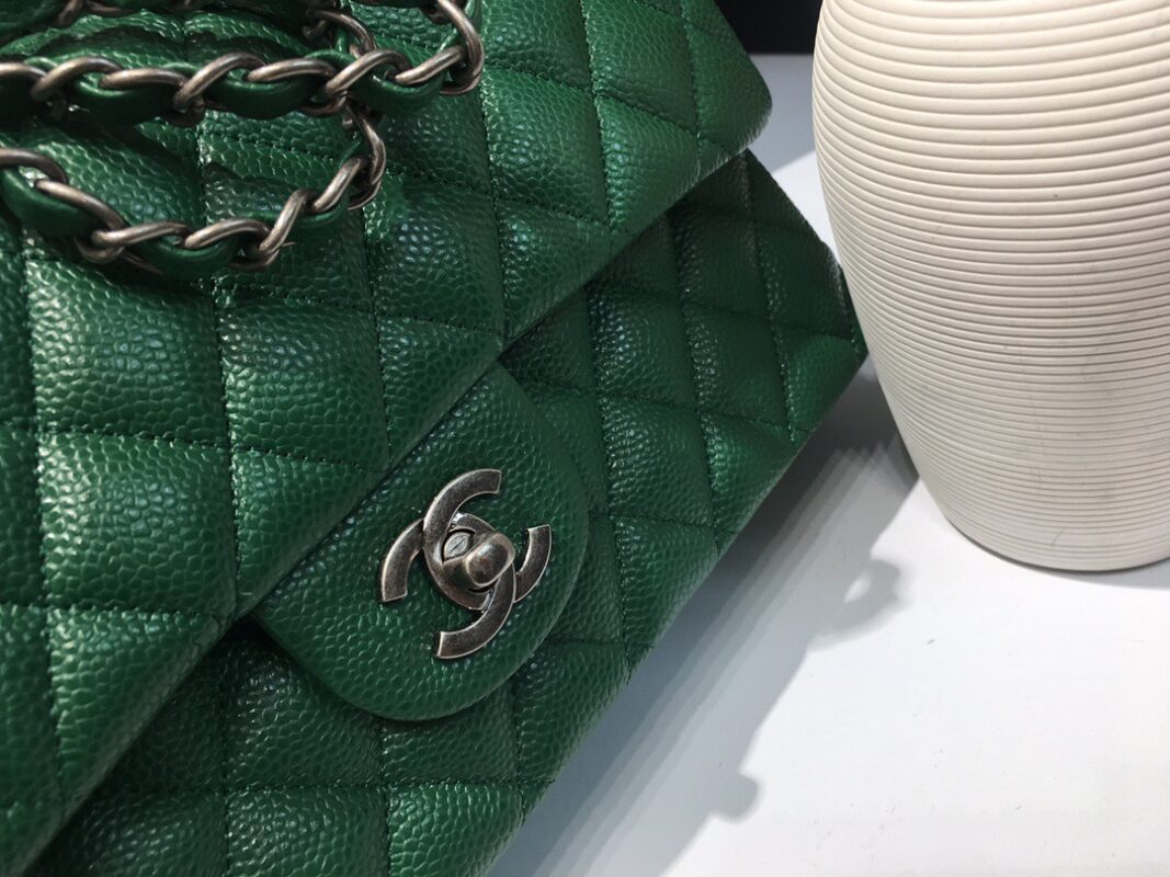 Chanel Classic Flap Caviar leather. All copper hardware. Grass Green. Silver Buckle 25cm