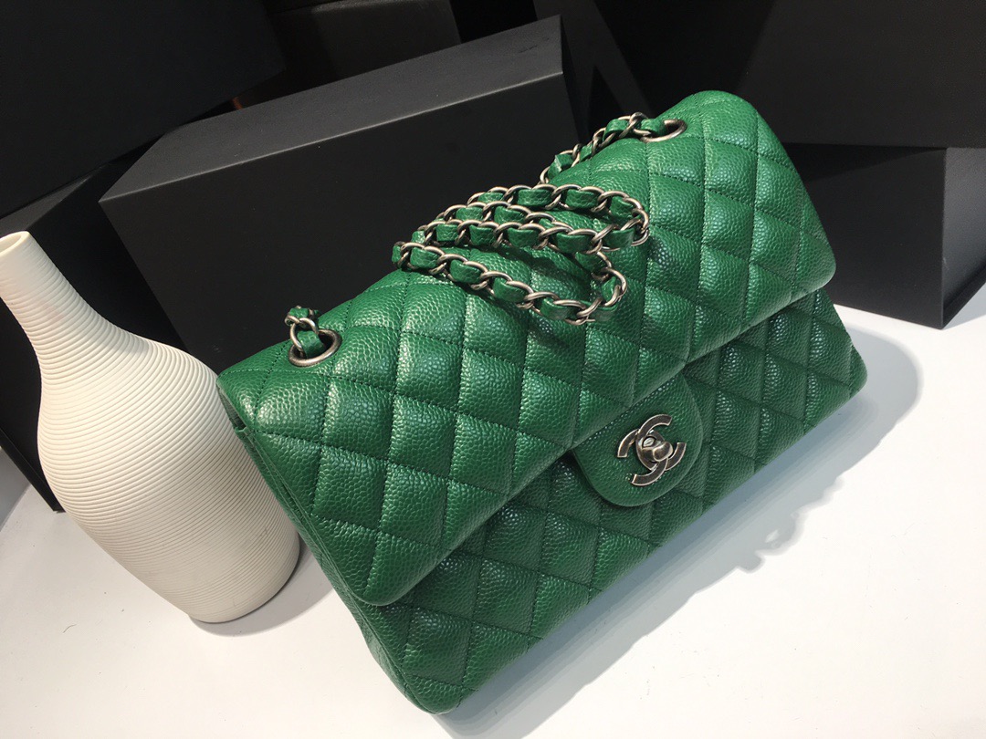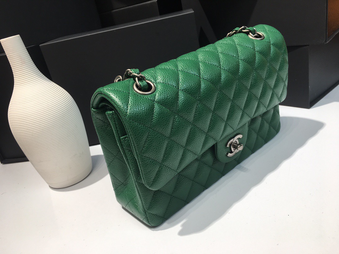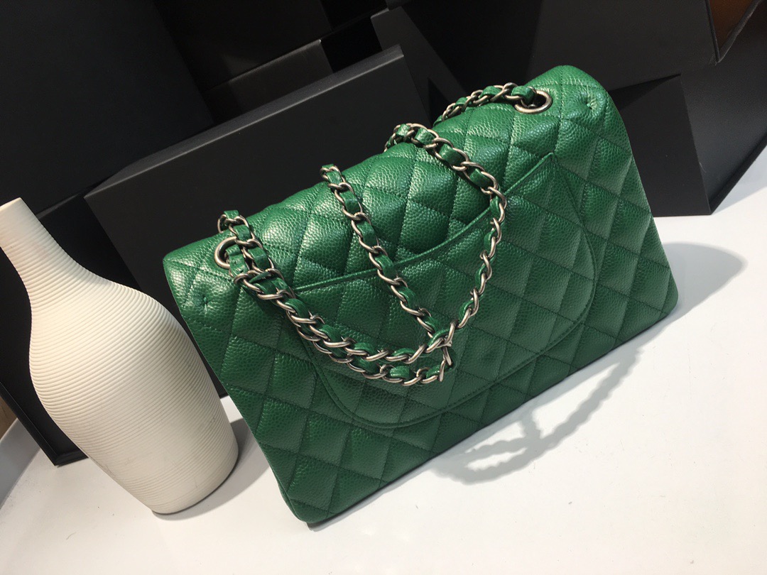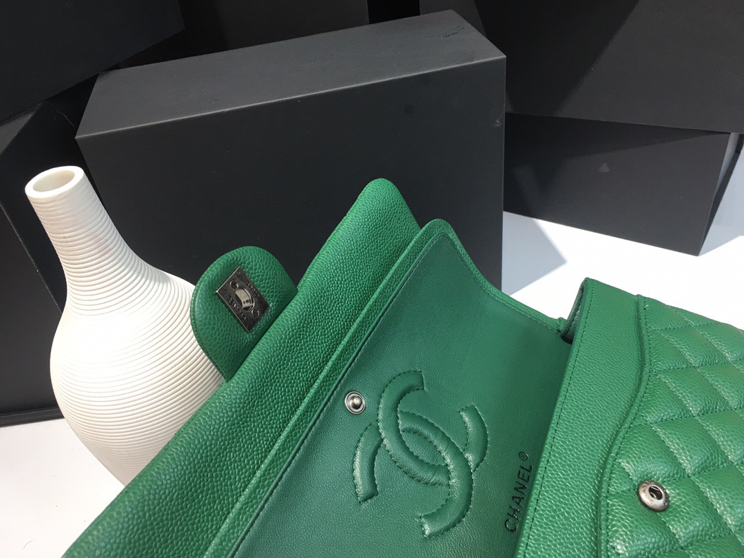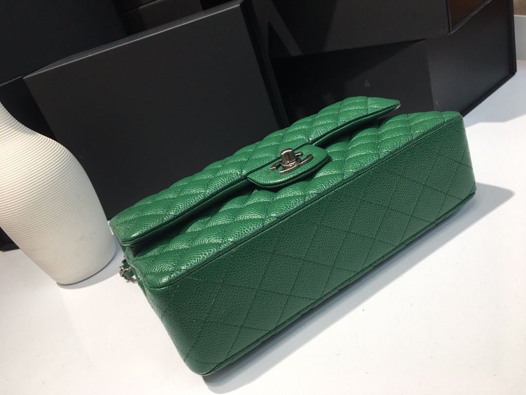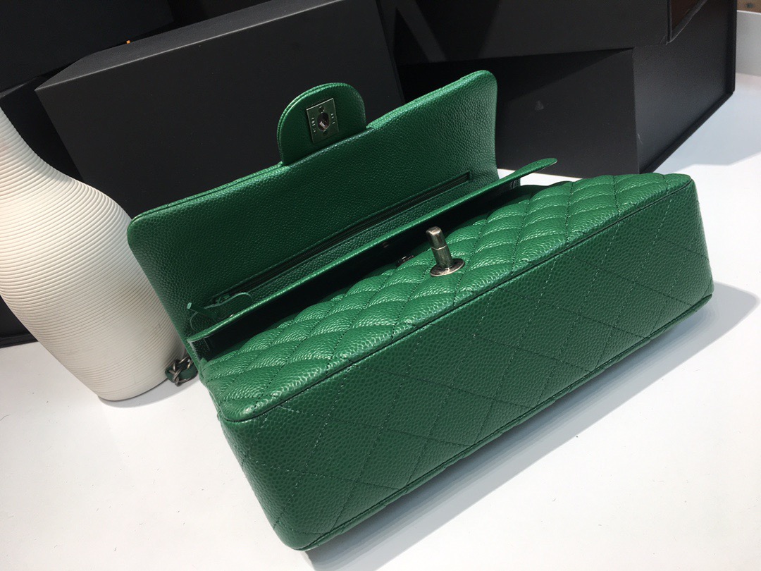 Chanel Classic Flap Caviar leather. All copper hardware. Grass Green. Silver Buckle 25cm