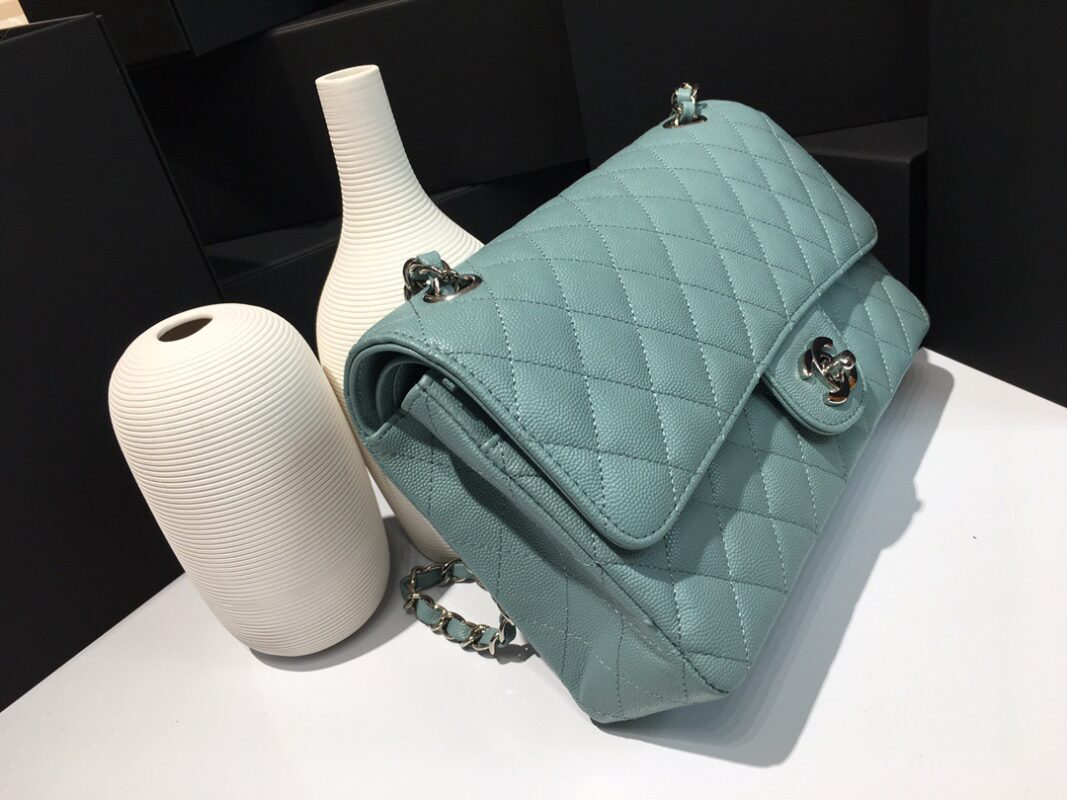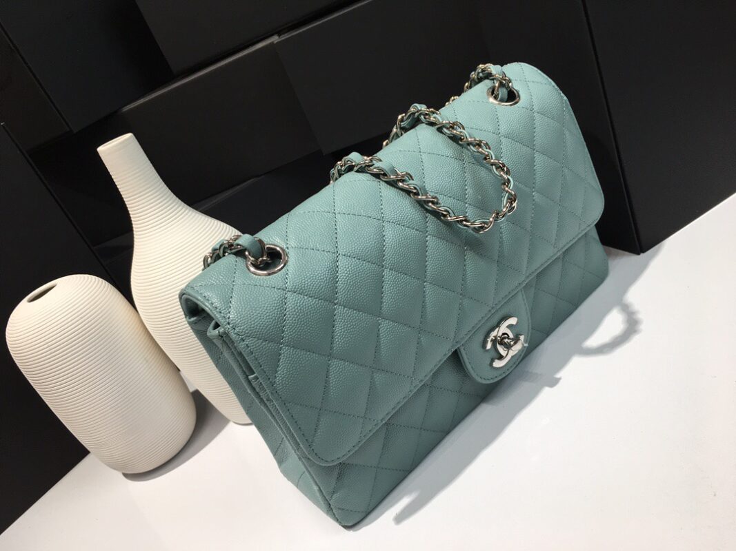 Chanel Classic Flap Caviar leather. All copper hardware. Haze Blue. Silver Buckle 25cm