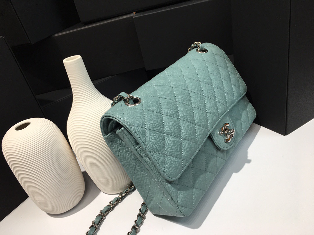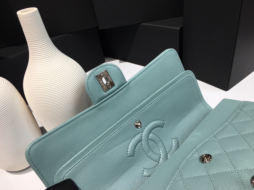 Chanel Classic Flap Caviar leather. All copper hardware. Haze Blue. Silver Buckle 25cm