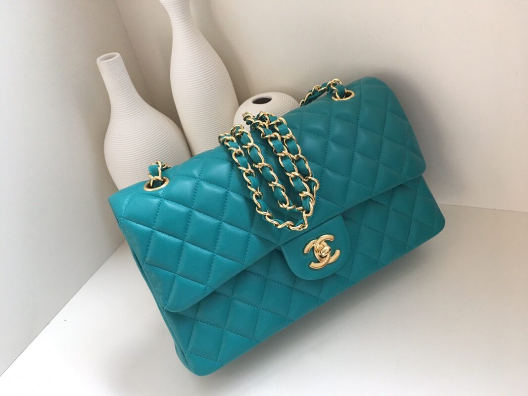 Chanel Flap Classic Lambskin. All copper hardware. Medium. Lake Blue. Gold Buckle 25cm