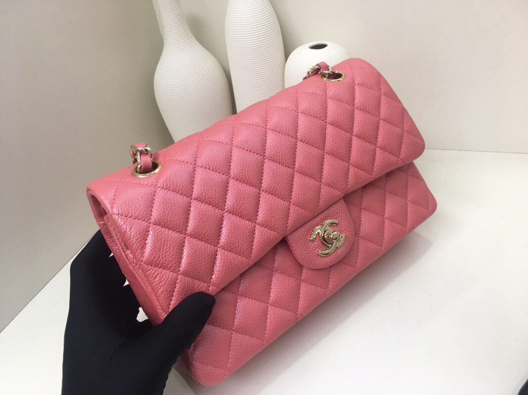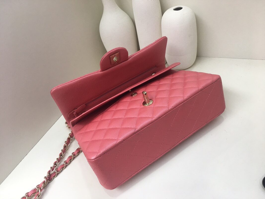 Chanel Classic Flap Calfskin caviar leather. Pearl ball pattern. All copper hardware. Gold Buckle. Pearl Powder 25cm