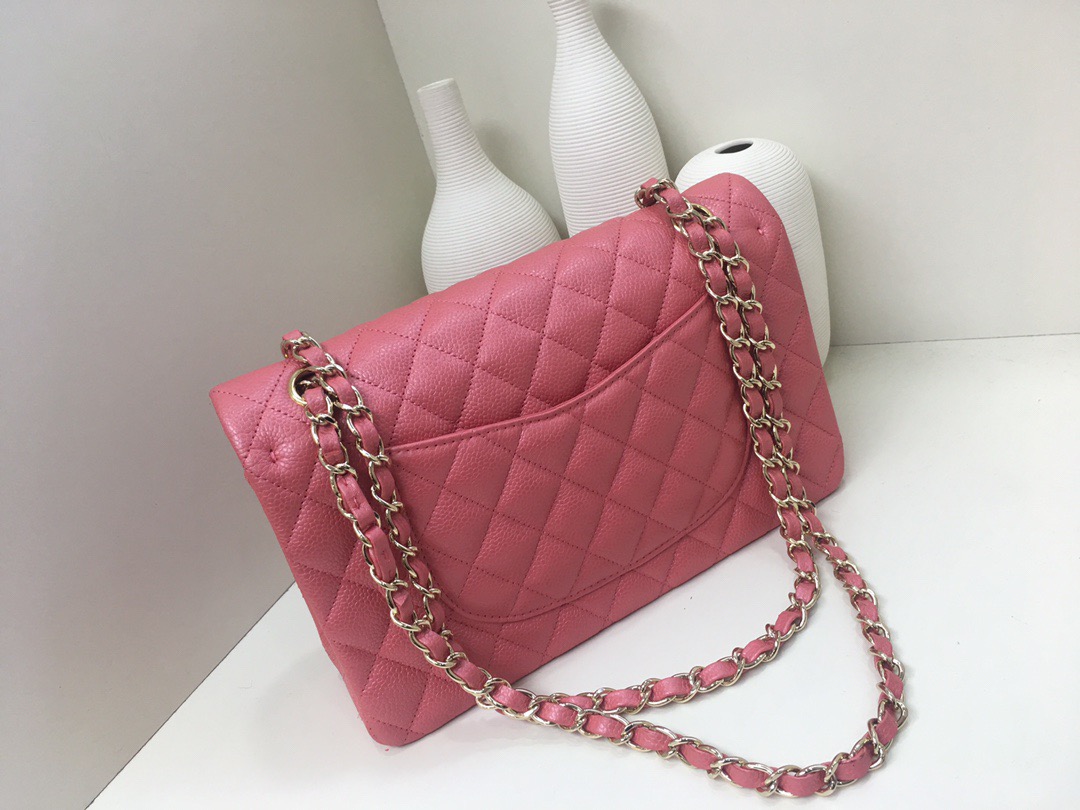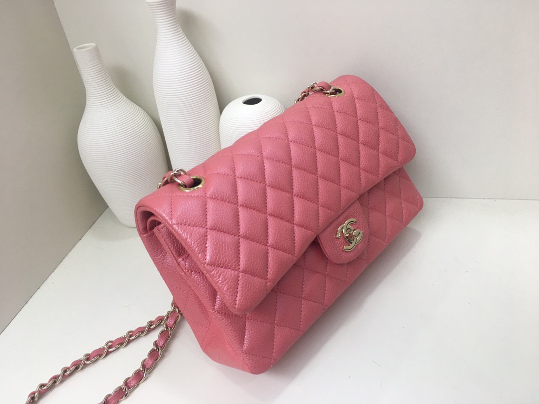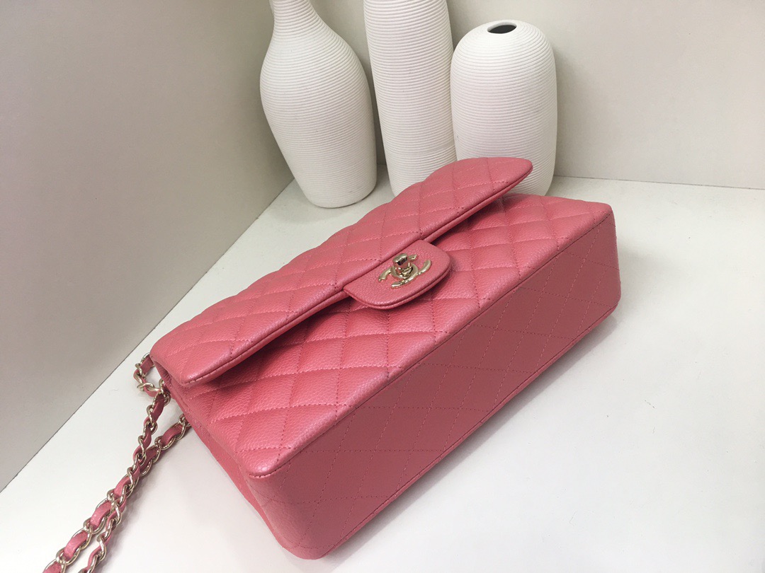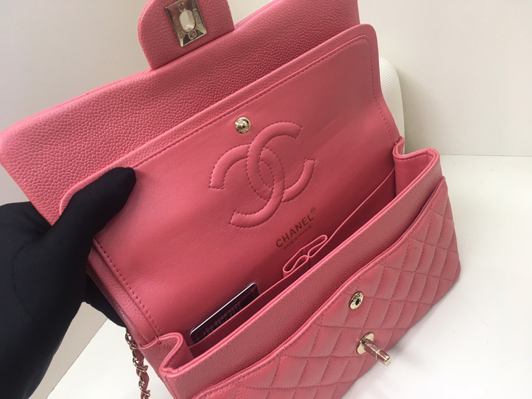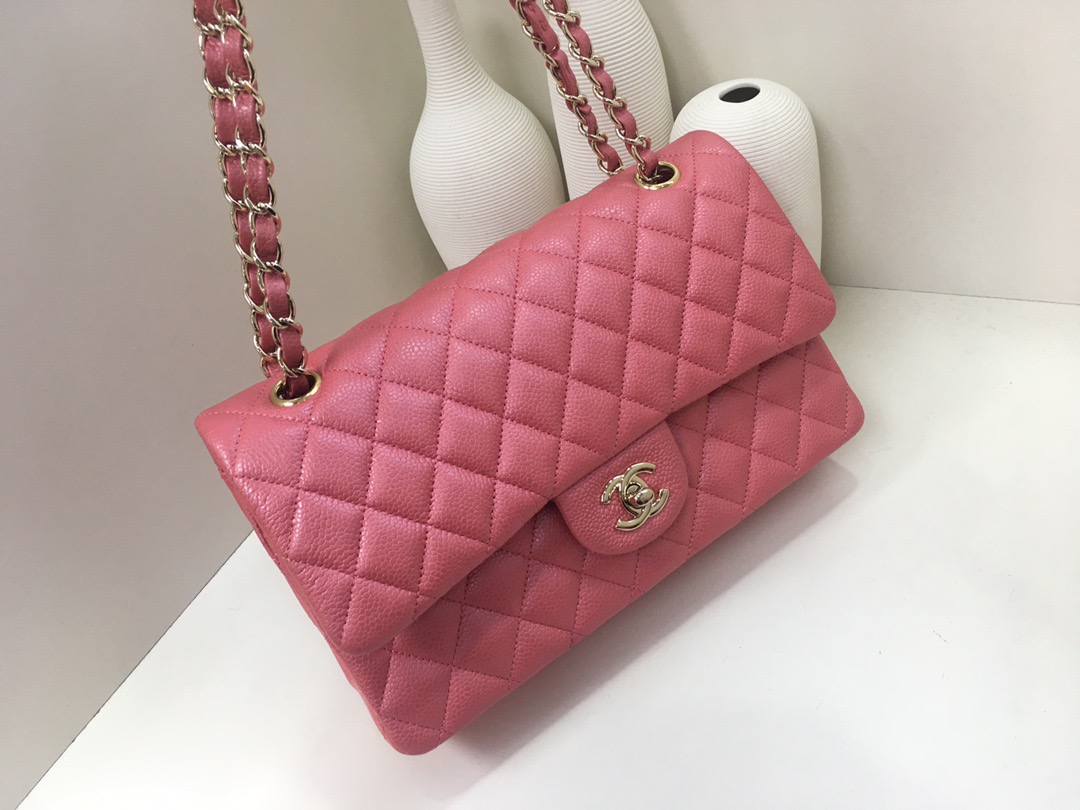 Chanel Classic Flap Calfskin caviar leather. Pearl ball pattern. All copper hardware. Gold Buckle. Pearl Powder 25cm