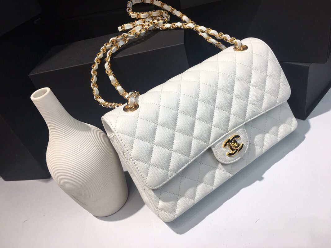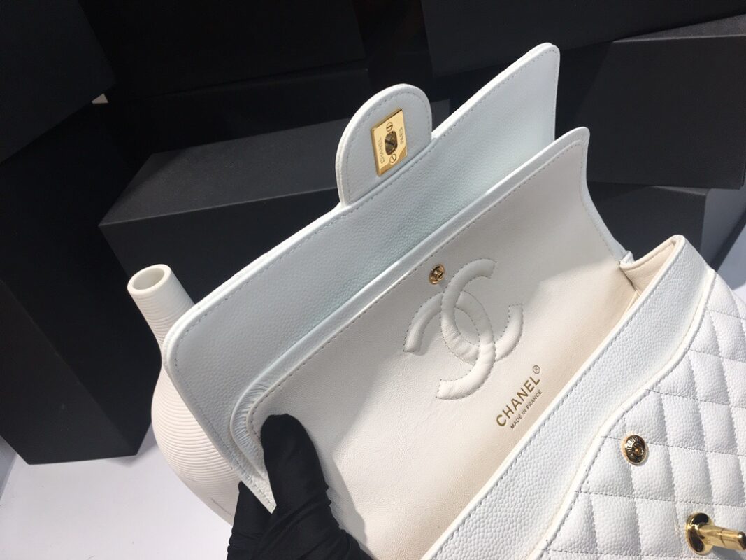 Chanel Classic Flap Fine-grained cowhide. All copper hardware. Haze Blue. Silver Buckle 25cm. Pure White. Platinum Buckle 25cm