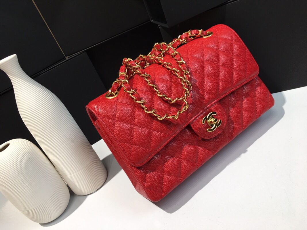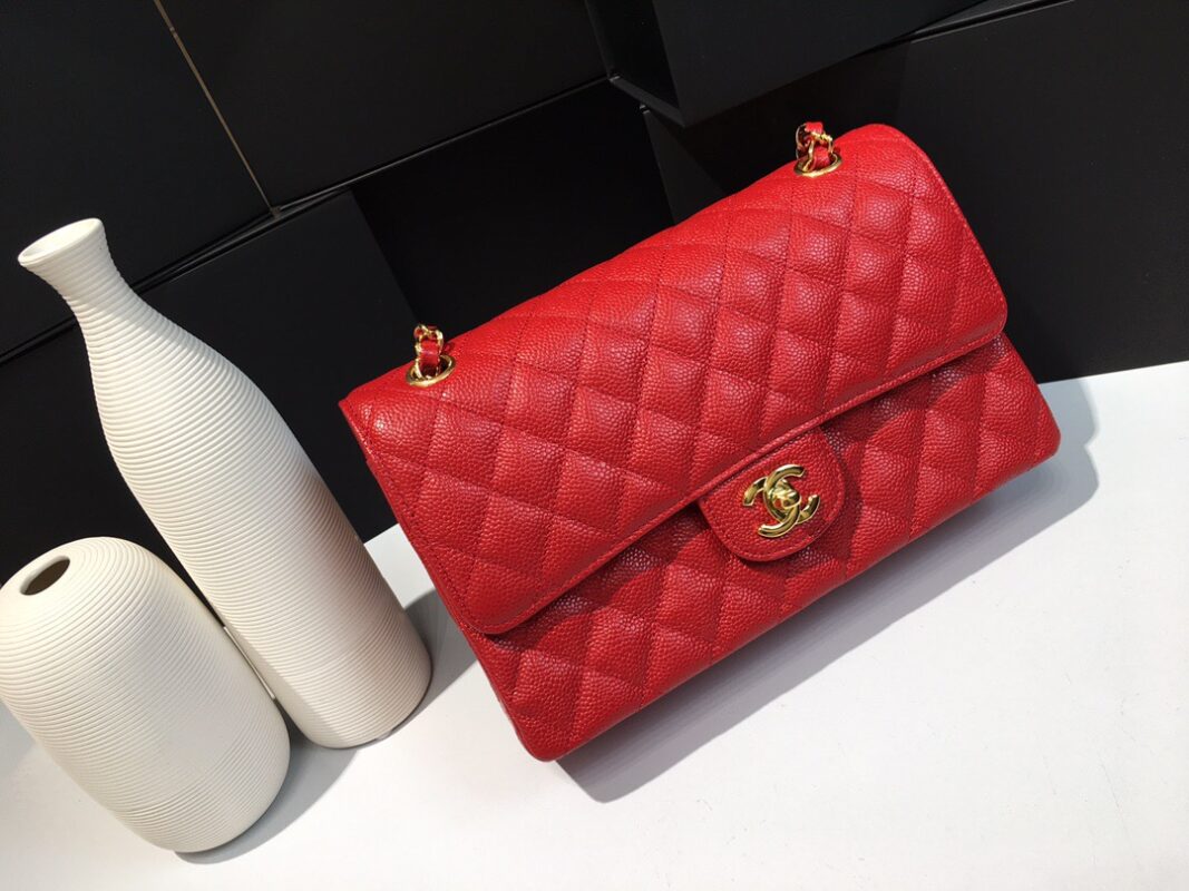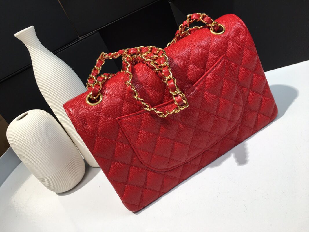 Chanel Classic Flap Caviar leather. All copper hardware. True Red. Gold Buckle 25cm