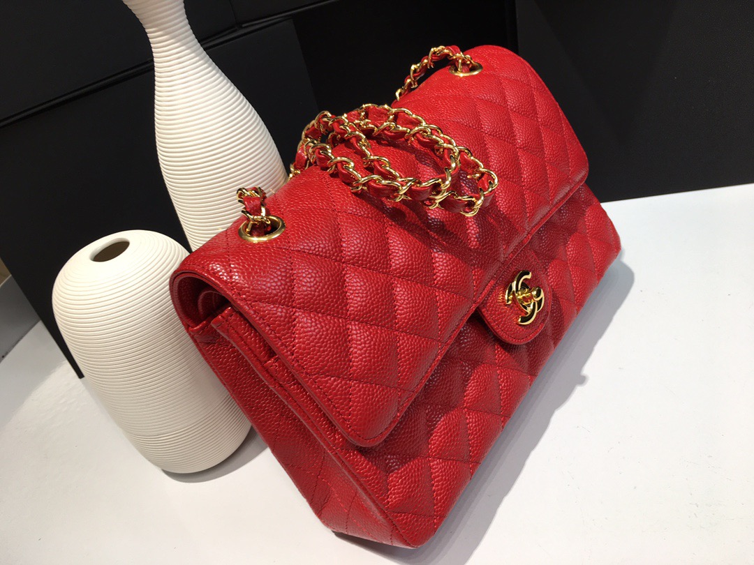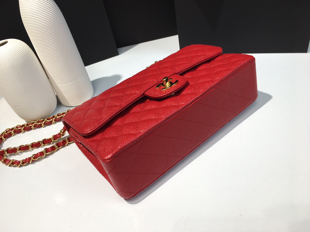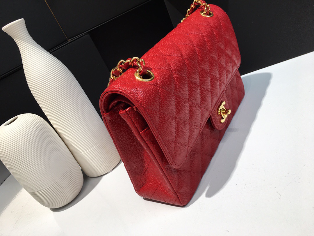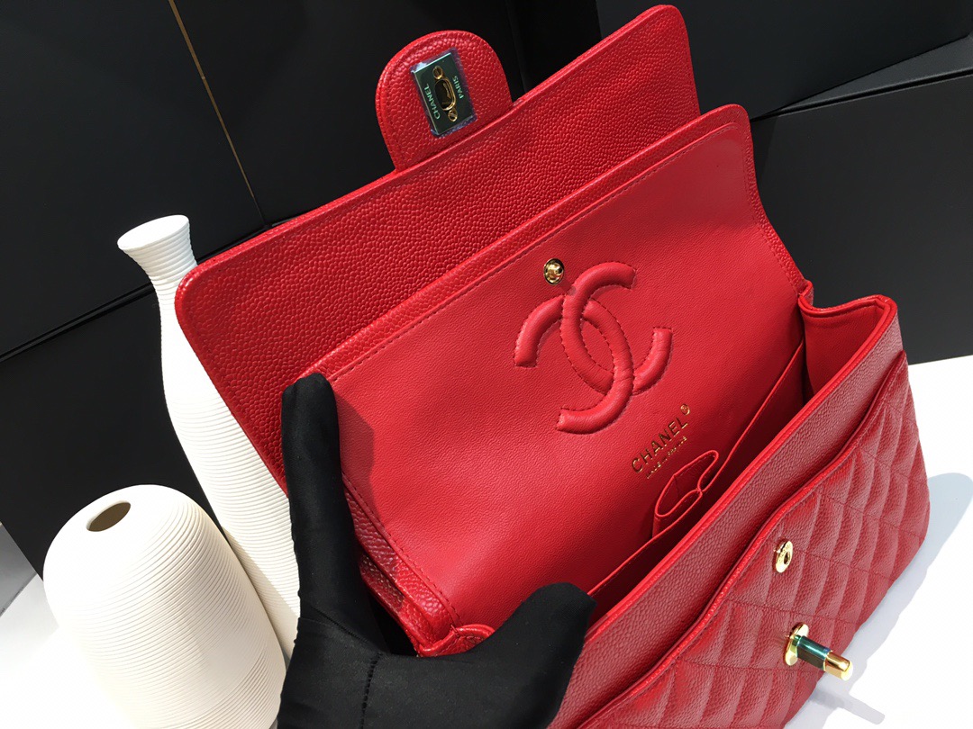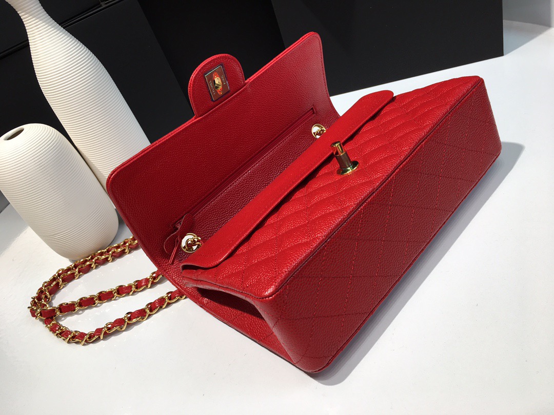 Chanel Classic Flap Caviar leather. All copper hardware. True Red. Gold Buckle 25cm