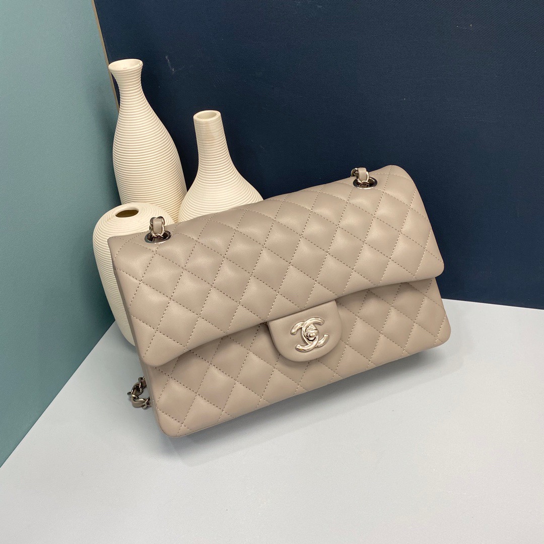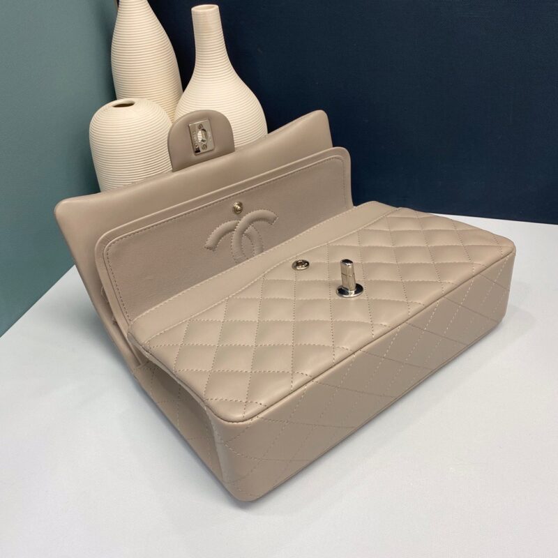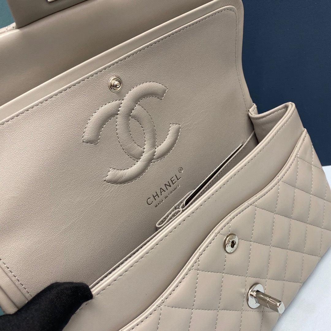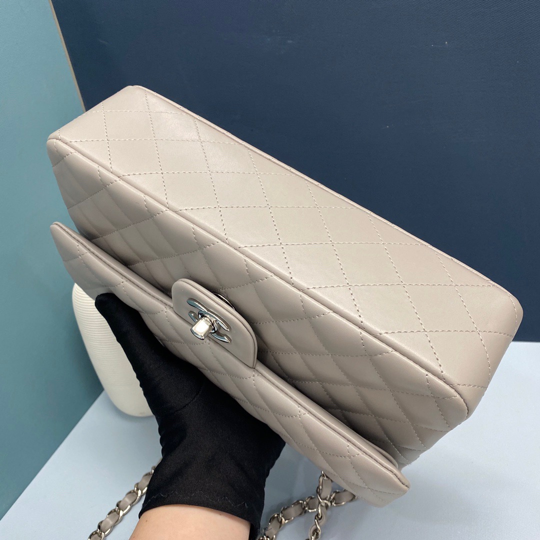 Chanel Classic Flap Imported lambskin. All copper hardware. Turtle Dove Grey. Silver Buckle 25cm