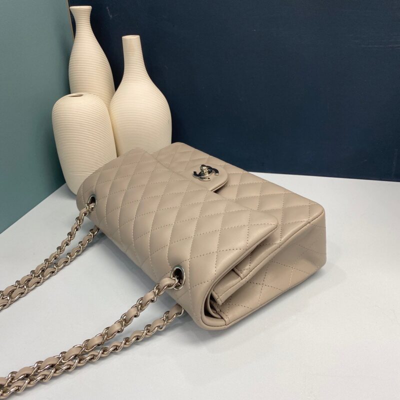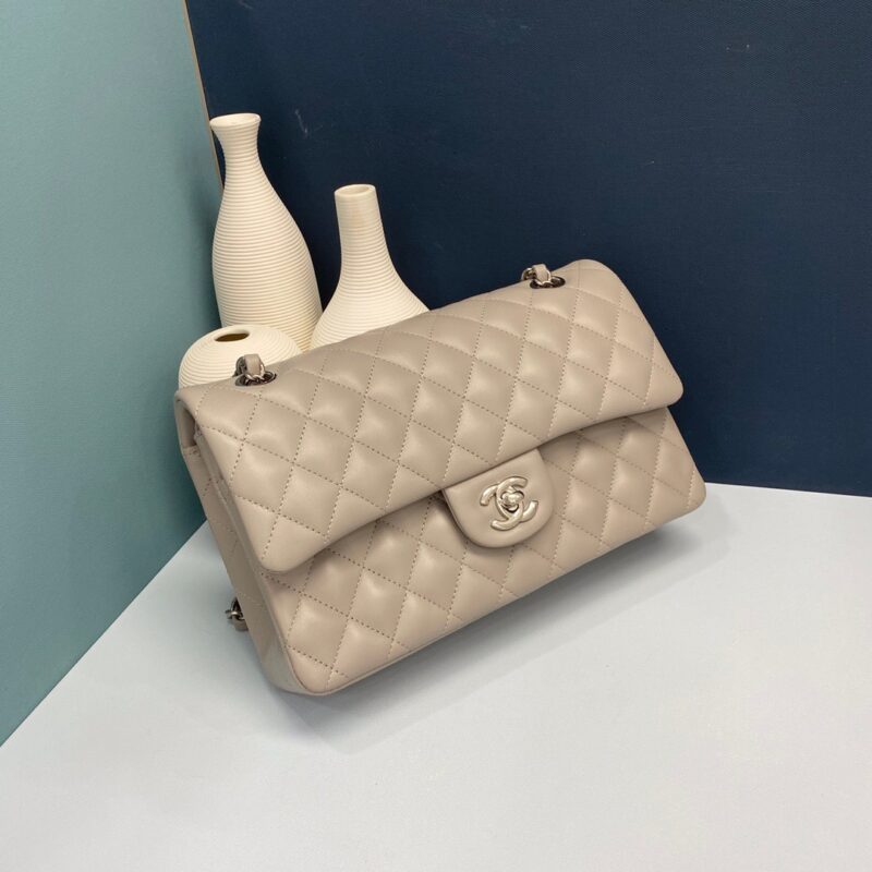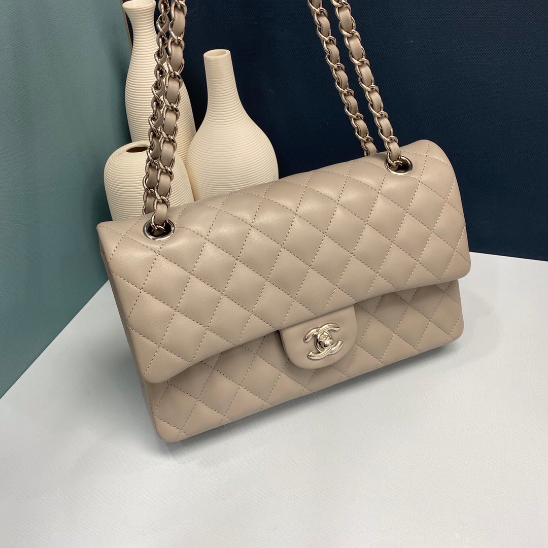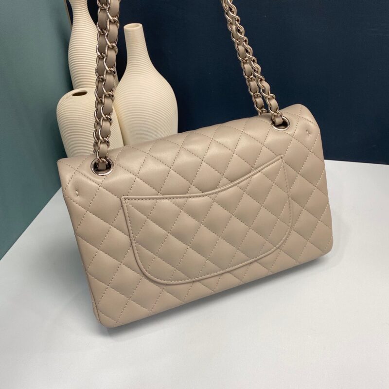 Chanel Classic Flap Imported lambskin. All copper hardware. Turtle Dove Grey. Silver Buckle 25cm
