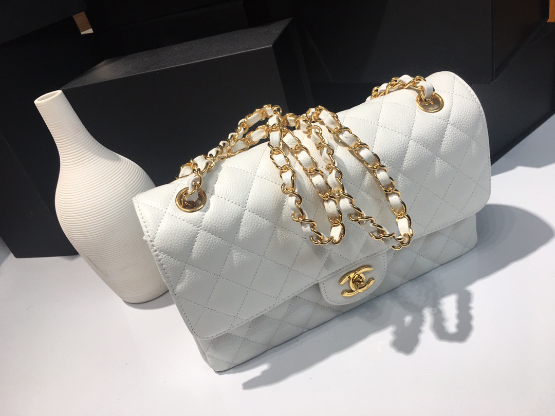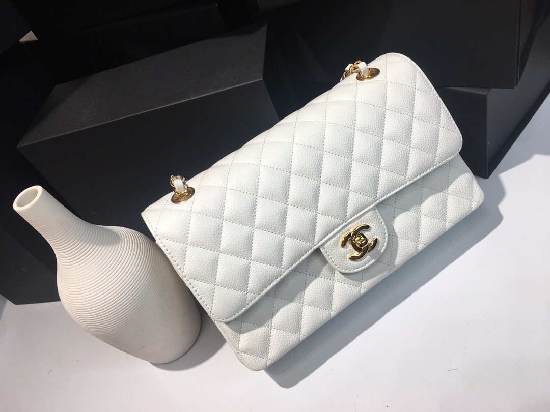 Chanel Classic Flap Caviar leather. All copper hardware. White. Gold Buckle 25cm