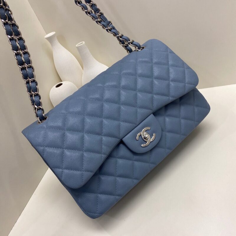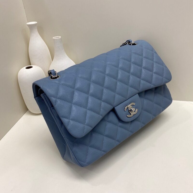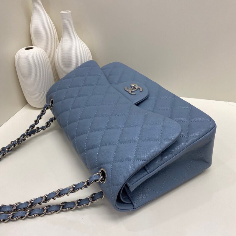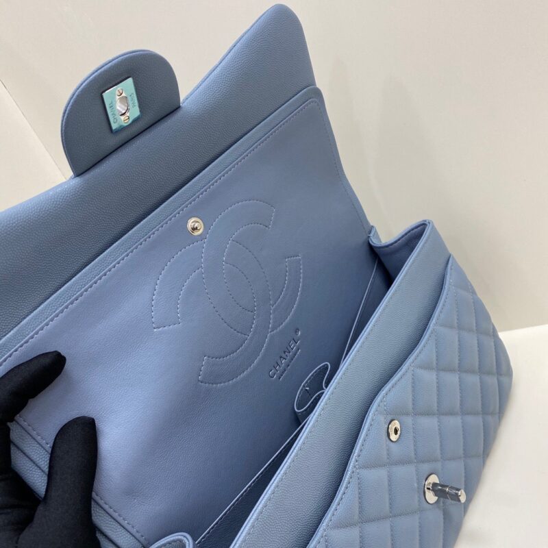 Chanel Classic Flap Calfskin caviar leather. Full copper hardware. Blue. Silver Buckle 30cm