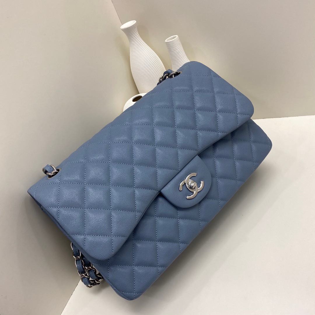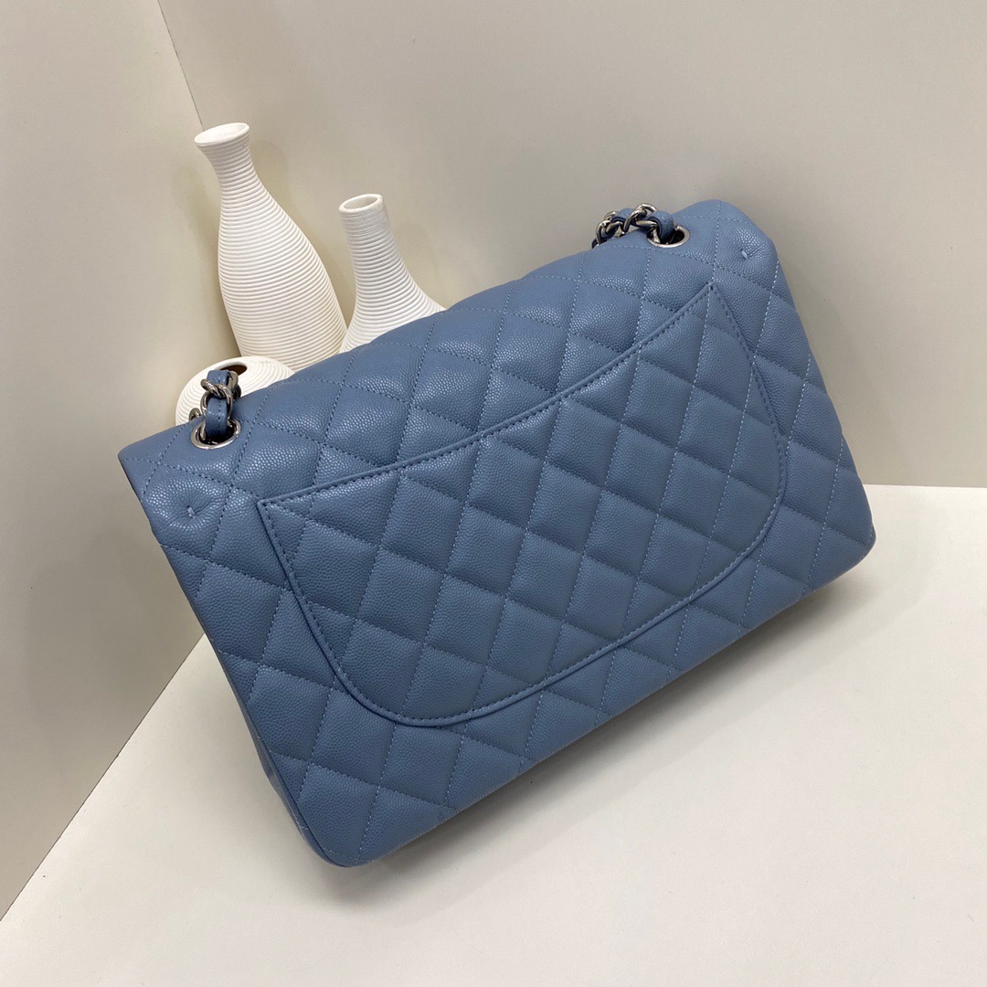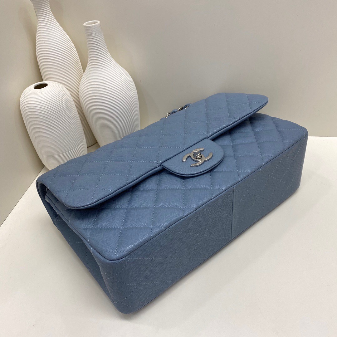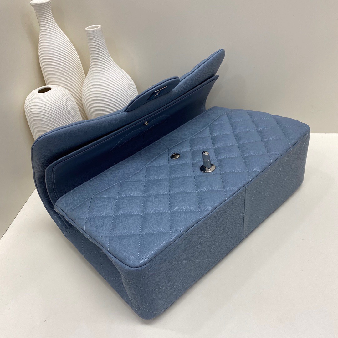 Chanel Classic Flap Calfskin caviar leather. Full copper hardware. Blue. Silver Buckle 30cm