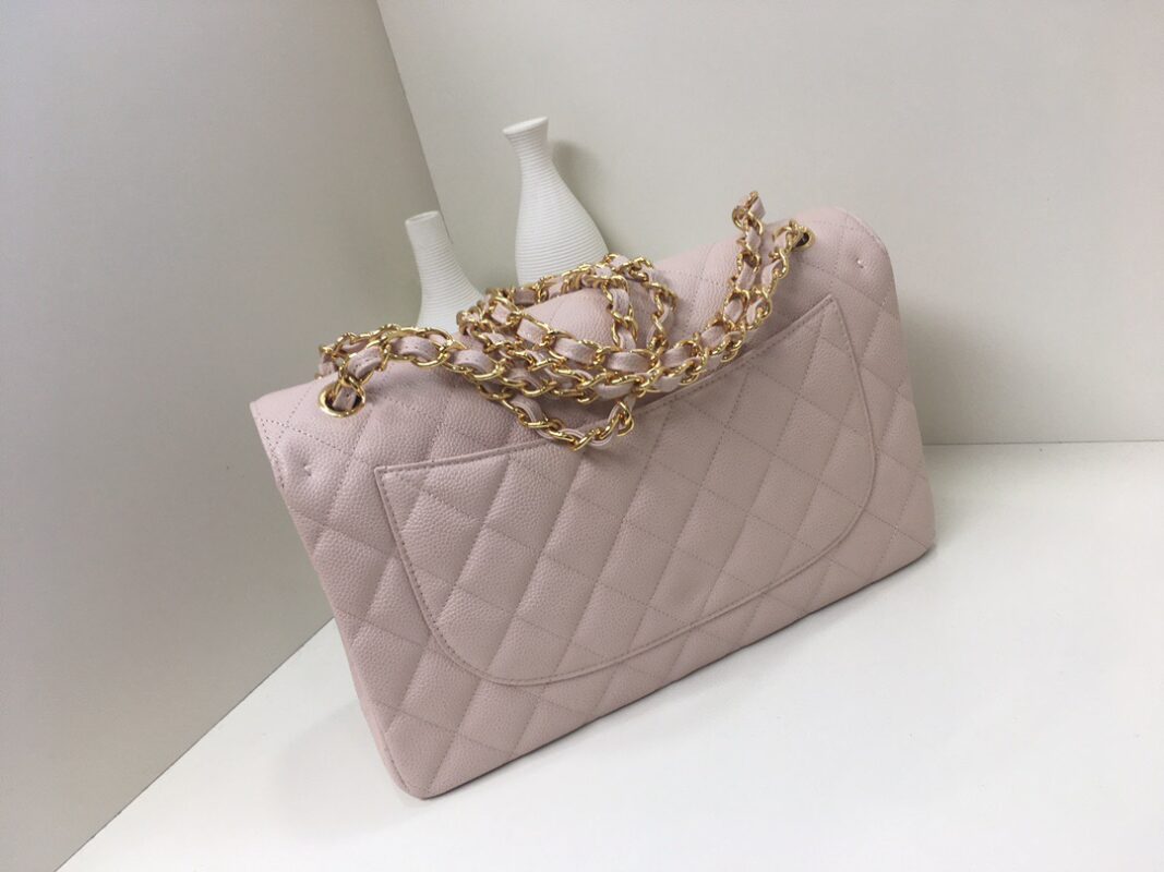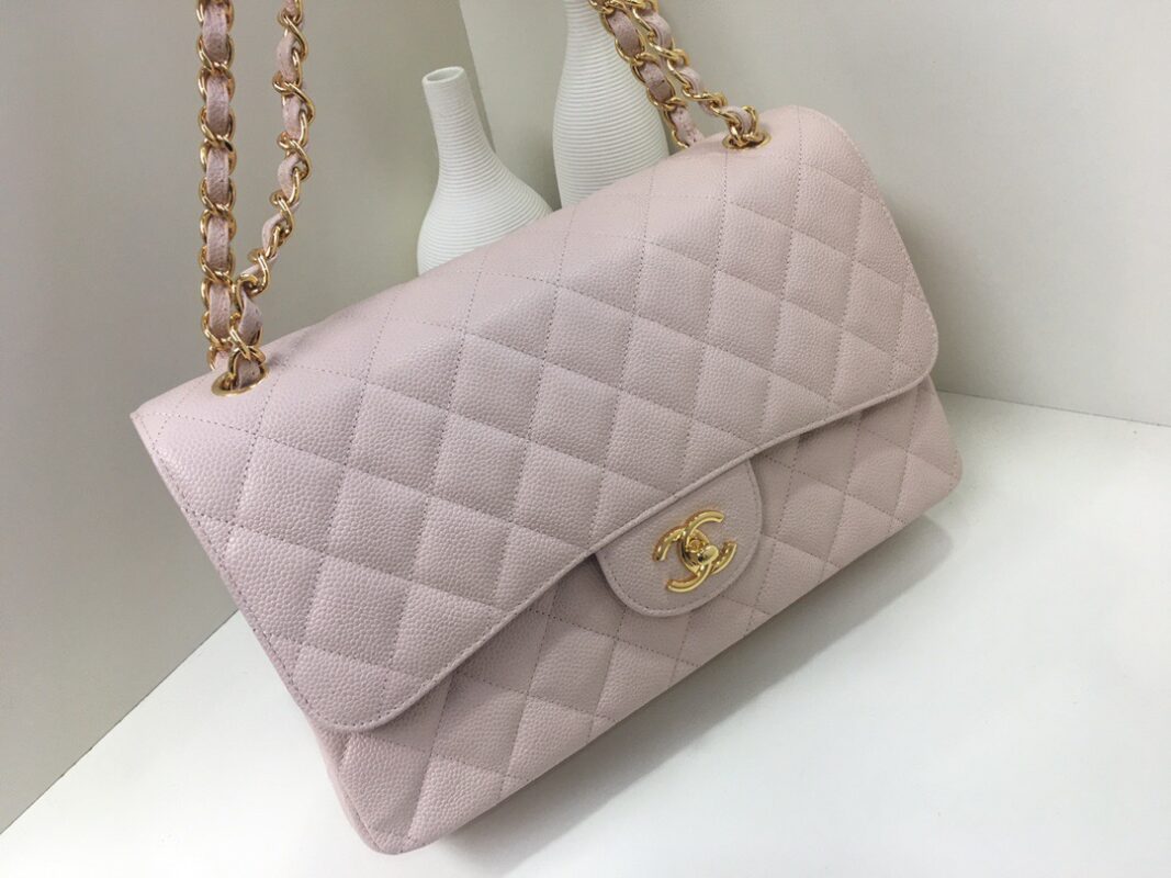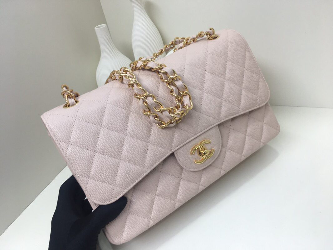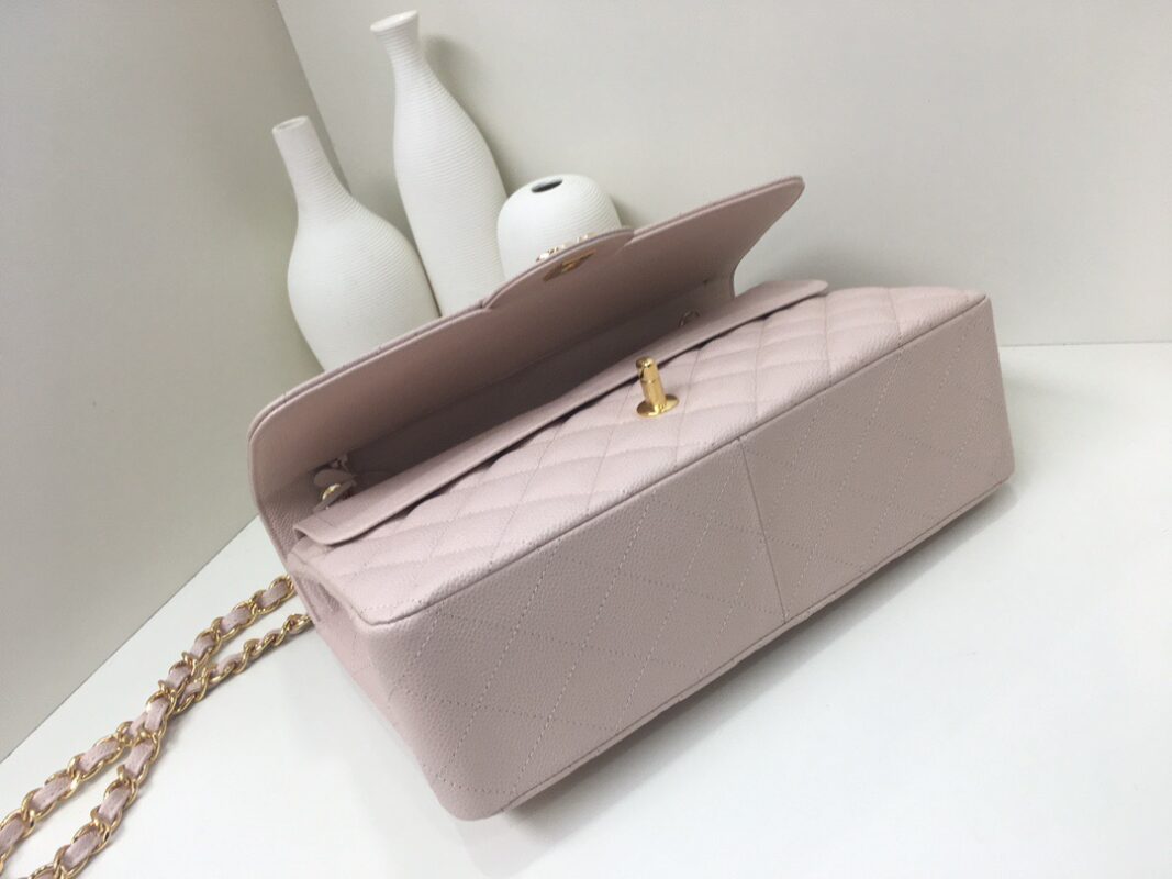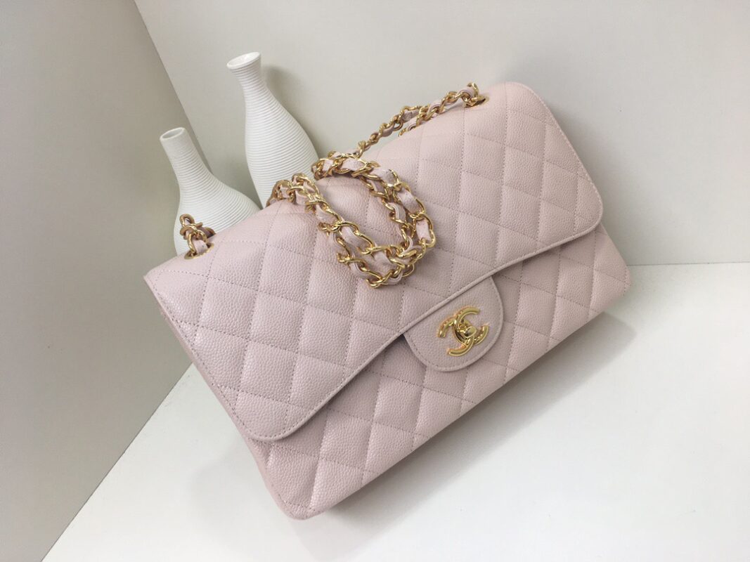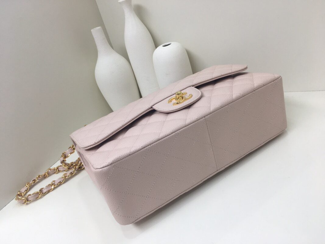 Chanel Classic Flap Calfskin Caviar leather. Full copper hardware. Jumbo Light Pink. Gold Buckle 30cm
