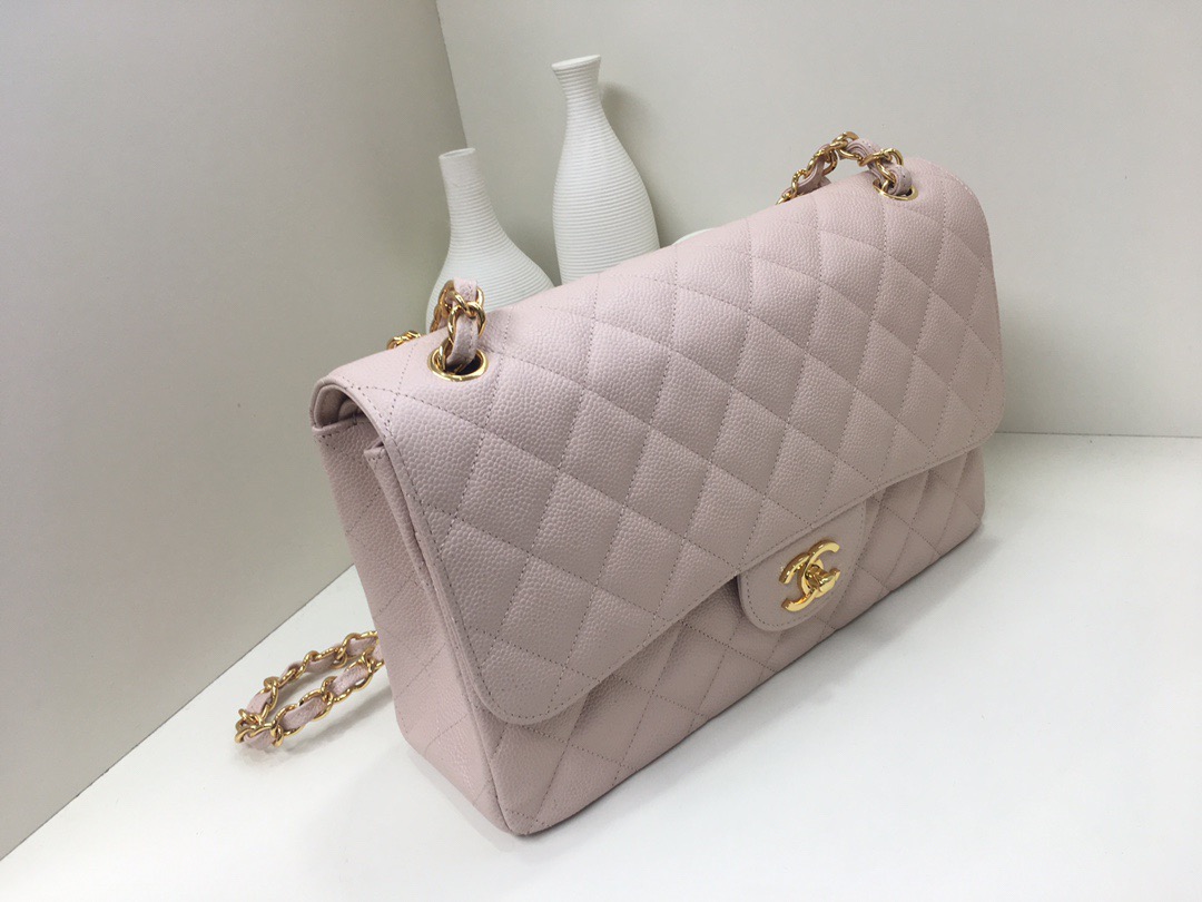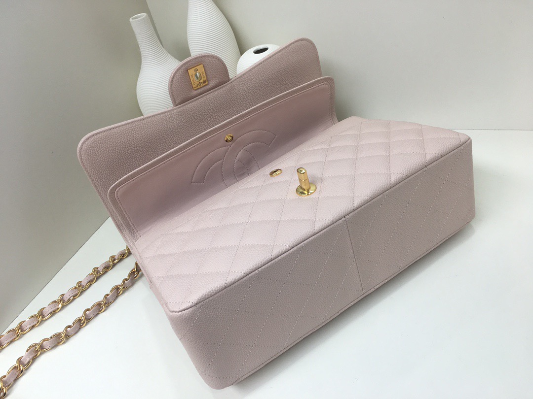 Chanel Classic Flap Calfskin Caviar leather. Full copper hardware. Jumbo Light Pink. Gold Buckle 30cm