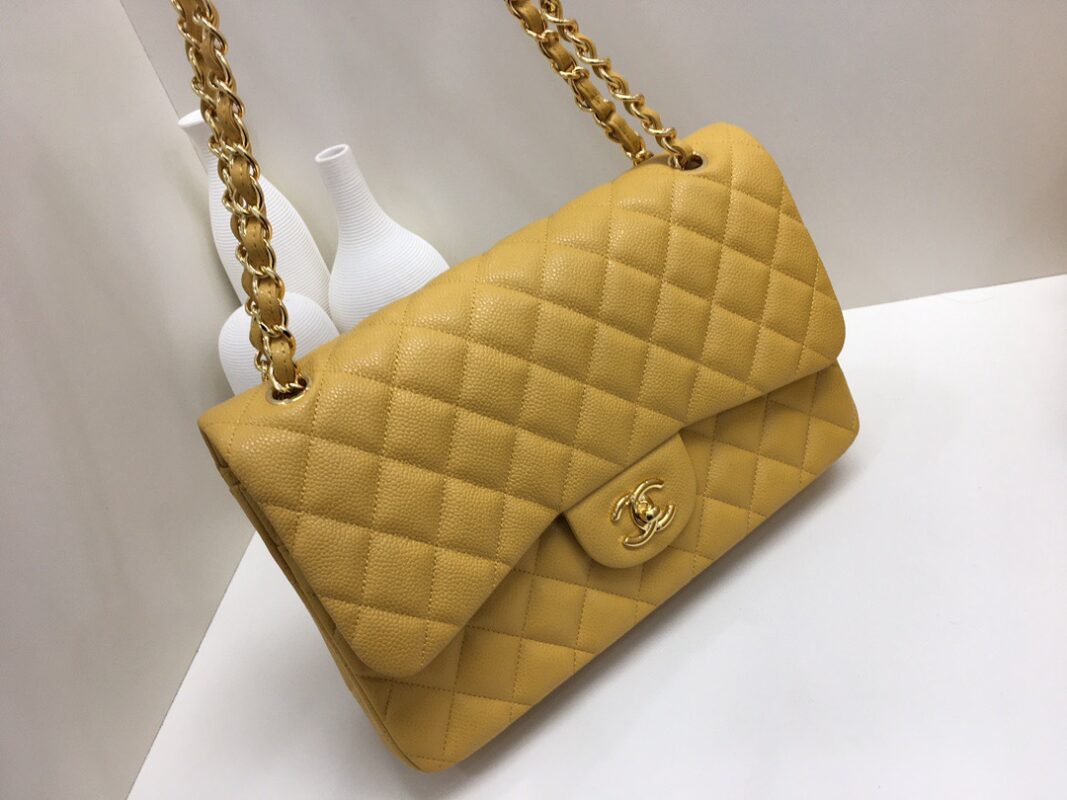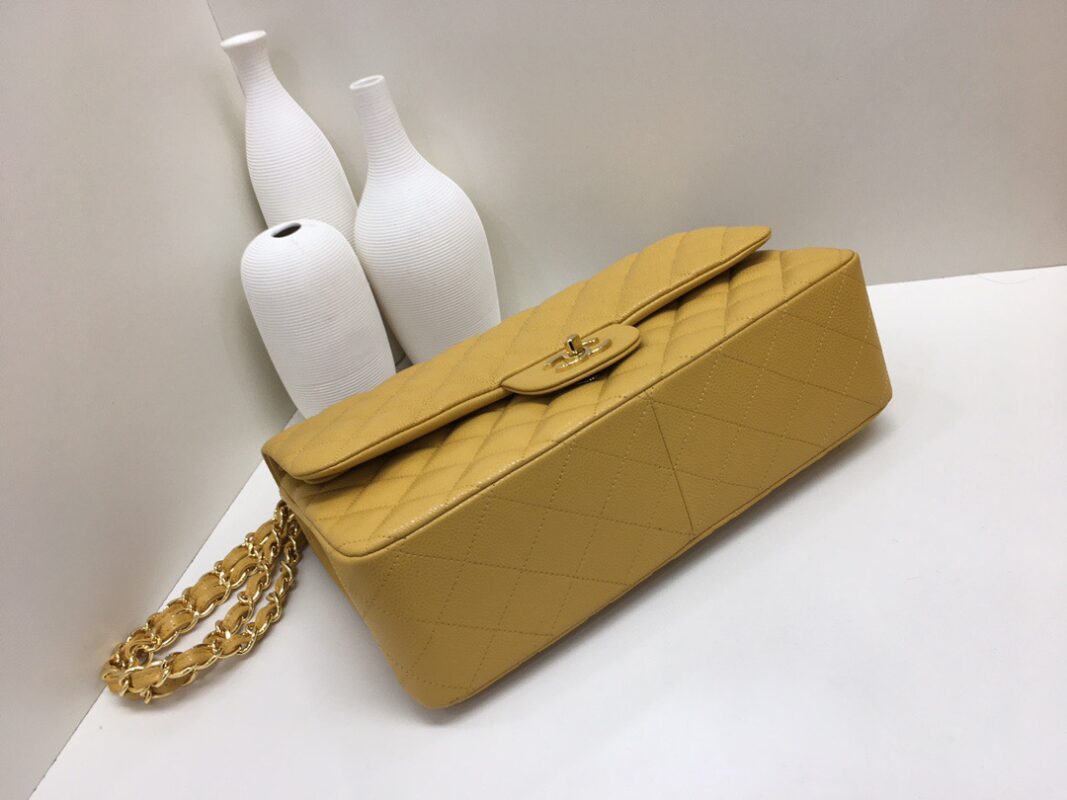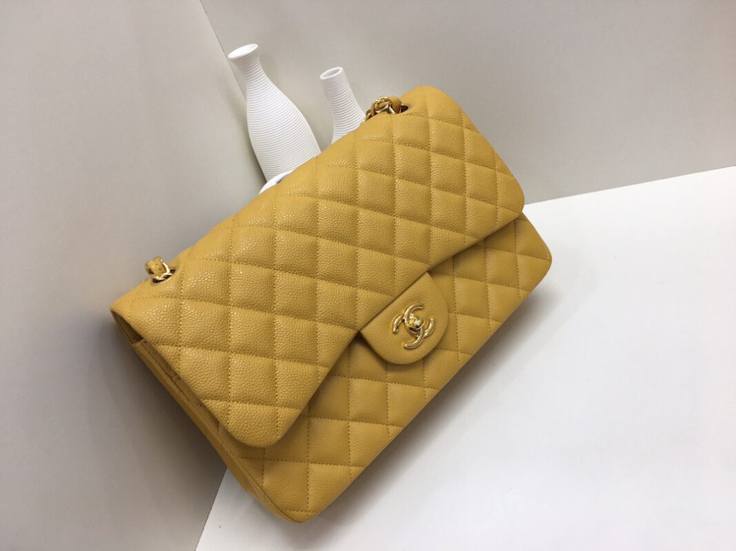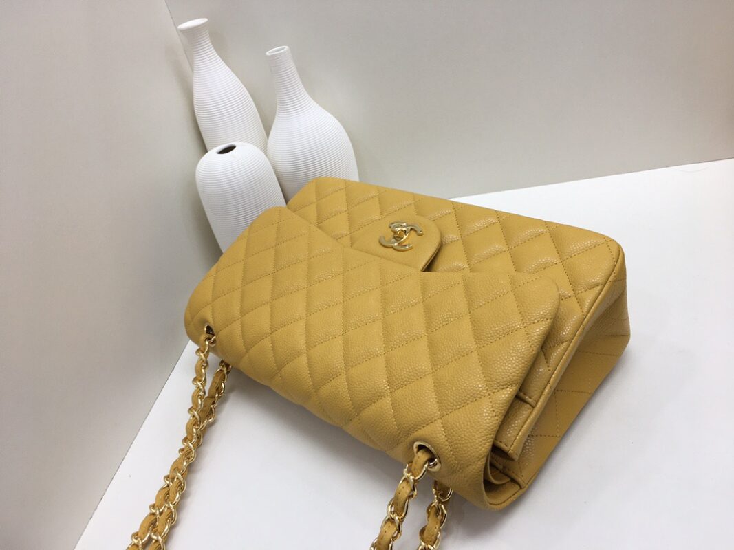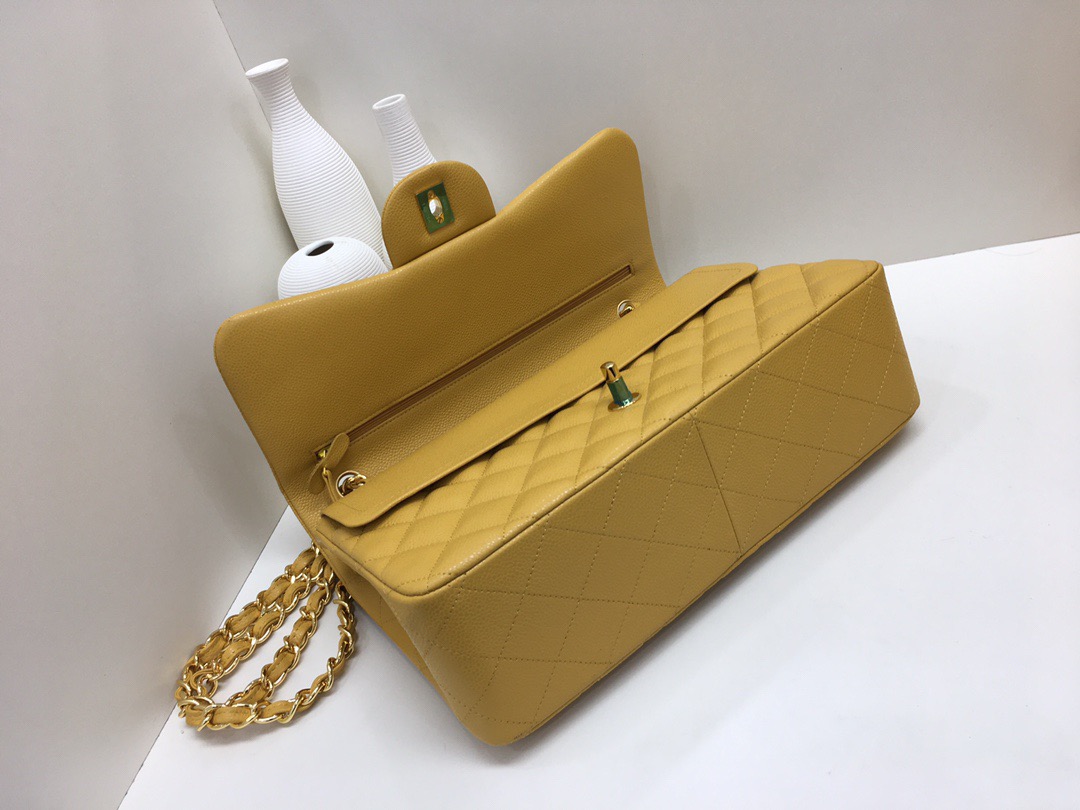 Chanel Classic Flap Calfskin caviar leather. Full copper hardware. Mango Yellow. Gold Buckle 30cm
