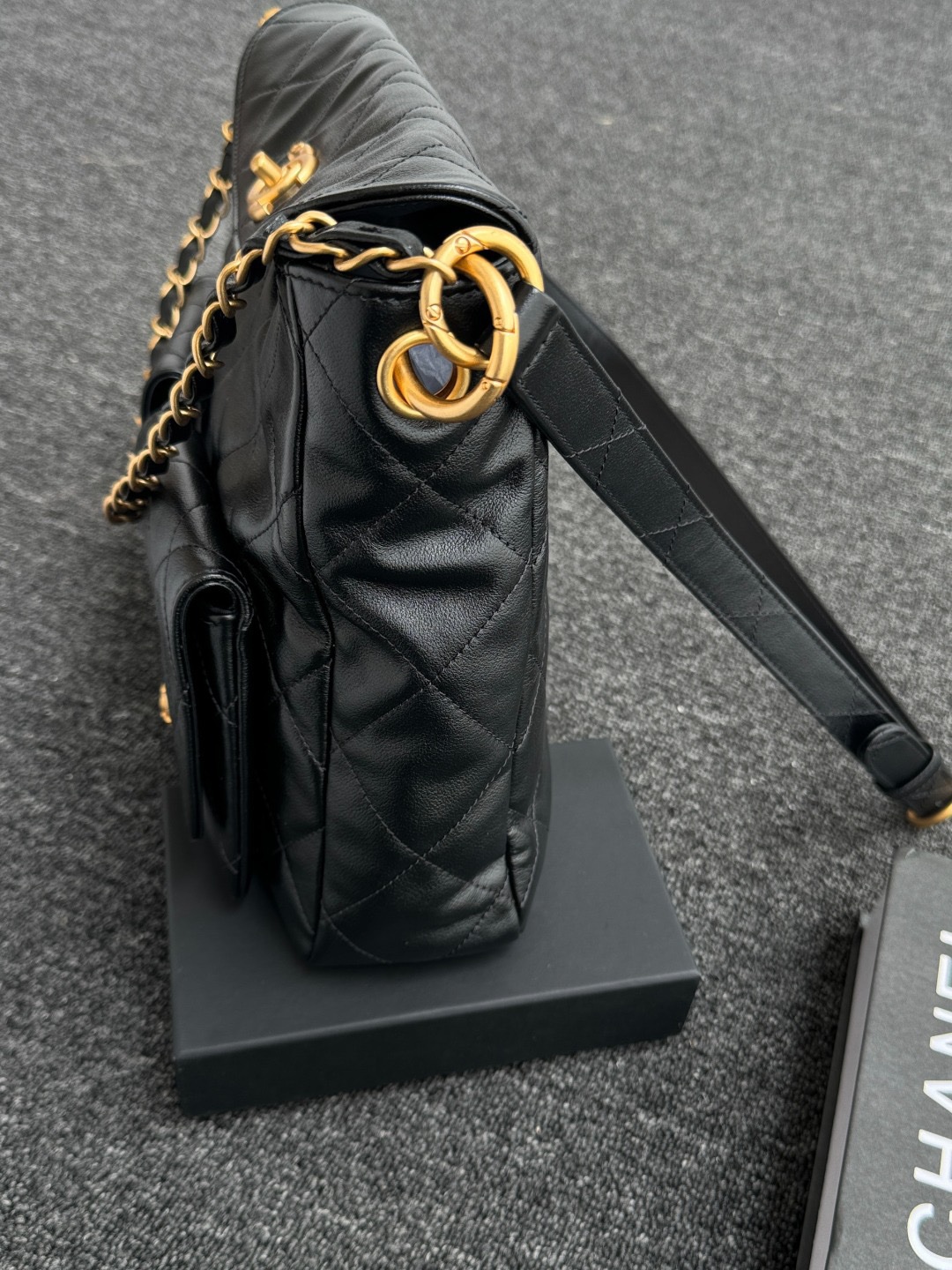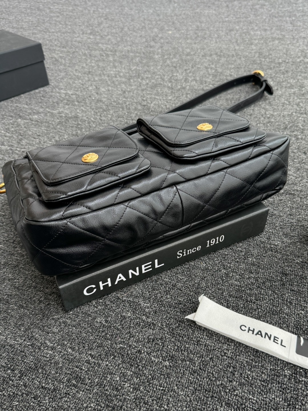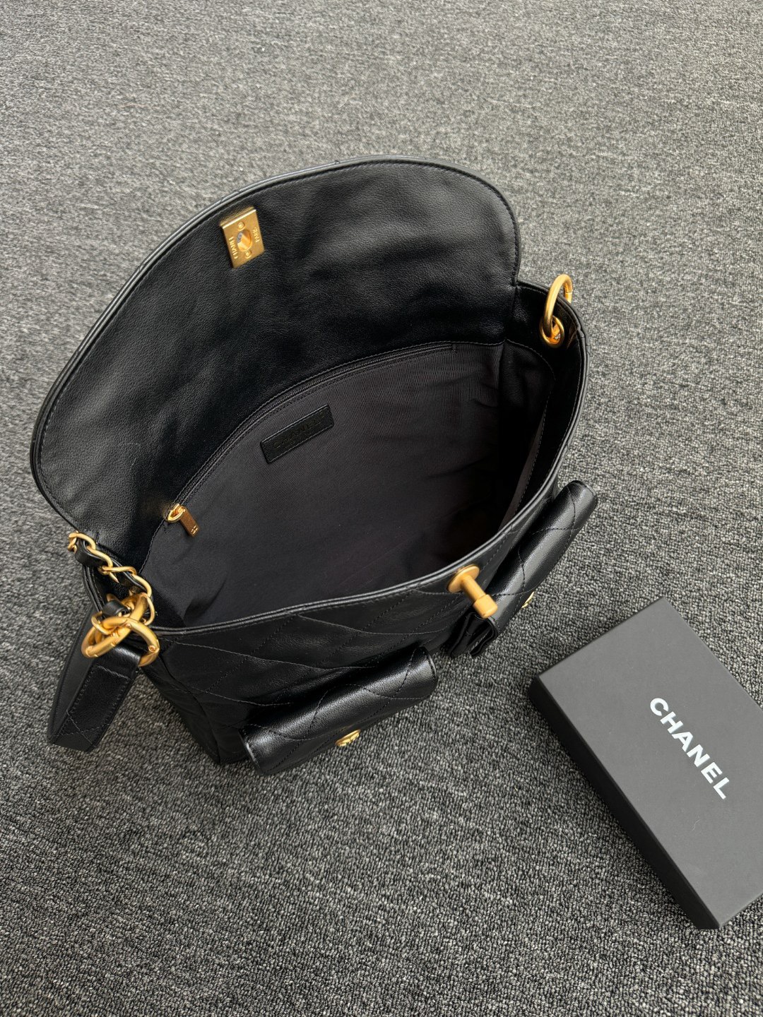 Chanel Double Pocket Hobo Bag Black Shiny Calfskin