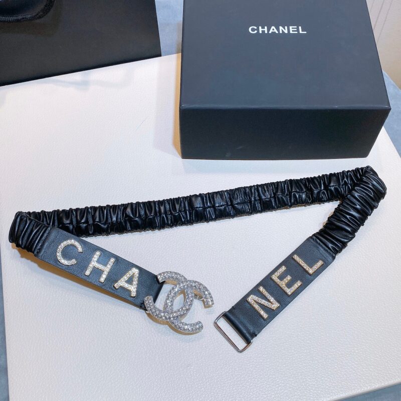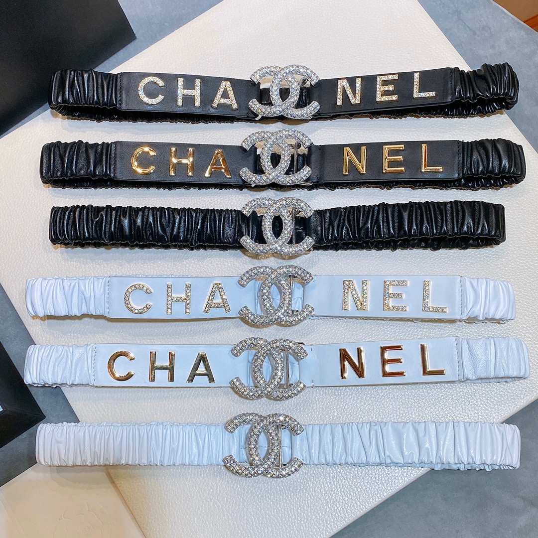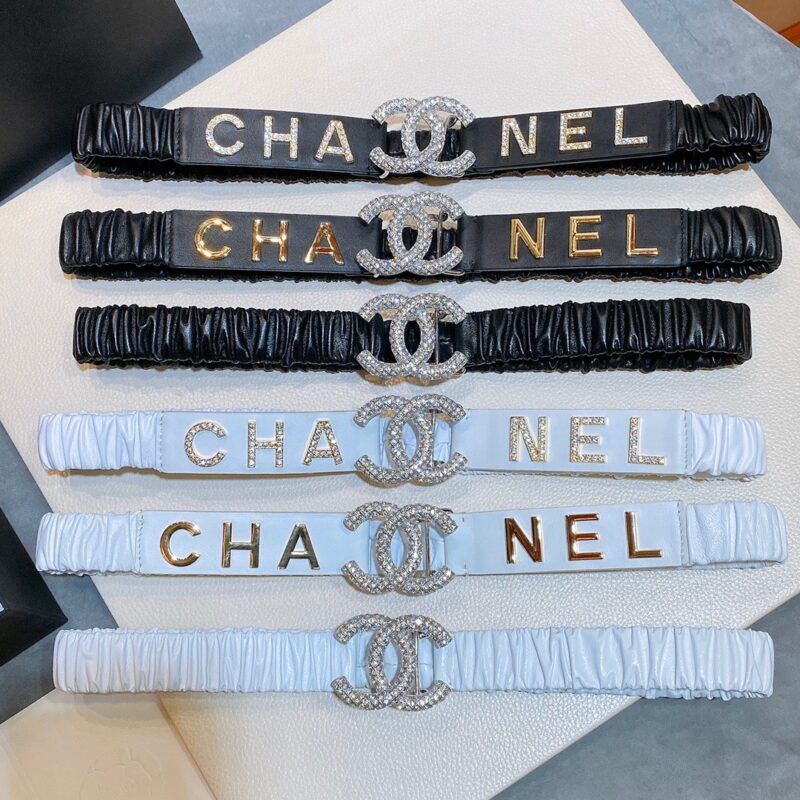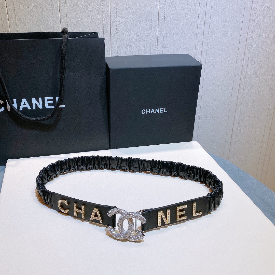 Chanel CC logo rhinestone gold metal buckle sheepskin elastic belt. Width: 3mm. Luxurious and elegant.