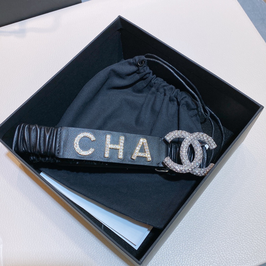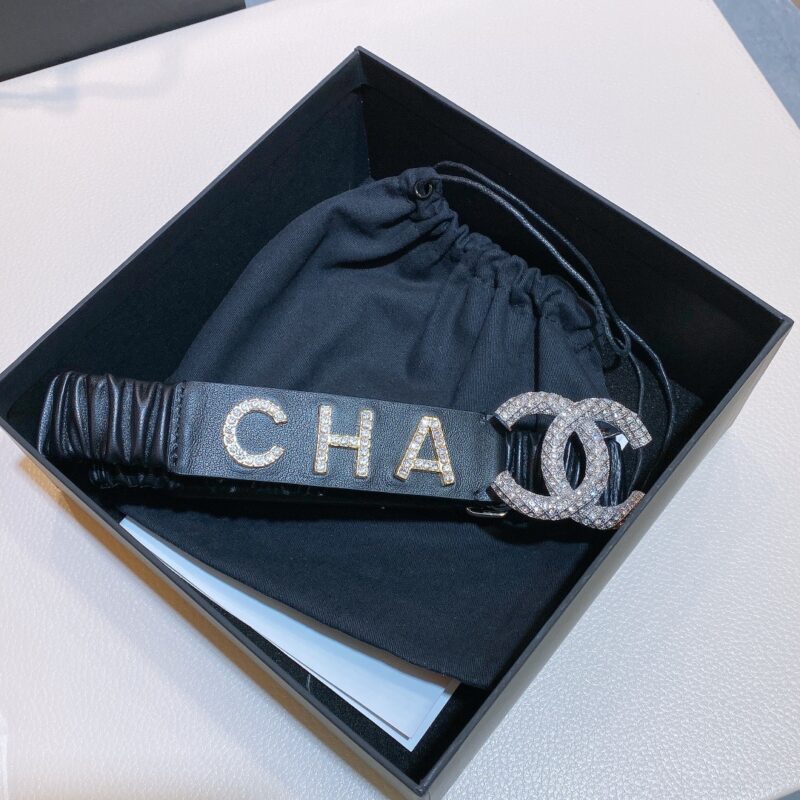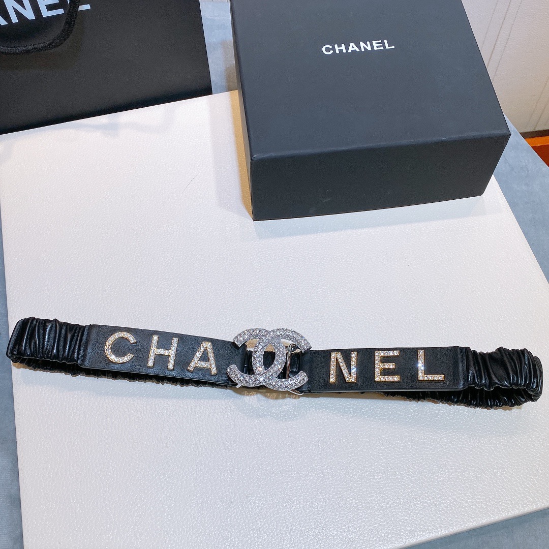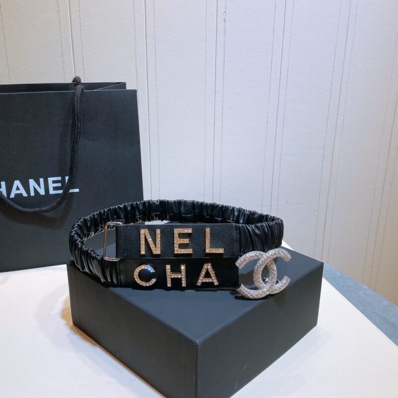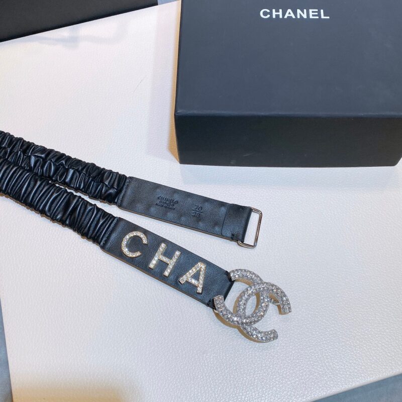 Chanel CC logo rhinestone gold metal buckle sheepskin elastic belt. Width: 3mm. Luxurious and elegant.