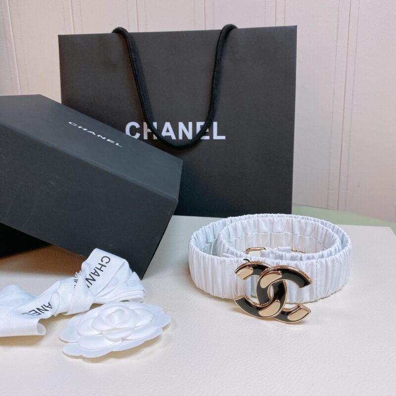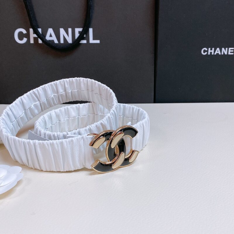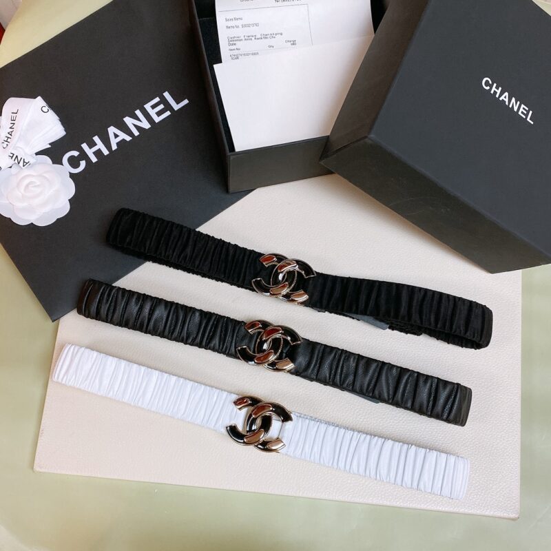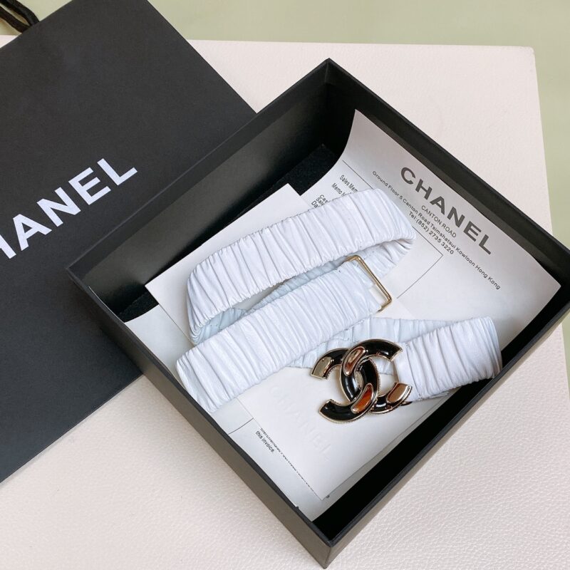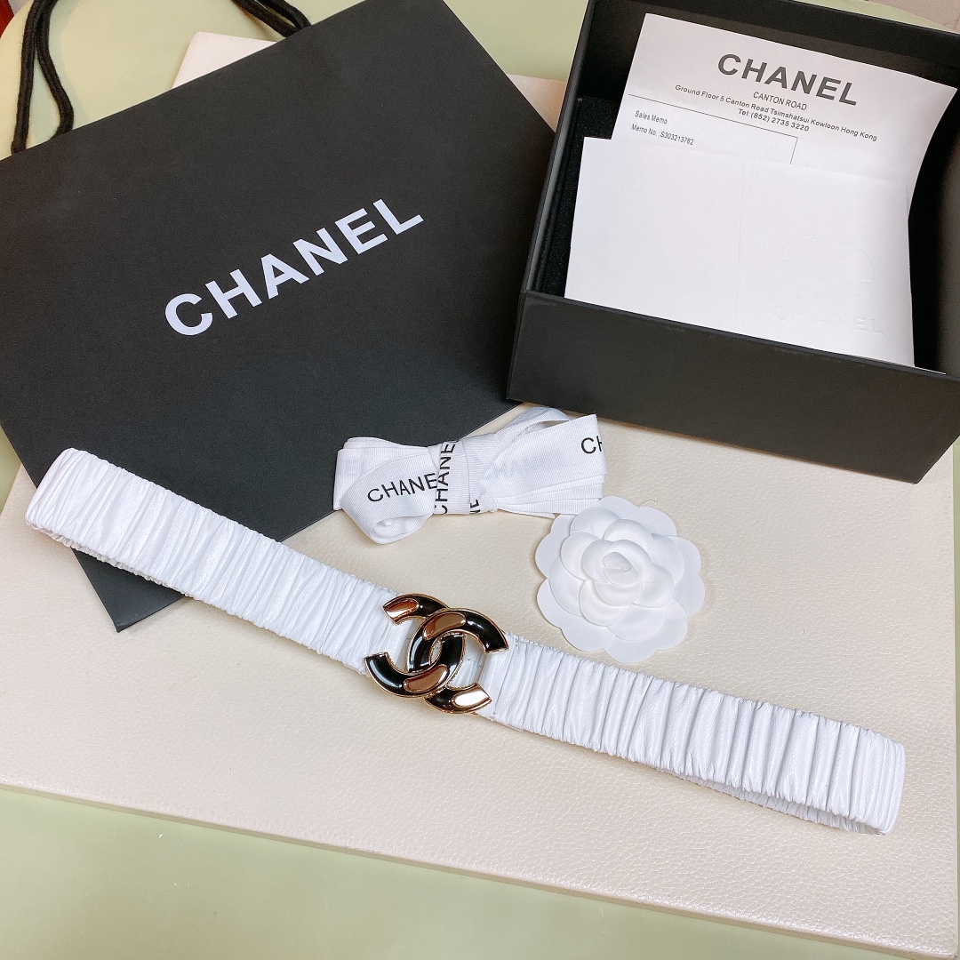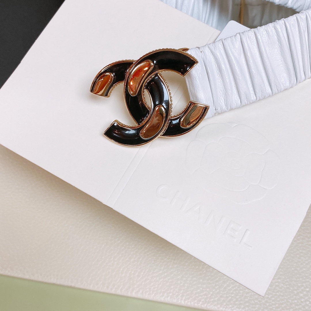 Chanel calfskin leather. Gold metal and precious resin. 3mm wide. Excellent elasticity and feel.