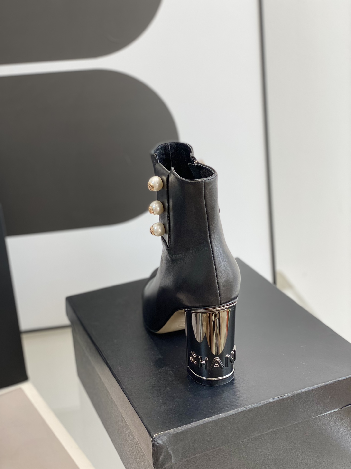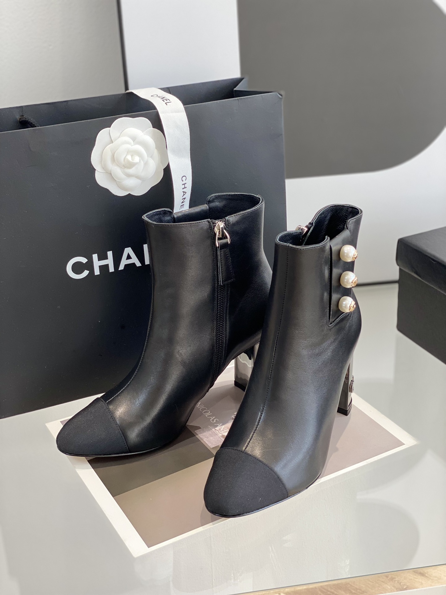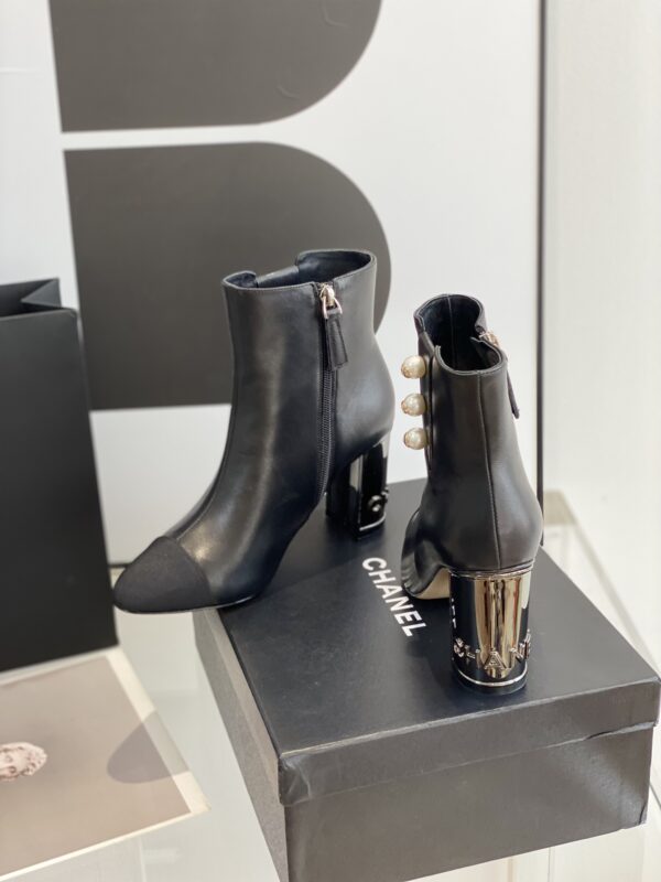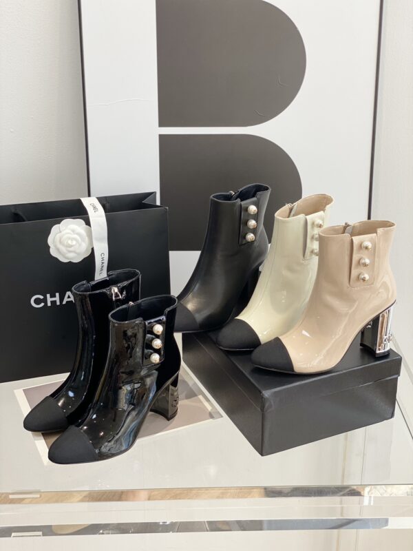 Chanel’s new patent leather high-heeled ankle boots Classic pearl buckle design. Cowhide patent leather upper, sheepskin inner padded feet, genuine leather outsole. Height: 8.5cmSize: 35-39 (34.40.41 customized)