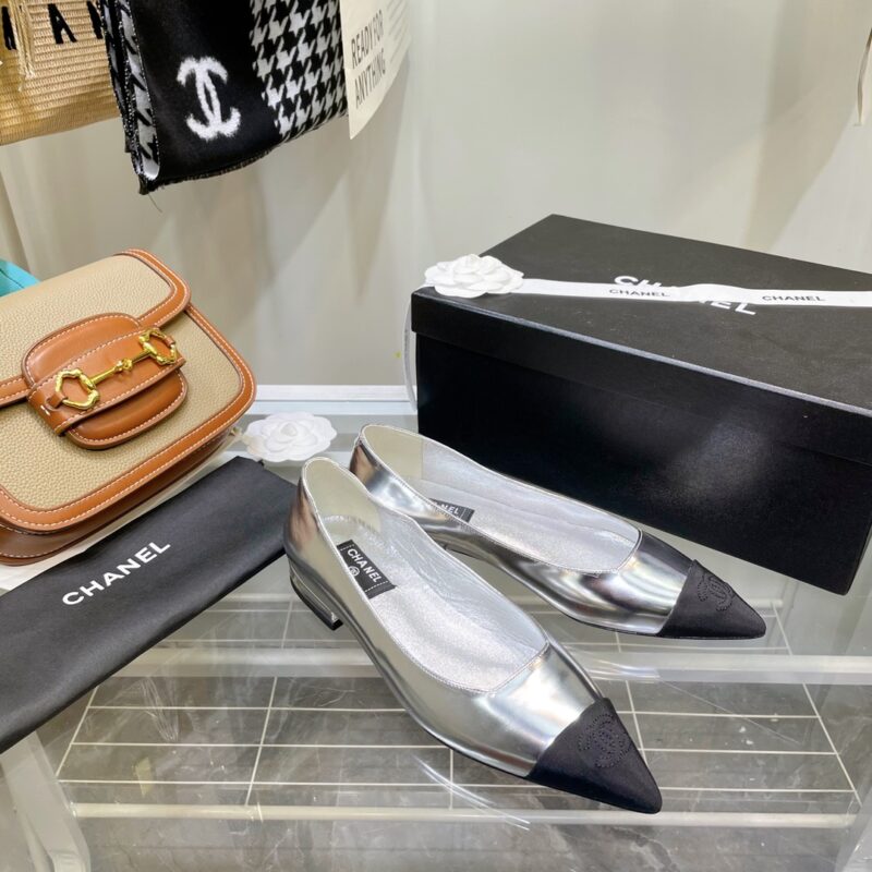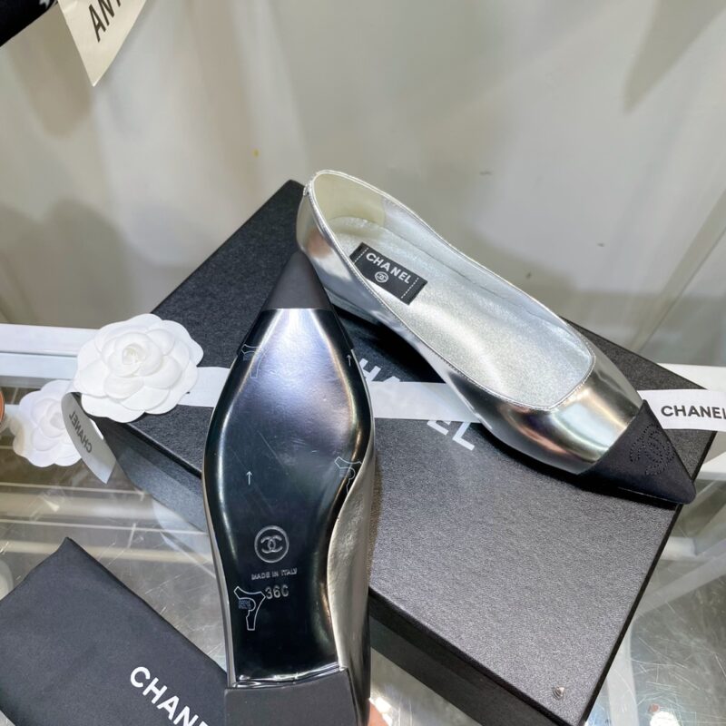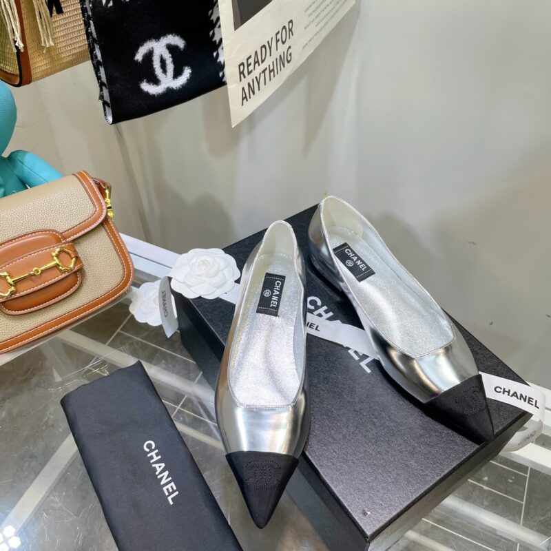Chanel 𝟐𝟎𝟐𝟐/𝐒𝐒 𝐧𝐞𝐰 fashion silver pointed toe flat shoes ……………………………………………… ꫛꫀꪝ Go➫ Material: ❶Material: Original cowhide/patent leather/metal cowhide. ❷Inner: imported sheepskin. ❸Sole: Italian imported leather outsole. ❹Packing: Full set of original box. ❺Size: 34/40 (34 40 customized non-refundable)