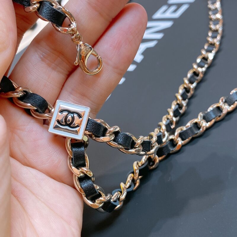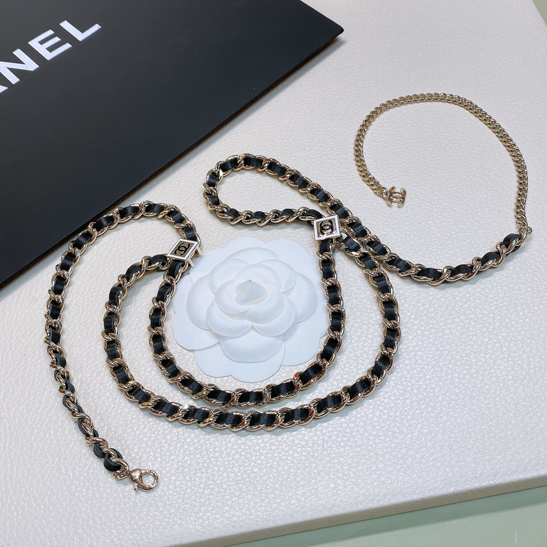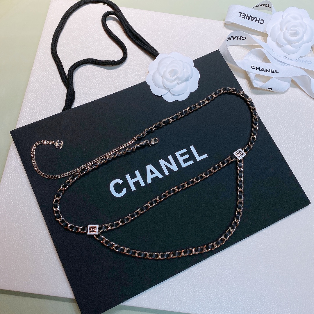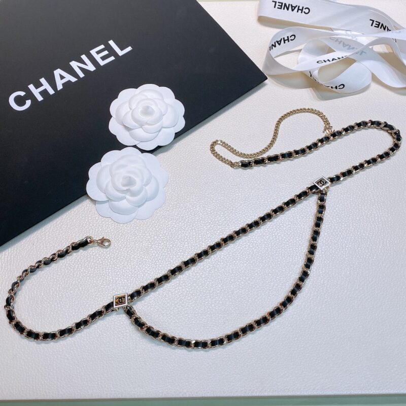 Chanel 2021 – Exquisite and delicate waist chains of metal and calfskin in gold, white and black. Catwalk model. 28087639