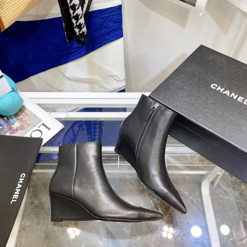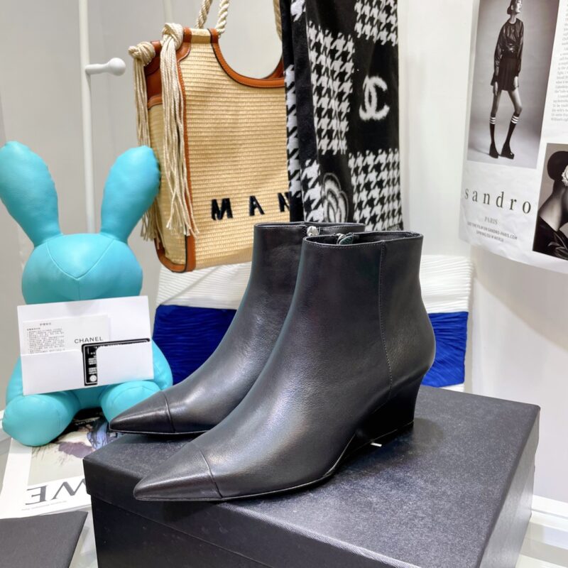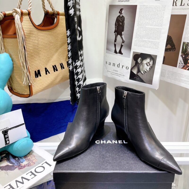 Chanel’s top quality—small wedge ankle bootsSmooth and elegant lines. The pointed toe design highlights the instep line. Stretching the leg line gives a sense of sight. The 5cm heel design meets the needs of women and is very easy to control. Fabric: top layer cowhide/patent leather. Water-dyed sheepskin inside. Outsole; leather outsole. Sizes: 35/40