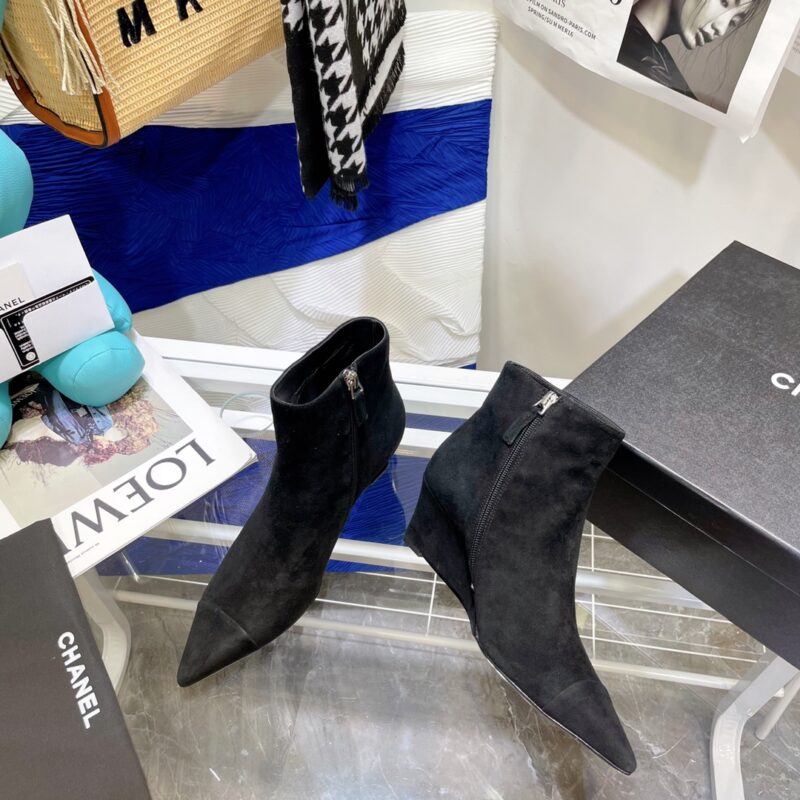Chanel’s top quality—small wedge ankle bootsSmooth and elegant lines. The pointed toe design highlights the instep line. Stretching the leg line gives a sense of sight. The 5cm heel design meets the needs of women and is very easy to control. Fabric: top layer cowhide/patent leather water-dyed sheepskin inside. Outsole; leather outsole Sizes: 35/40