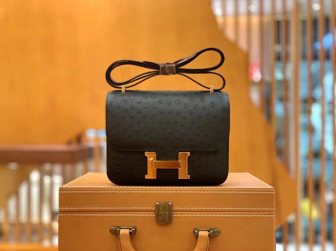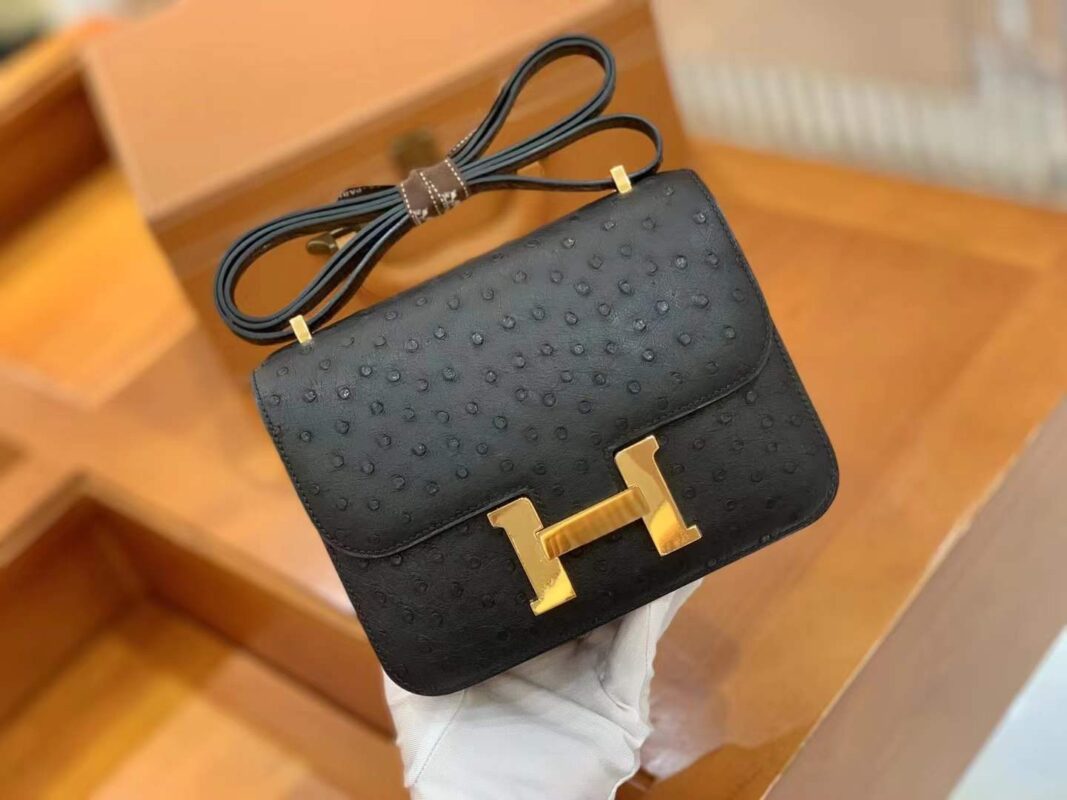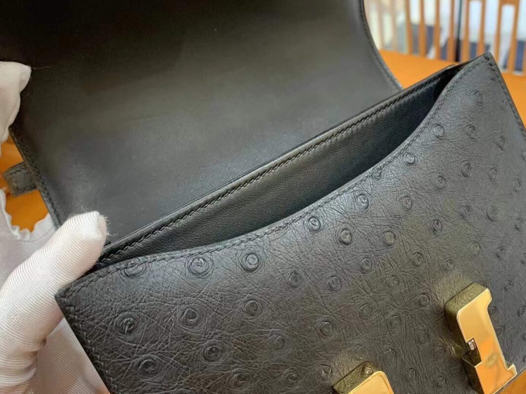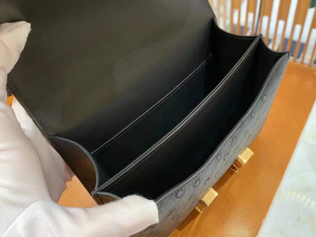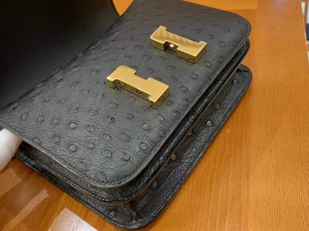 Constance 18cm Classic Black Gold Imported South African KK grade ostrich leather. Hand-sewn