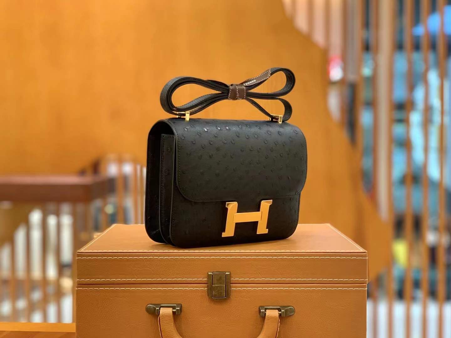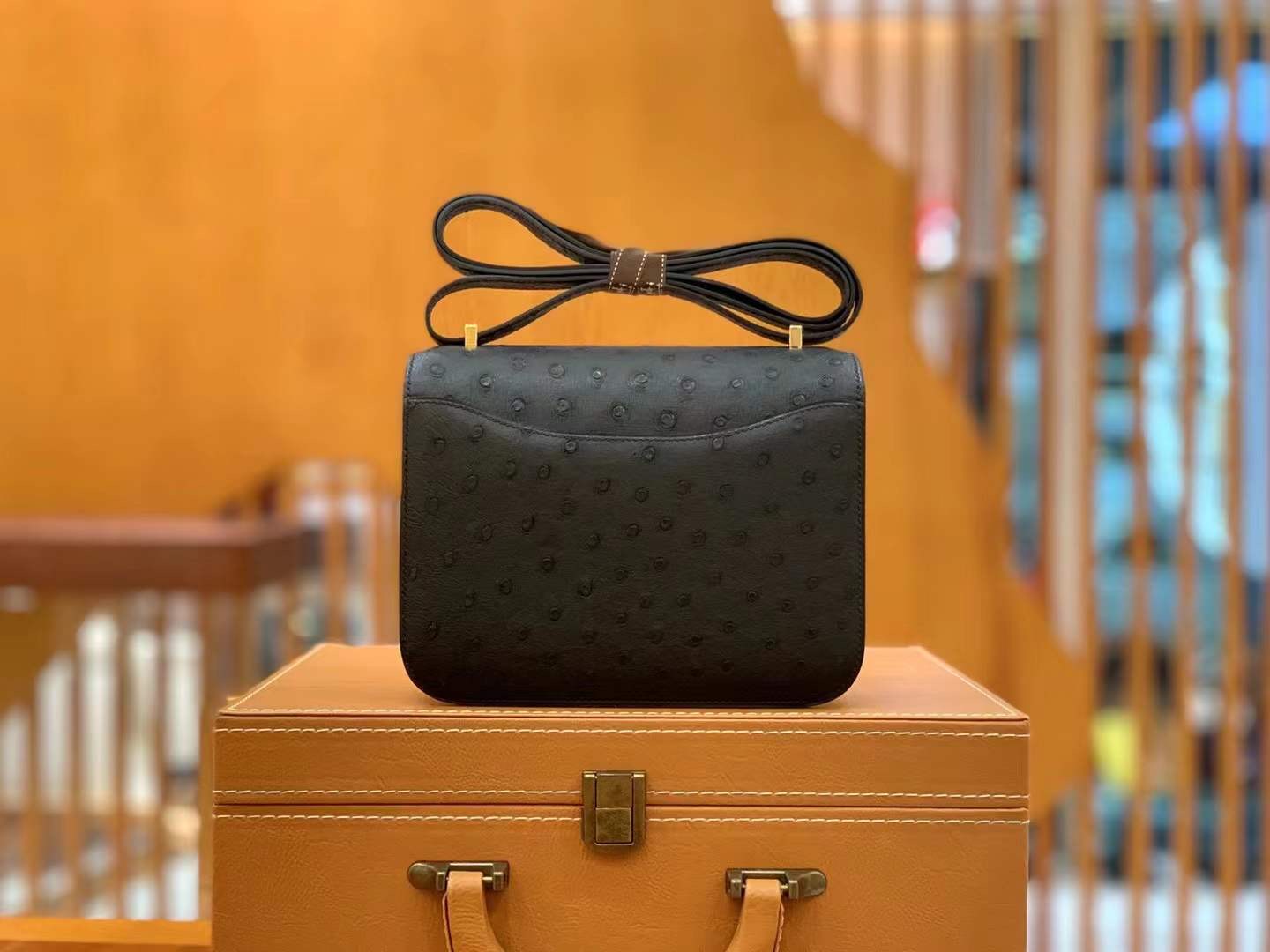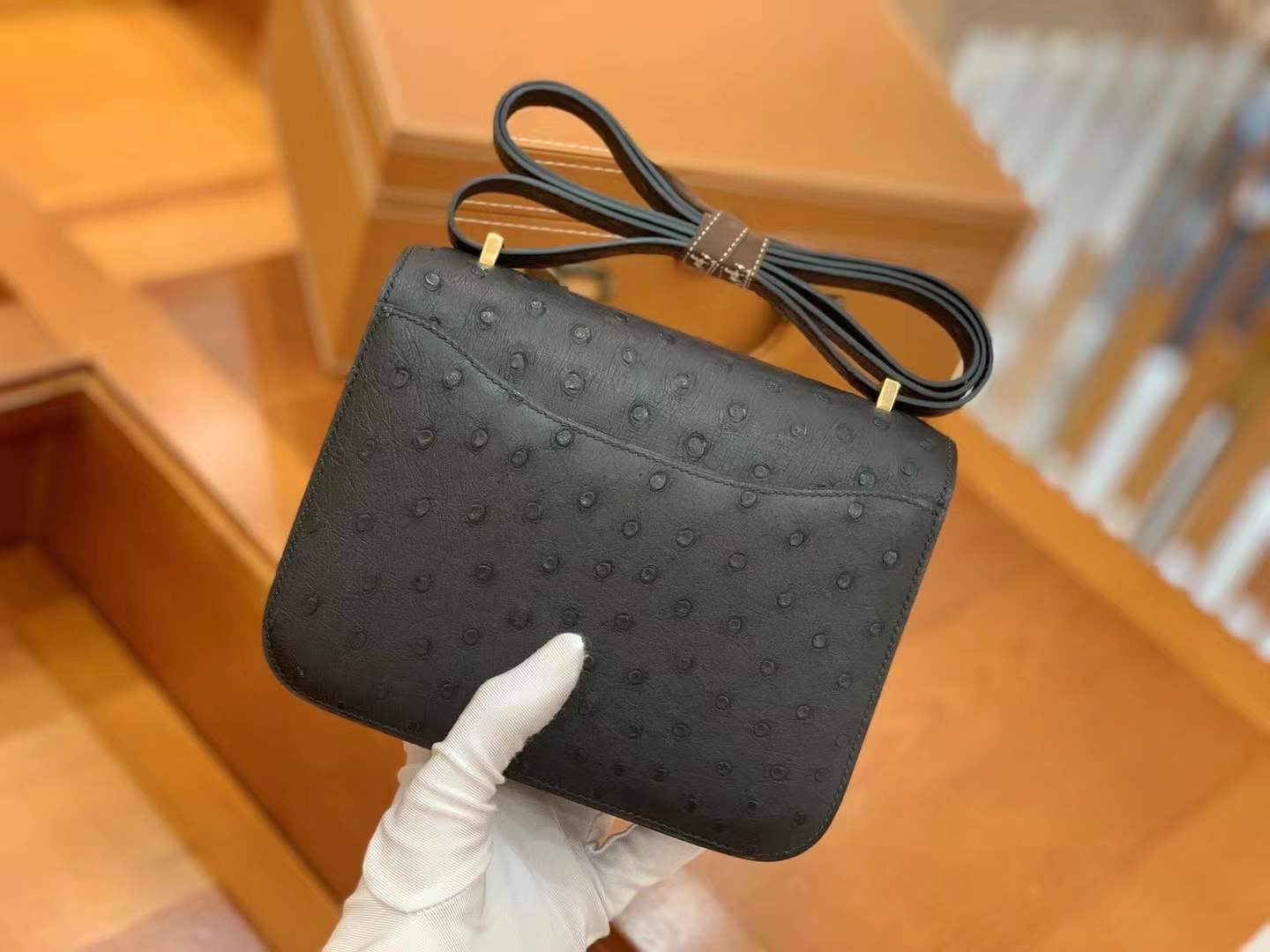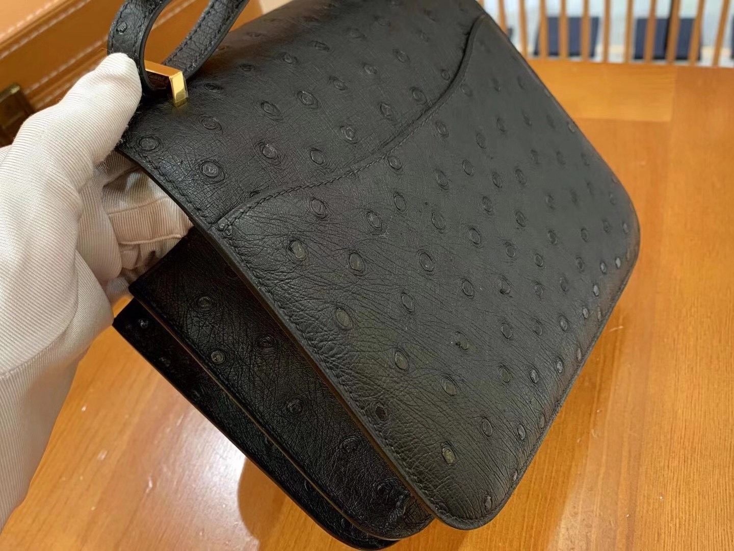 Constance 18cm Classic Black Gold Imported South African KK grade ostrich leather. Hand-sewn