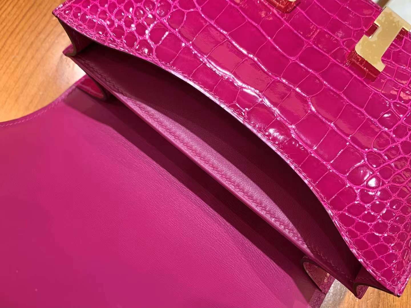 Constance 18cm Glossy Alligator leather. Pink. Gold Buckle