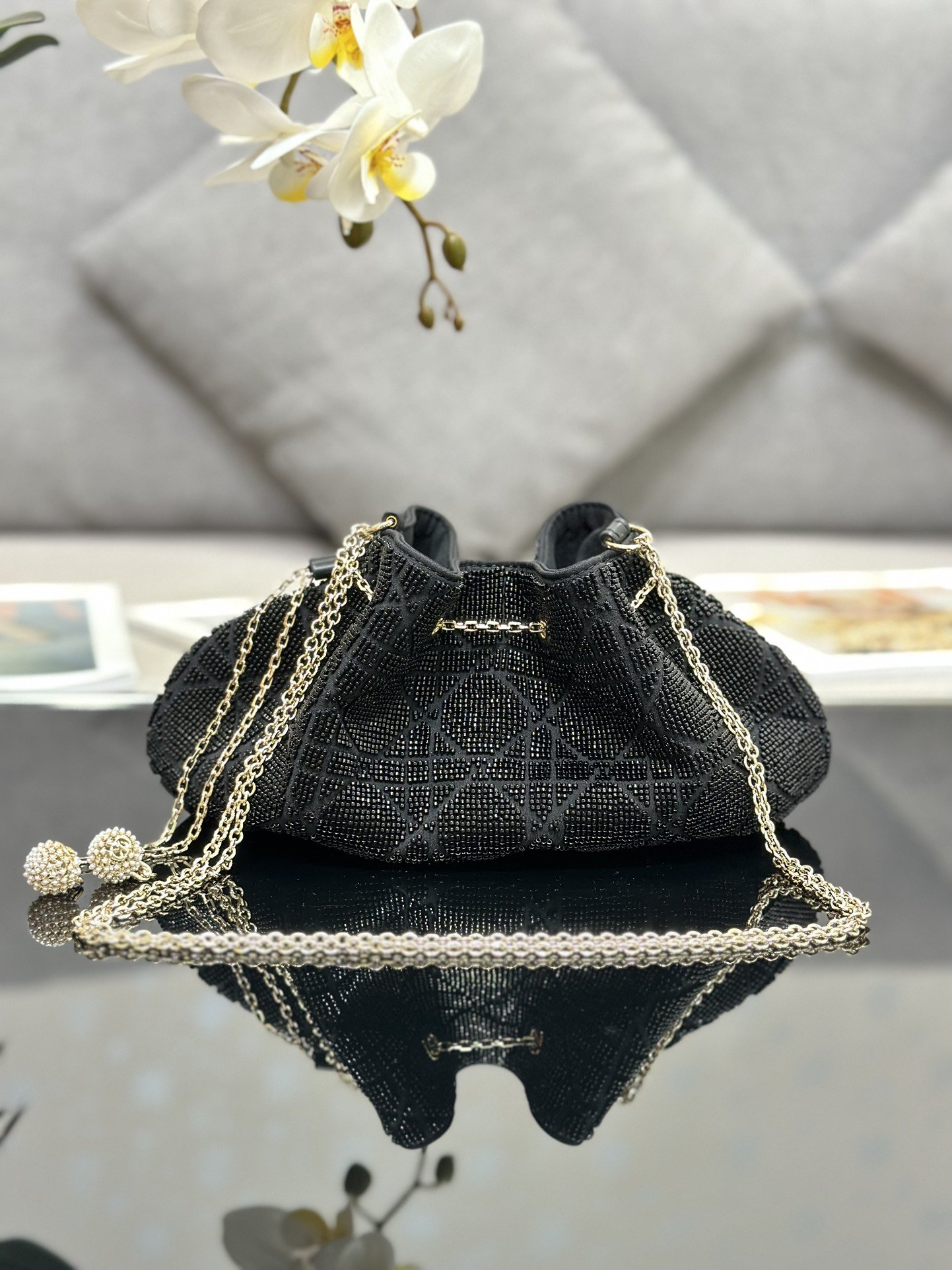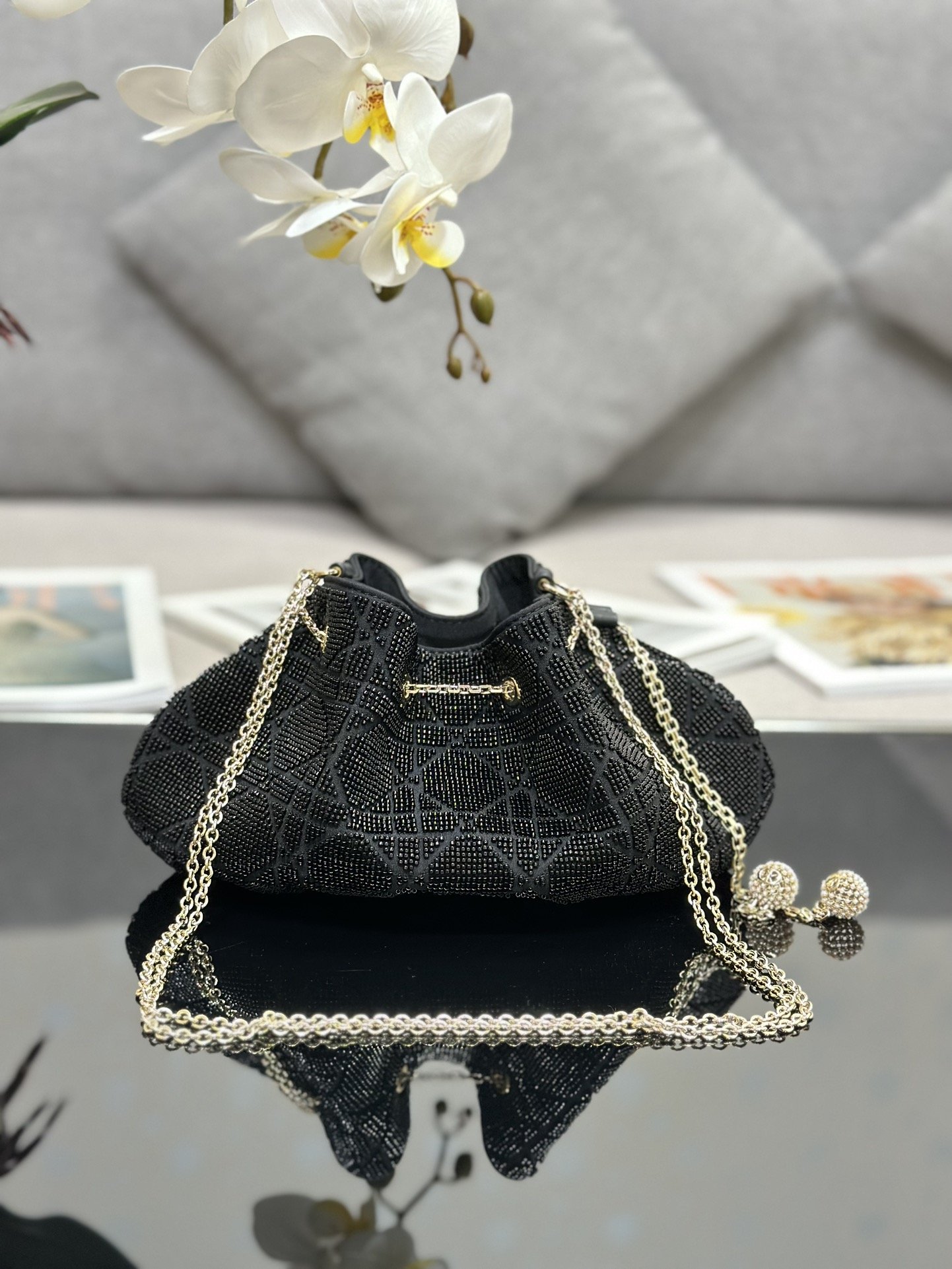 Dior Dream drawstring bead tube black, is a new summer product in 2023, exquisite and elegant. Crafted from cotton, it features a classic cannage pattern, hand-embroidered with 2mm glass beads. The chain closure adds sophistication, with beaded CD logo detailing and double chain shoulder straps to elevate it with a variety of elegant evening looks. Dimensions: 26 x 14 x 11 cm