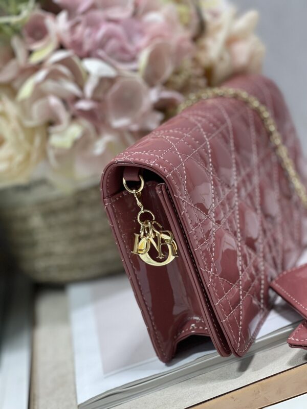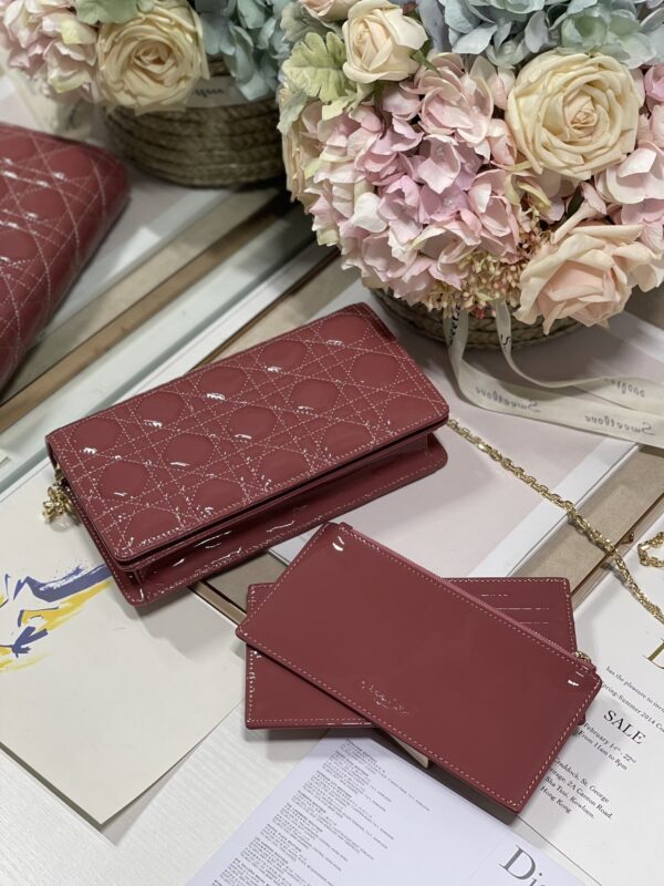 Dior clutch bag. Uniquely crafted in burgundy patent calfskin, the Lady Dior clutch features signature cannage topstitching and a detachable “D.I.O.R.” charm. With detachable chain shoulder strap, and detachable card holder and zipper pouch, can be used alone. This eye-catching clutch is designed to be teamed with other pieces from the collection.