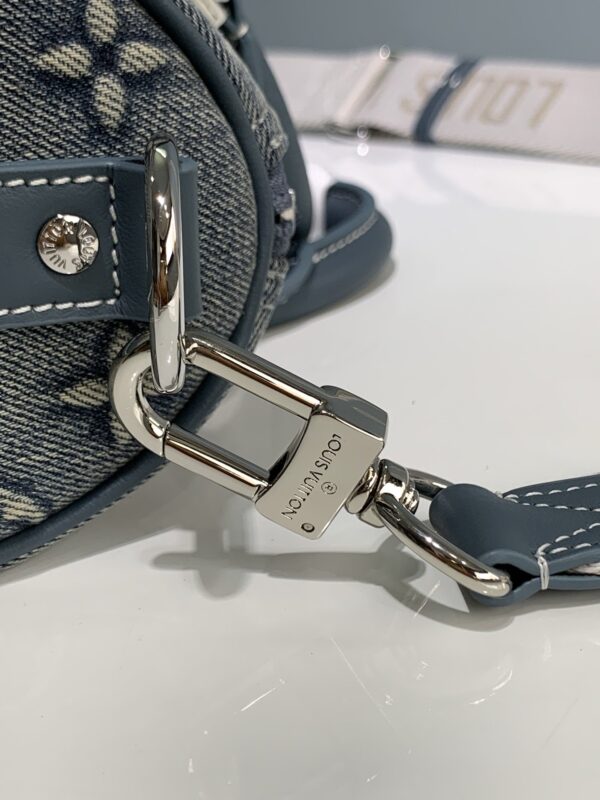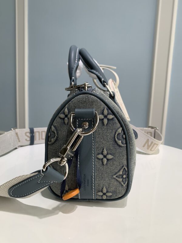 This Keepall Bandoulière 25 handbag shows the vintage texture of Monogram Washed Demin canvas. The Monogram pattern is outlined by embossing and hand-painting successively, as if wearing faded denim that has been baptized by time.