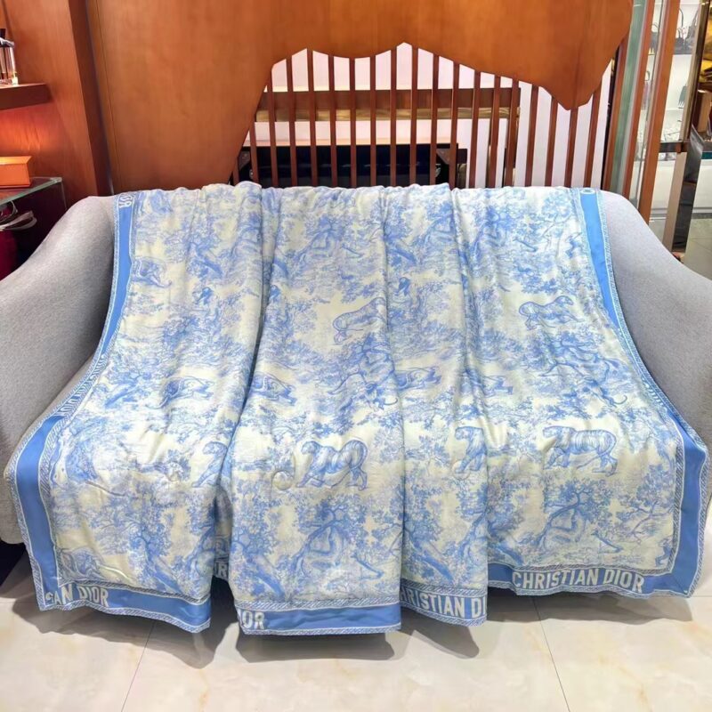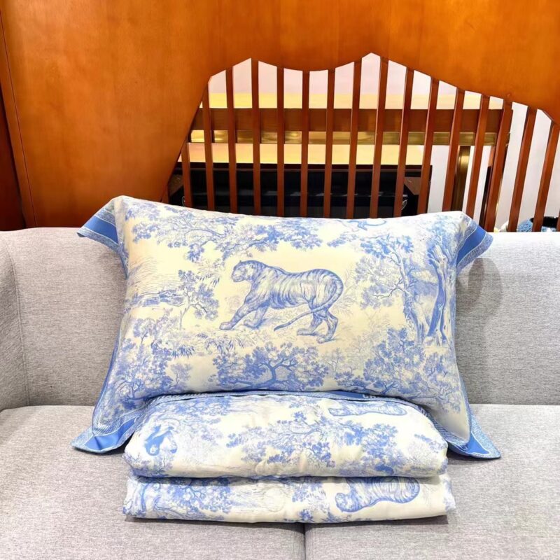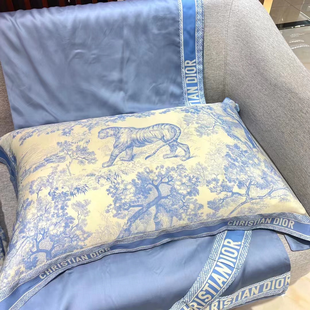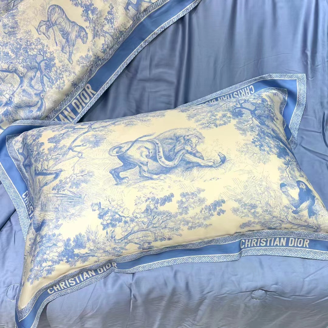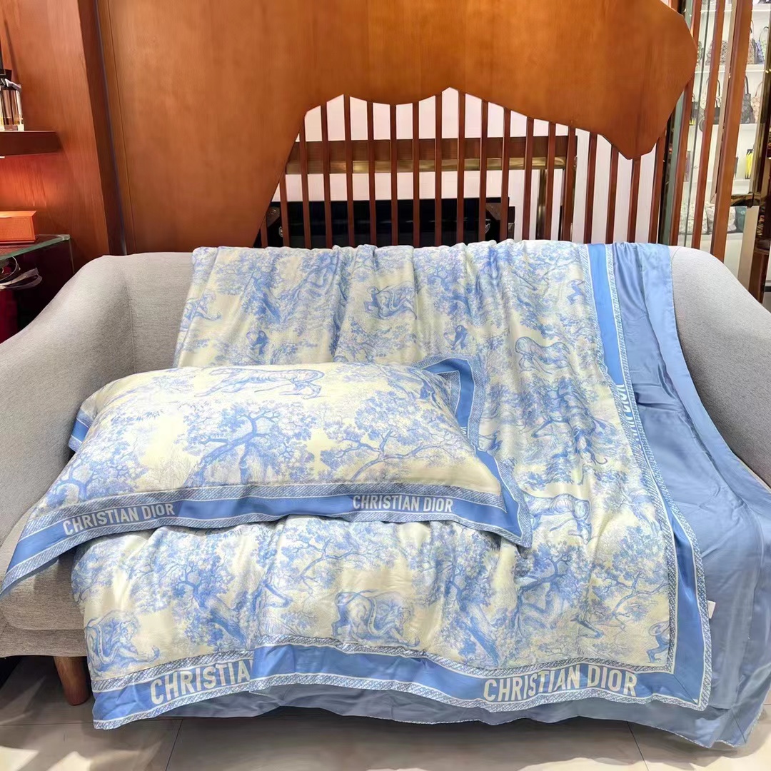 Sky Blue | Dior Classic Series Lyocell Tencel Air Conditioning Quilt -Material: 100% Lyocell Tencel. Softer than silk, better moisture absorption than cotton, machine washable -Filling: 80% feather velvet + 20% mulberry silk, the silk is long and delicate, and the touch is moist Weight: filling 500g total weight 1800g. Craftsmanship: Italian 3D digital inkjet printing, bed sheet digital inkjet welting process. Washing: machine wash, not drying, not exposure Size: Large 220*240cm Standard 200*230cm Matching four-piece suit