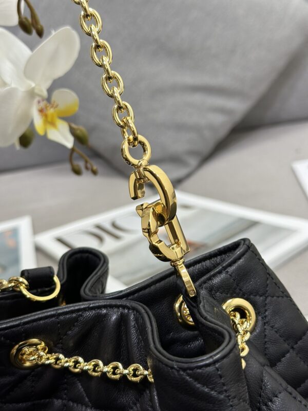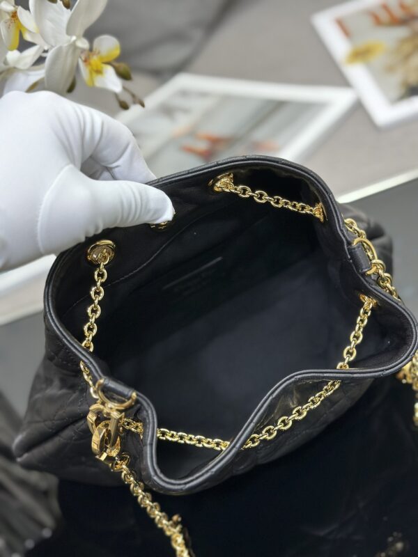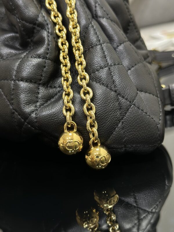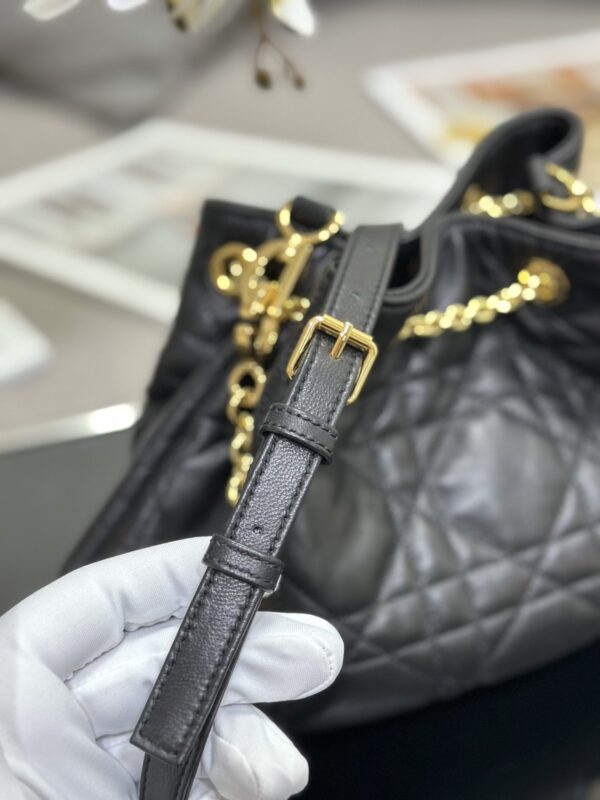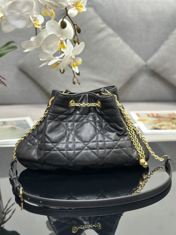 Dior Ammi Medium Drawstring Bag is a new summer product, showing an elegant and classic style. Meticulously crafted in lambskin, it’s enhanced with oversized cannage topstitching and has a curb chain closure for refined, utilitarian style. The medium model features a shoulder strap with CD initials and a leather strap that can be worn cross-body for a comfortable look. Dimensions: 31 x 18 x 13 cm