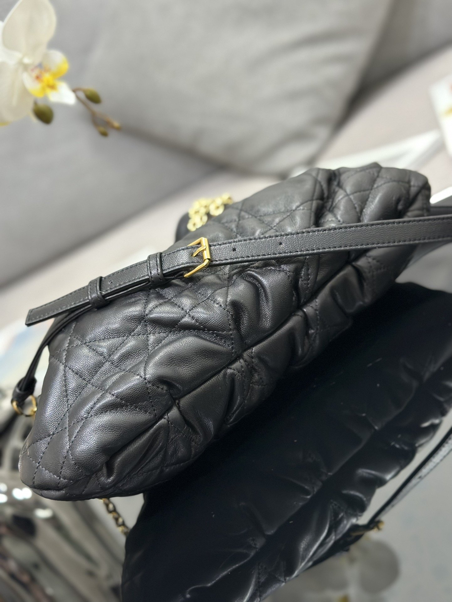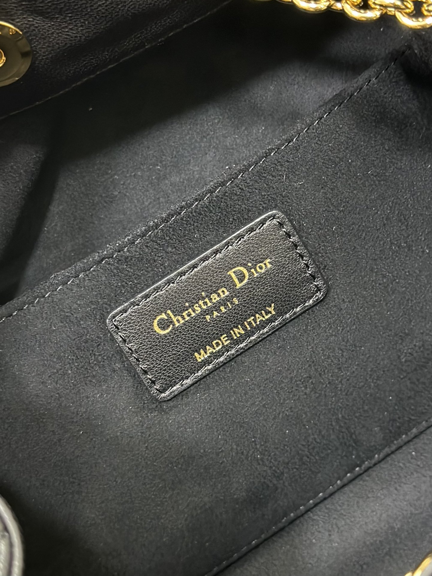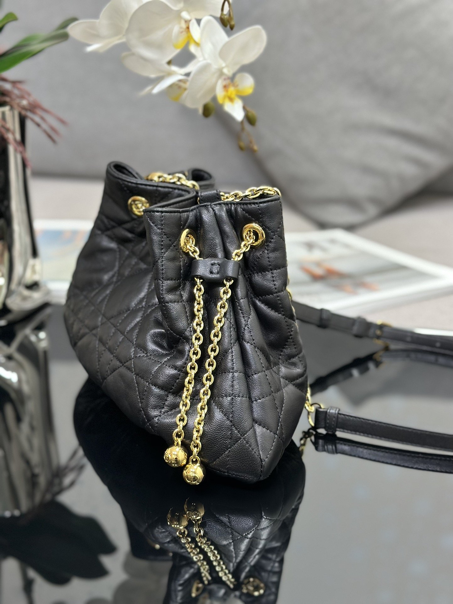 Dior Ammi Medium Drawstring Bag is a new summer product, showing an elegant and classic style. Meticulously crafted in lambskin, it’s enhanced with oversized cannage topstitching and has a curb chain closure for refined, utilitarian style. The medium model features a shoulder strap with CD initials and a leather strap that can be worn cross-body for a comfortable look. Dimensions: 31 x 18 x 13 cm