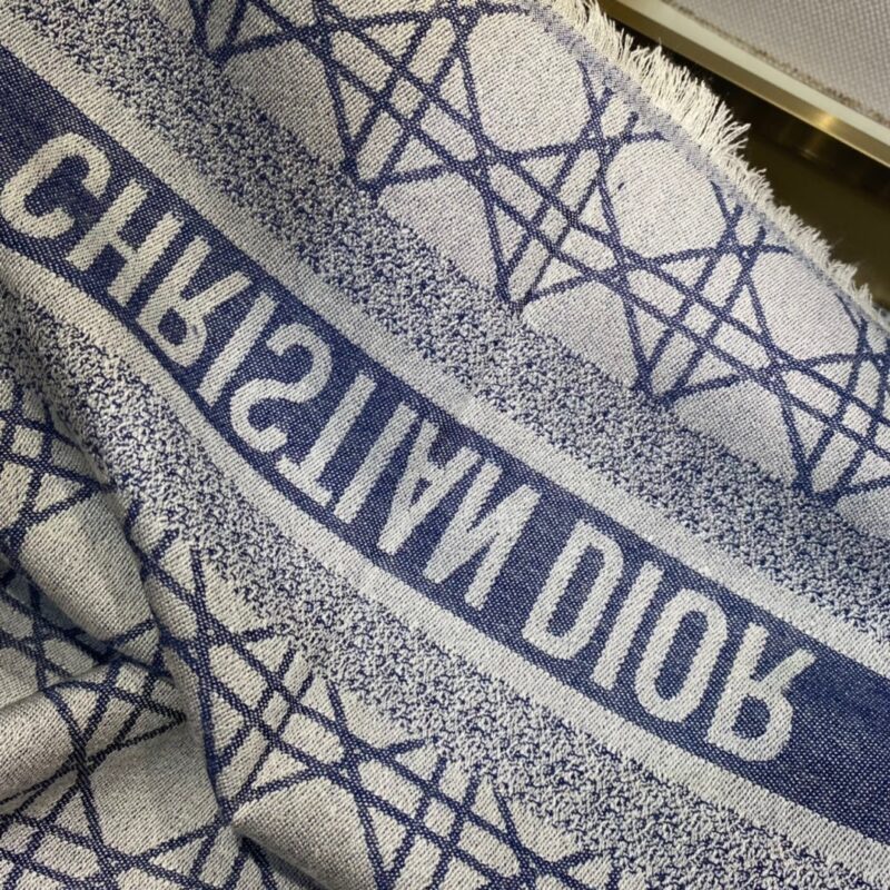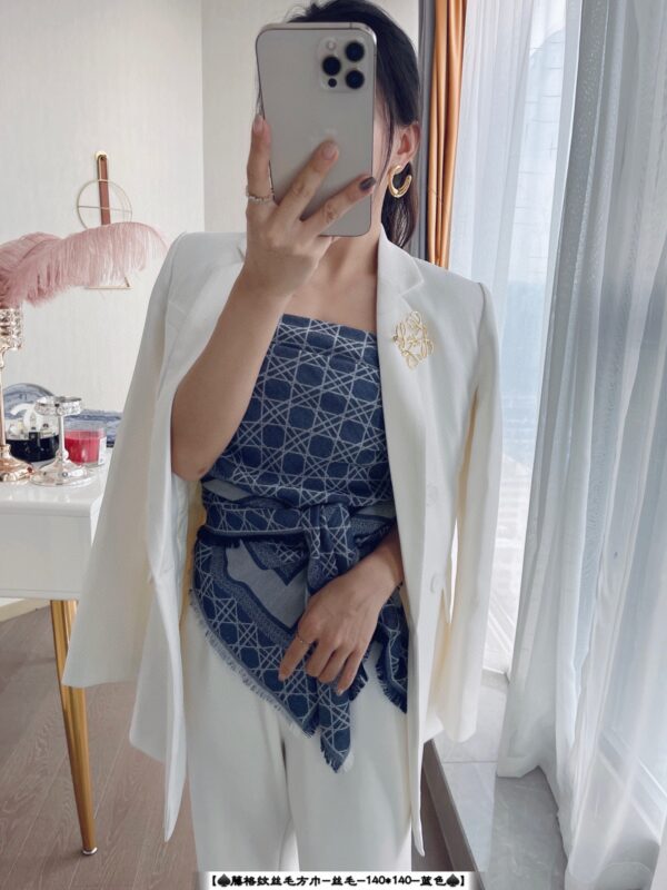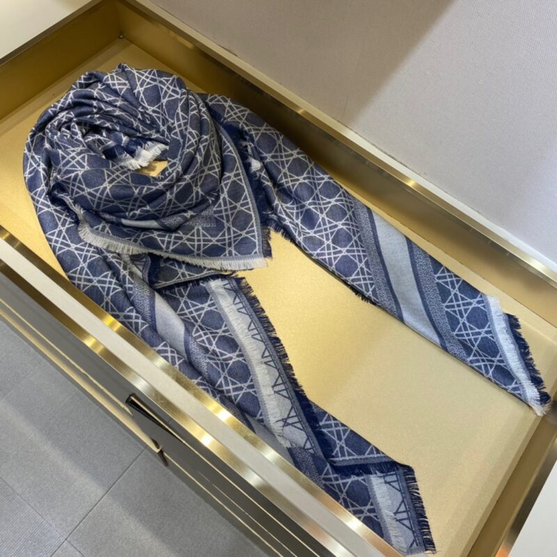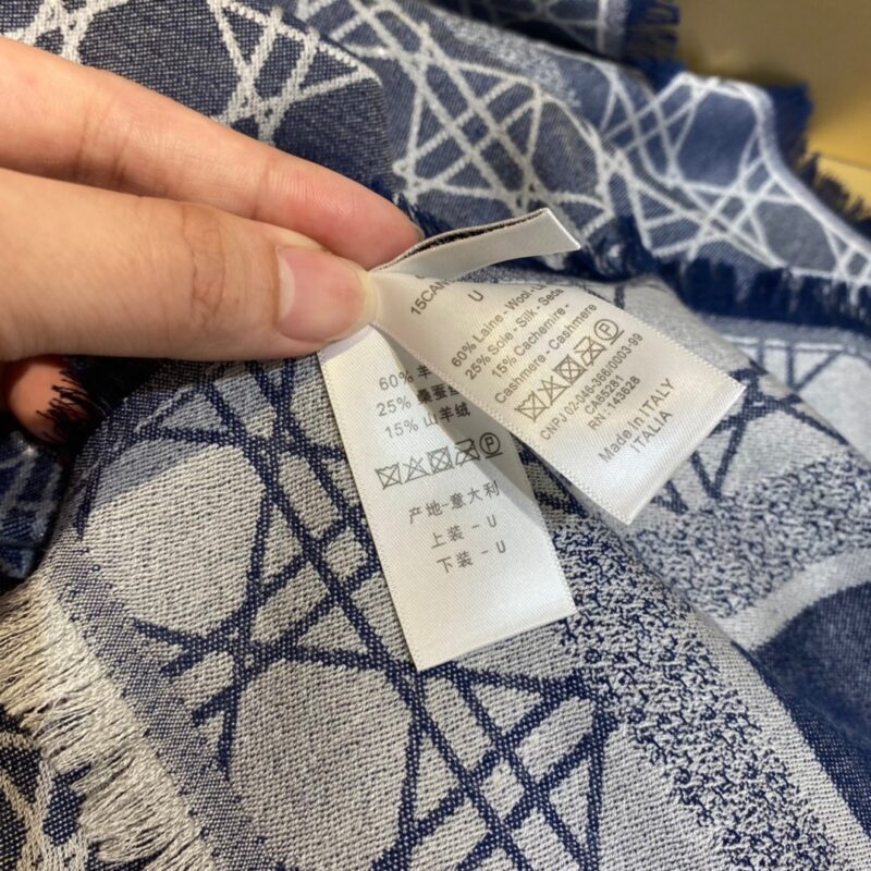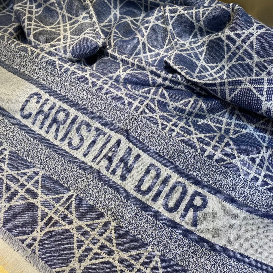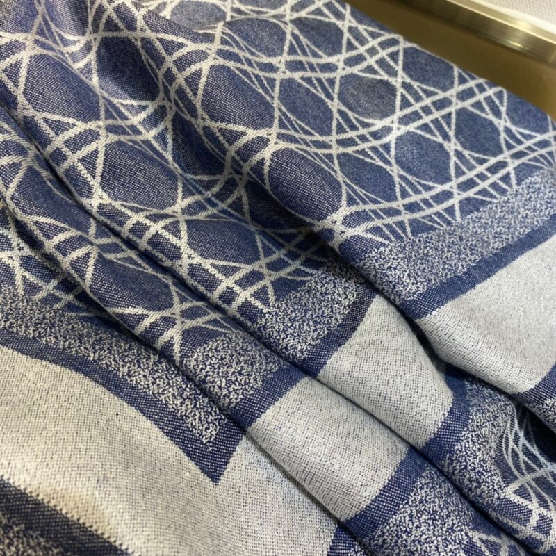 Dior cannage silk scarf. 140*140cm. 65% wool 25% silk15 % cashmere The Dior Cannage shawl reinterprets the iconic cannage pattern in a sleek, timeless denim blue. Crafted from a lightweight wool, mulberry silk and cashmere blend with fringe and a contrasting ‘CHRISTIAN DIOR’ signature jacquard stripe pattern. Can be tied around the neck or draped over the shoulders.