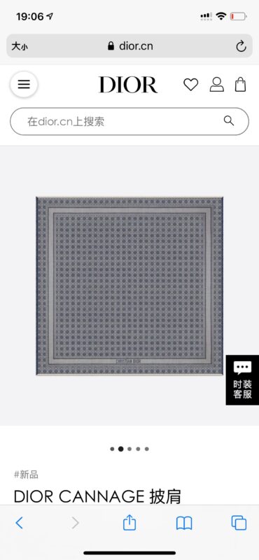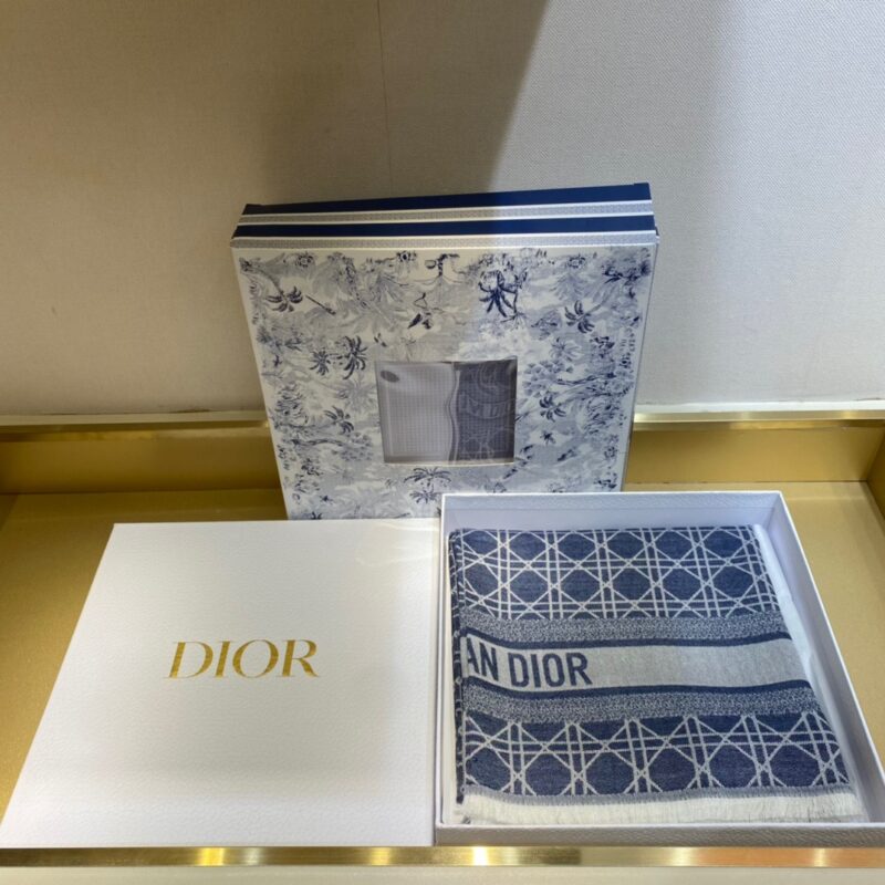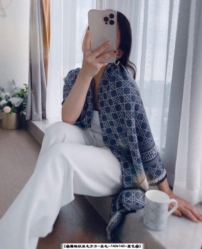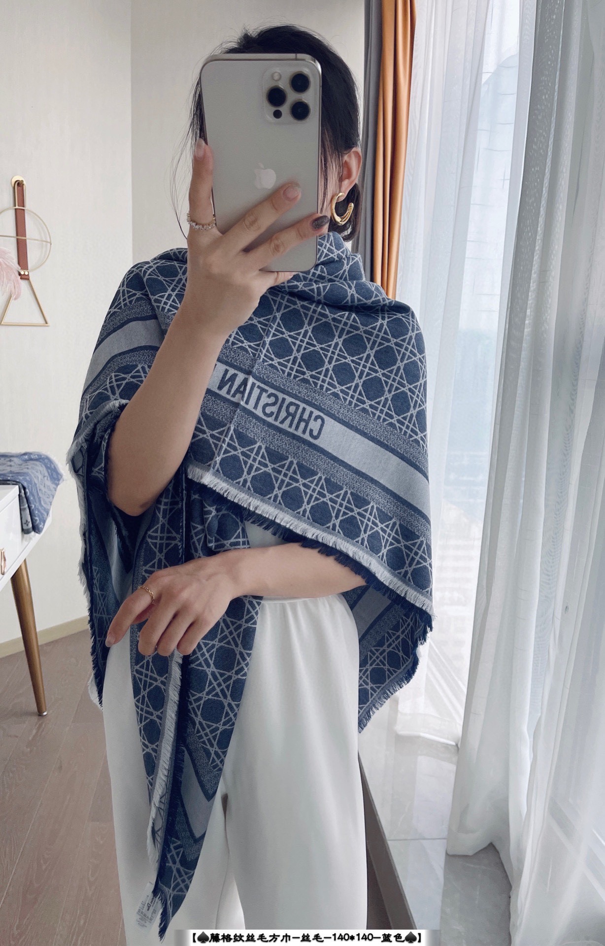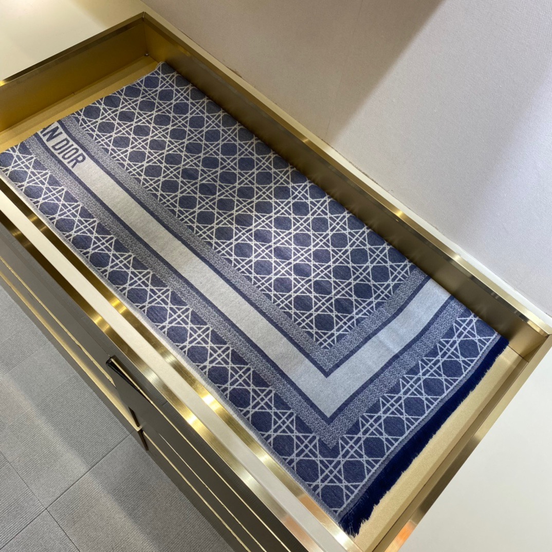 Dior cannage silk scarf. 140*140cm. 65% wool 25% silk15 % cashmere The Dior Cannage shawl reinterprets the iconic cannage pattern in a sleek, timeless denim blue. Crafted from a lightweight wool, mulberry silk and cashmere blend with fringe and a contrasting ‘CHRISTIAN DIOR’ signature jacquard stripe pattern. Can be tied around the neck or draped over the shoulders.