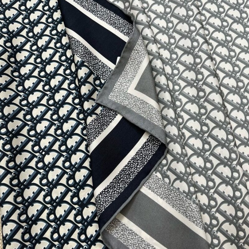 This Diortwin square scarf features a two-tone, double-sided design, paying tribute to the iconic. Oblique print. Carefully crafted from mulberry silk twill fabric, with hand-stitched topstitching, one side is gray and the other side is navy blue, both decorated with the same-tone “CHRISTIAN DIOR” logo jacquard stripe pattern. It can be tied around the neck or used as a headscarf to create an overall look full of Dior style. 034654