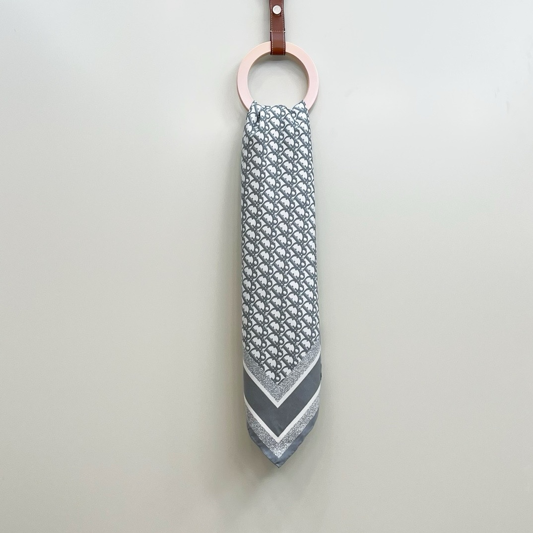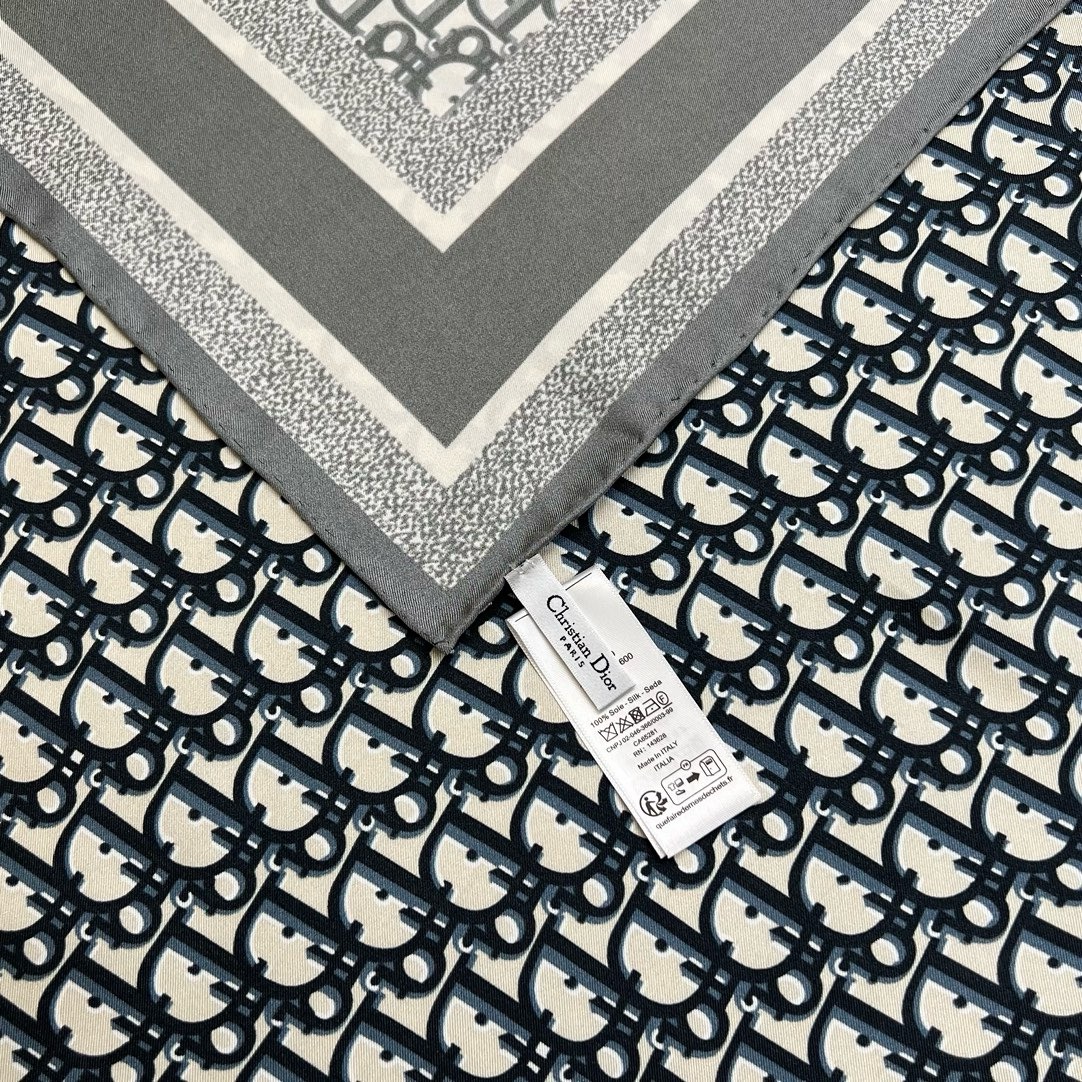 This Diortwin square scarf features a two-tone, double-sided design, paying tribute to the iconic. Oblique print. Carefully crafted from mulberry silk twill fabric, with hand-stitched topstitching, one side is gray and the other side is navy blue, both decorated with the same-tone “CHRISTIAN DIOR” logo jacquard stripe pattern. It can be tied around the neck or used as a headscarf to create an overall look full of Dior style. 034654