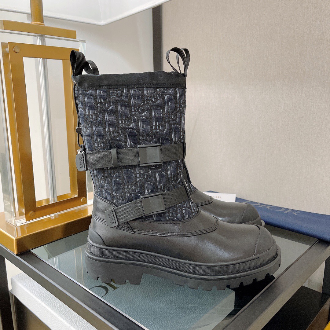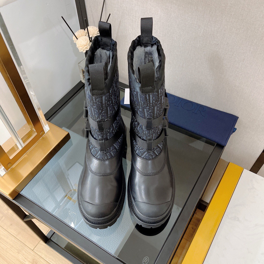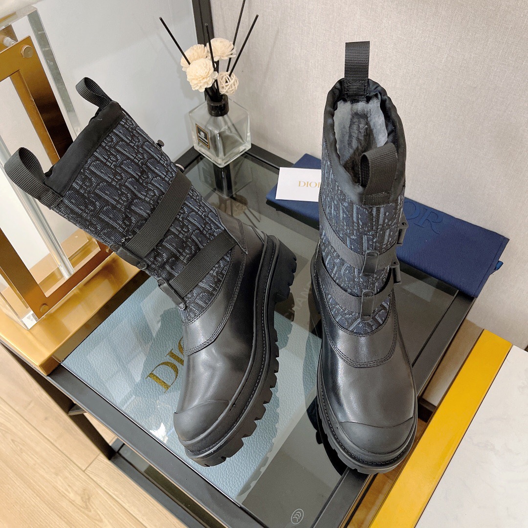 Dior Explorer Lace-up Wool Boots Crafted from black calfskin, these Dior Explorer ankle boots feature beige and black Oblique print panels on the sides. Fully lined in wool for a comfortable fit. Finished with a Dior logo patch, it is finished with a notched rubber sole and a tonal reinforced rubber toe cap for added sophistication. Wear it with everything this season for a stylish look. Upper: cowhide/jacquard Lining: wool lining Size: 35-39 (40/41 customized non-refundable)