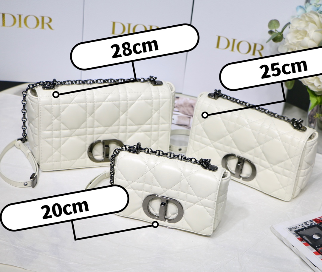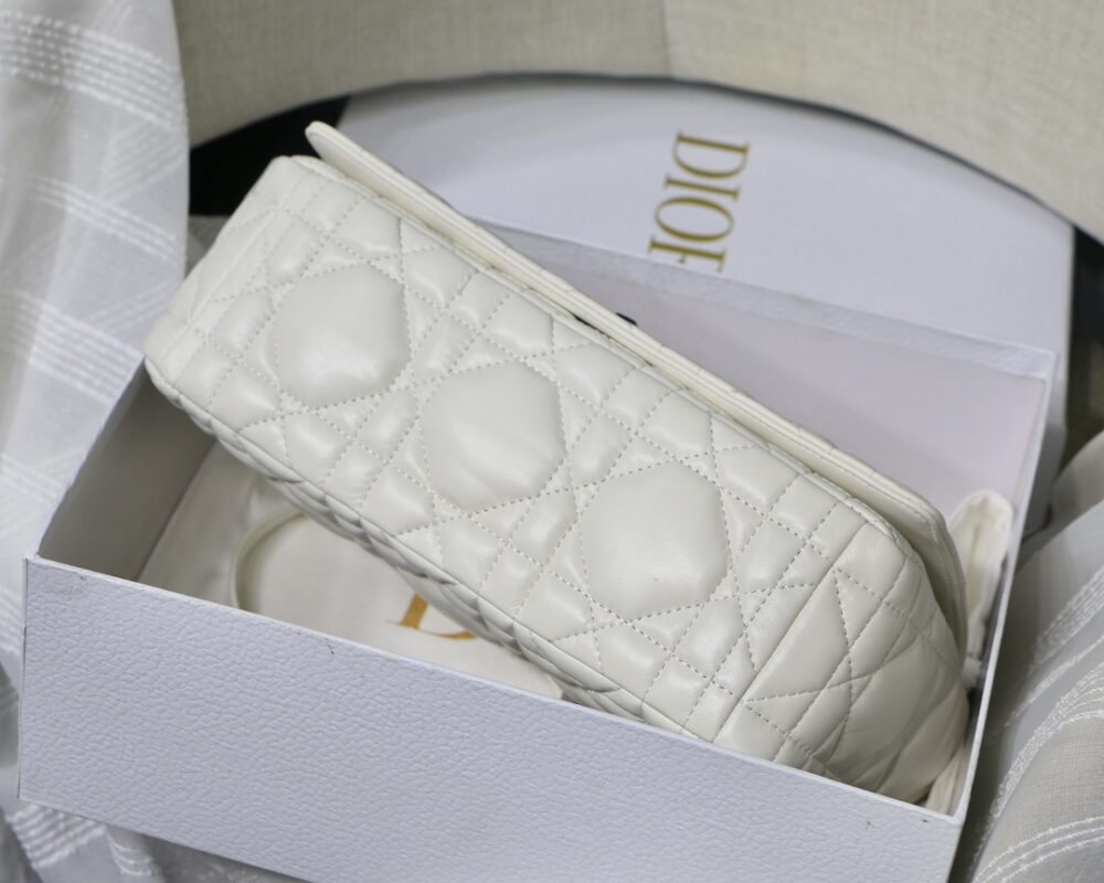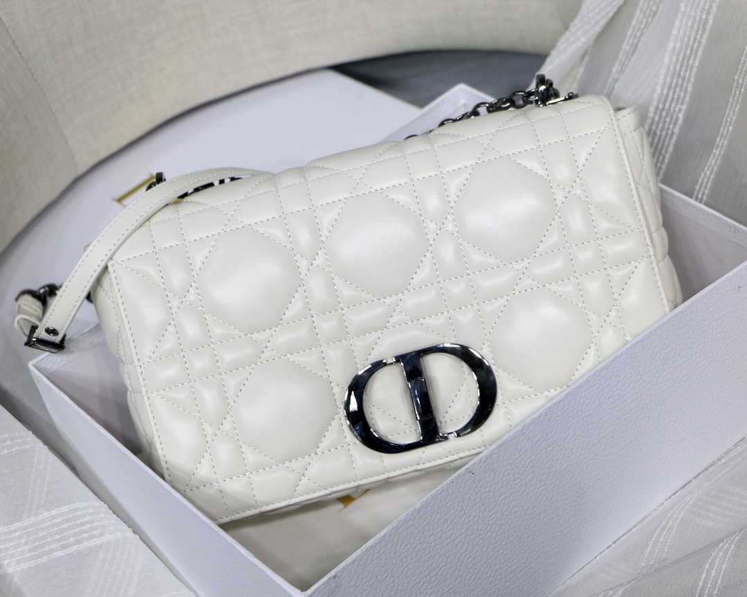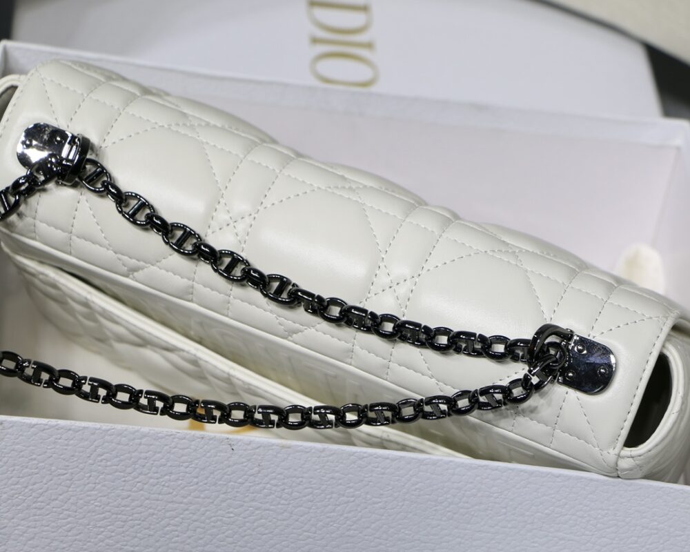 Large Dior Caro Rattan Plaid Series M8016 Milk white The Caro bag combines elegance and modernity. Crafted in supple calfskin, it’s finished with cannage topstitching. The flap is finished with a metal “CD” clasp with antiqued gold finish, inspired by the closure of a Christian Dior perfume bottle. Mini shape with a detachable and adjustable chain shoulder strap for day or evening looks. Large size: 28x 17x 9cm Holds AirPods Pro, lipstick and keys.