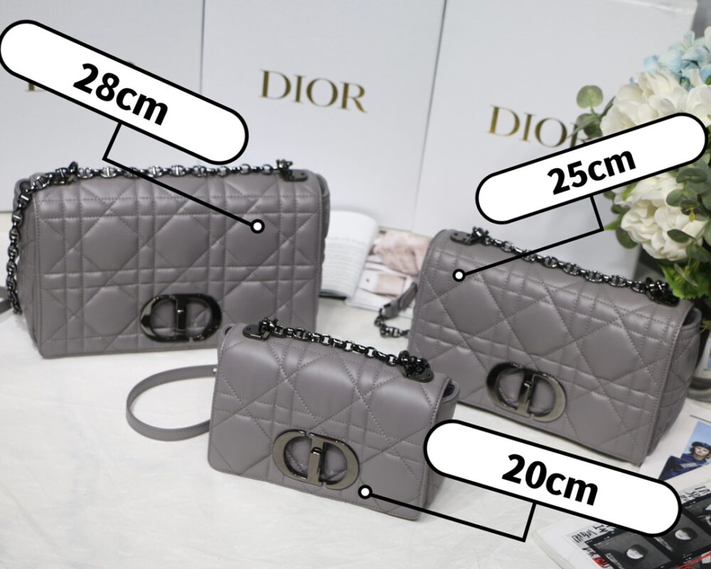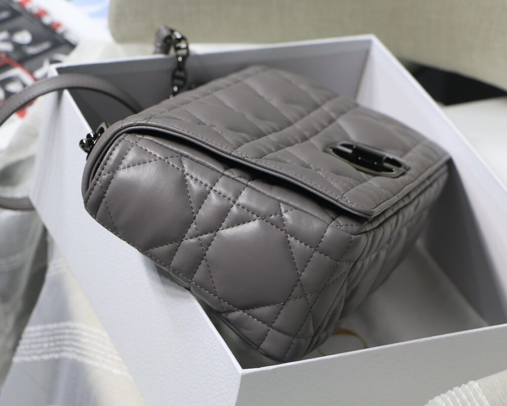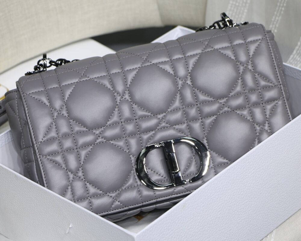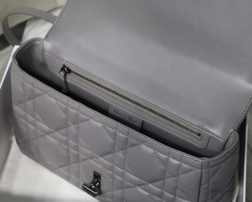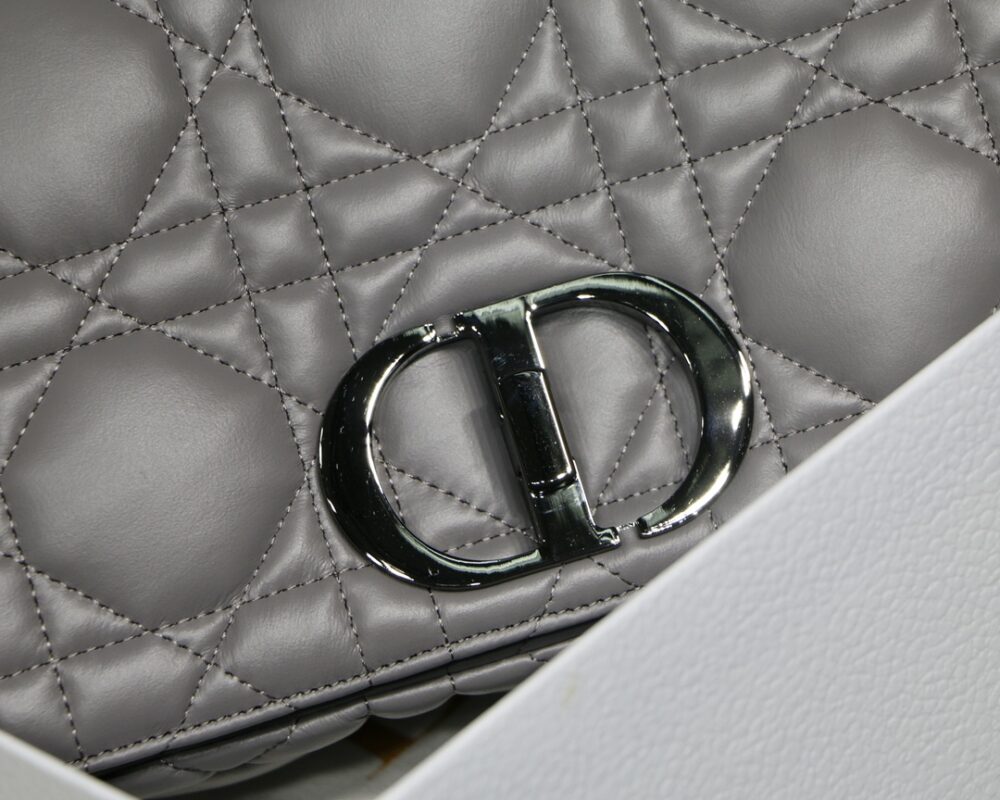 Dior Grey Caro Large Rattan Plaid Series The Caro bag combines elegance and modernity. Meticulously crafted from calfskin, it features an original quilted-effect oversized cannage topstitching for a distinctive look. The flap is decorated with a metal clad knob “CD” clasp, inspired by the closure of a perfume bottle, with a detachable “CD” logo chain shoulder strap, which can be carried by hand or on the shoulder, or can be replaced with a wide shoulder strap embroidered with D for everyday looks or evening ensembles.Large size: 28x 17x 9cm